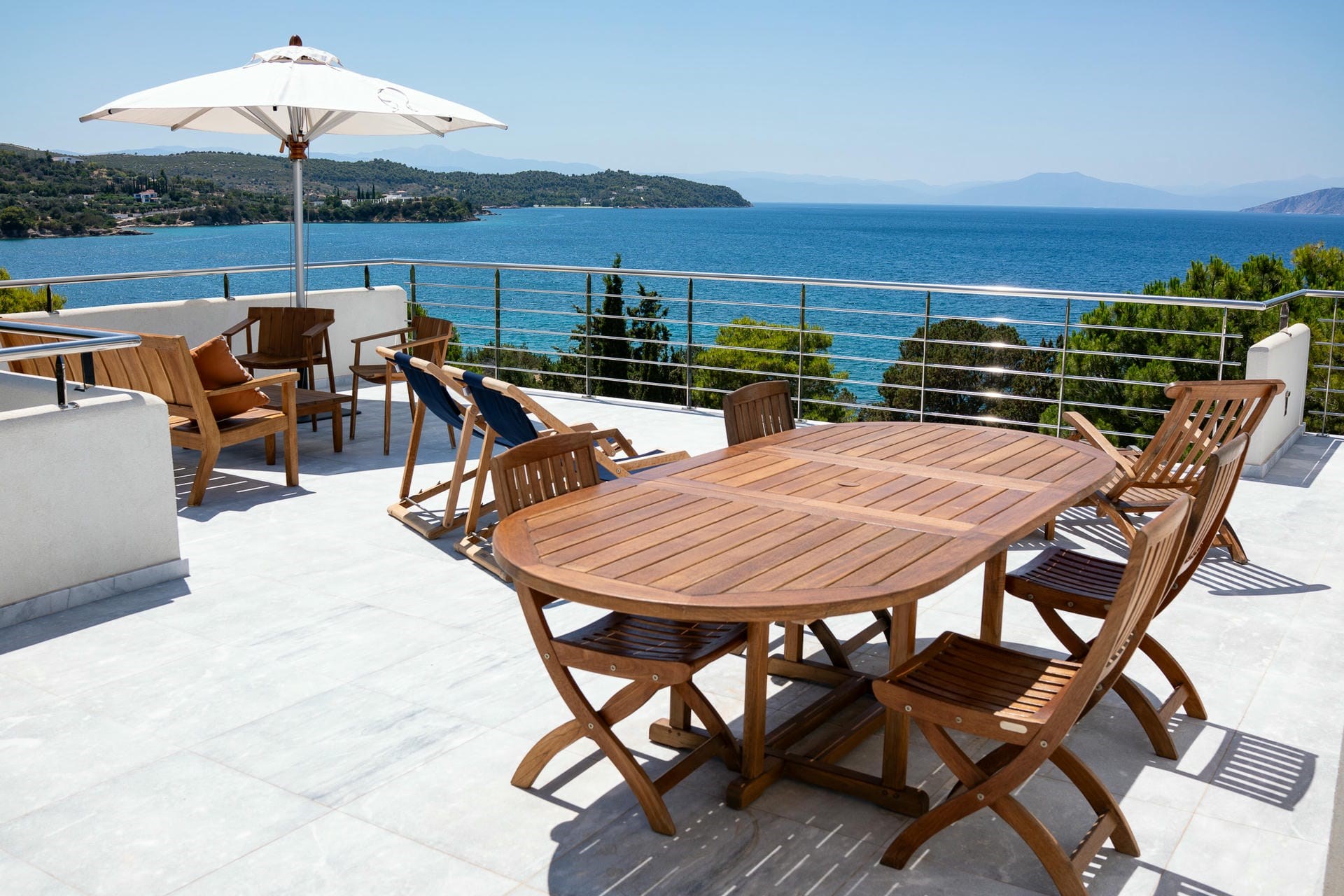 An open terrace on the first floor features more outdoor seating and a second al fresco dining area. The terrace offers an idyllic spot to take in the panoramic views and watch as the sun sets behind the horizon, painting the sky in brilliant shades.