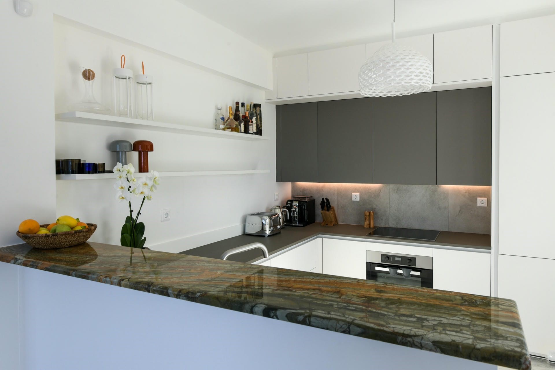 A chic, fully equipped kitchen separates the living room from the indoor dining area, which also features large windows allowing for natural light and beautiful views. Moreover, on the top floor, there is a convenient kitchenette and a small dining area adjoining the top terrace, perfect for preparing a mid-morning coffee or an evening aperitif.