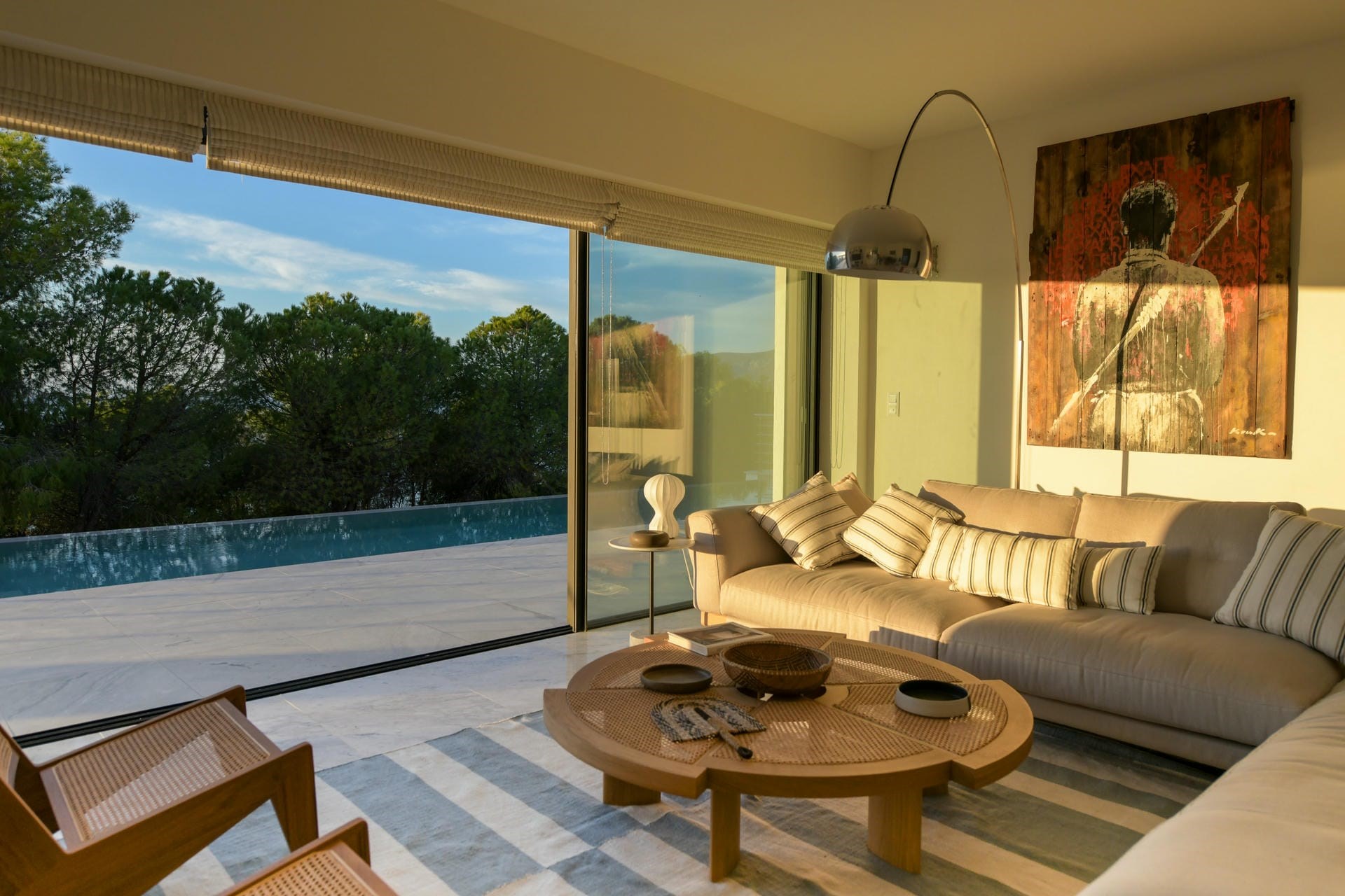 The villa itself is modern and minimalist, featuring clean, white lines and traditional materials such as marble and ceramic tiles throughout. The heart of the home is the bright and spacious living room, which boasts plush seating, a wide-screen TV, and floor-to-ceiling sliding windows that lead out to the pool terrace.