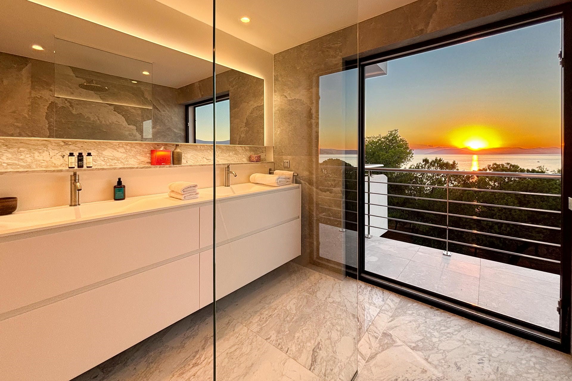 Master Bedroom – king-size bed, en-suite bathroom with dual vanity & shower, private terrace, and sea views