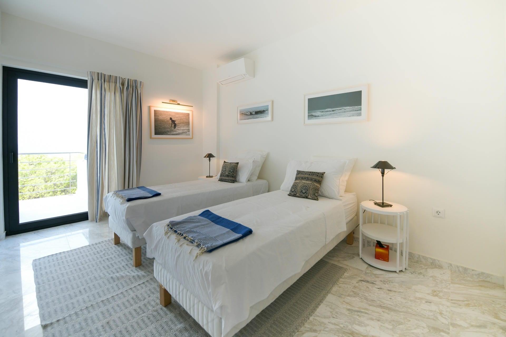Bedroom 4 – twin beds, en-suite bathroom with shower, terrace access, and sea views