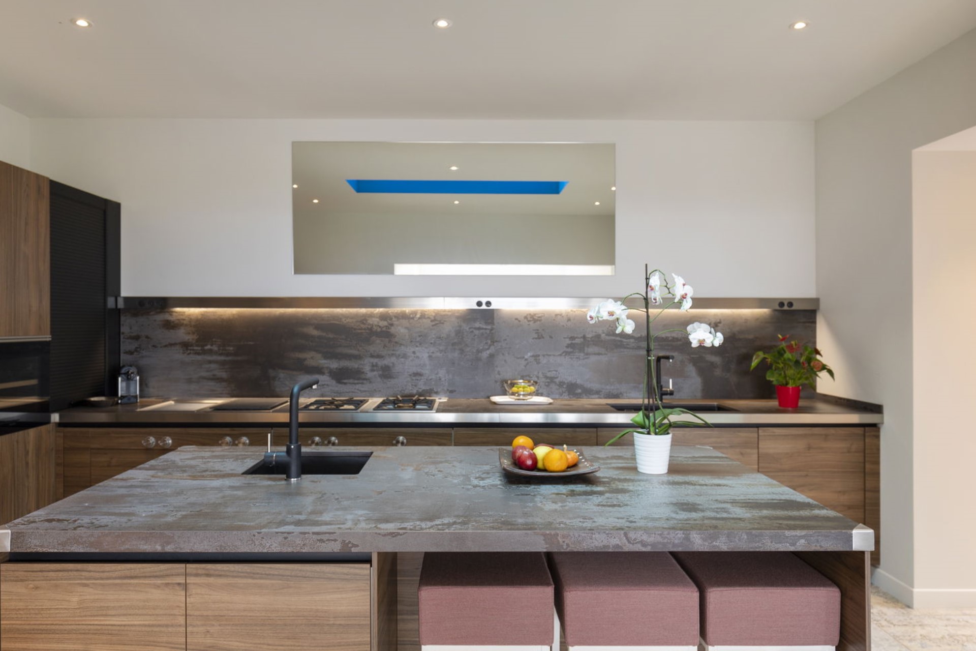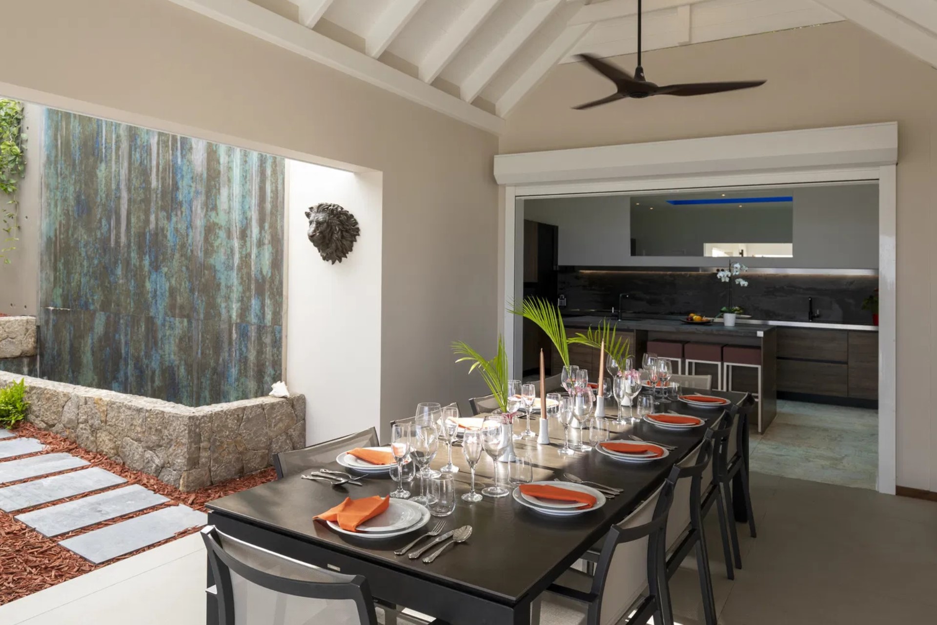 The villa’s interior features a spacious, air-conditioned living area with expansive glass walls that frame the breathtaking scenery. Comfortable sofas and curated decor provide a warm, inviting ambience, while the adjacent fully equipped kitchen boasts state-of-the-art appliances and a sleek breakfast bar. A spacious indoor dining table seats eight, making it perfect for shared meals and gatherings.