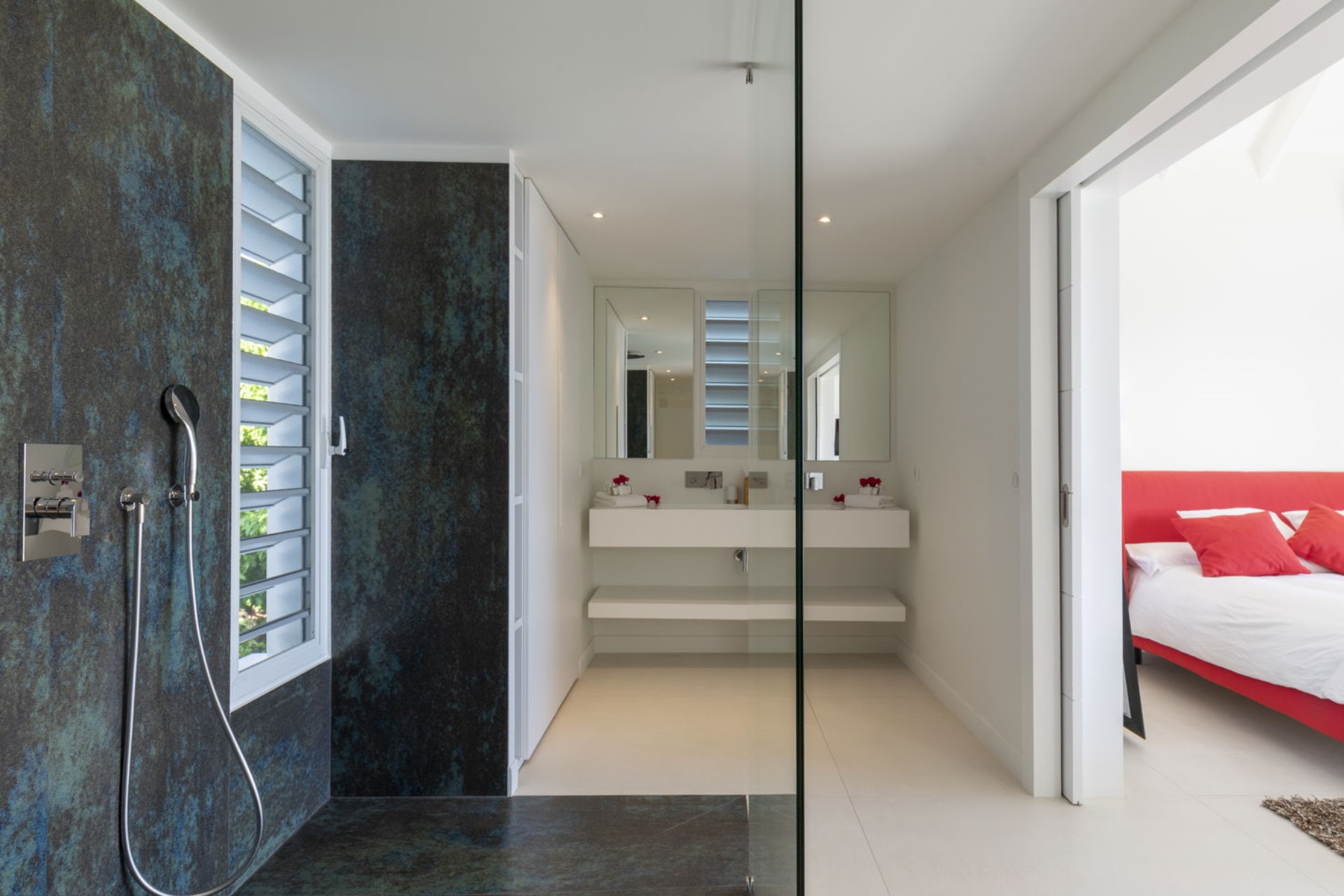 Bedroom 1 – king-size bed, desk, en-suite bathroom with dual vanity & shower, terrace access, ocean views