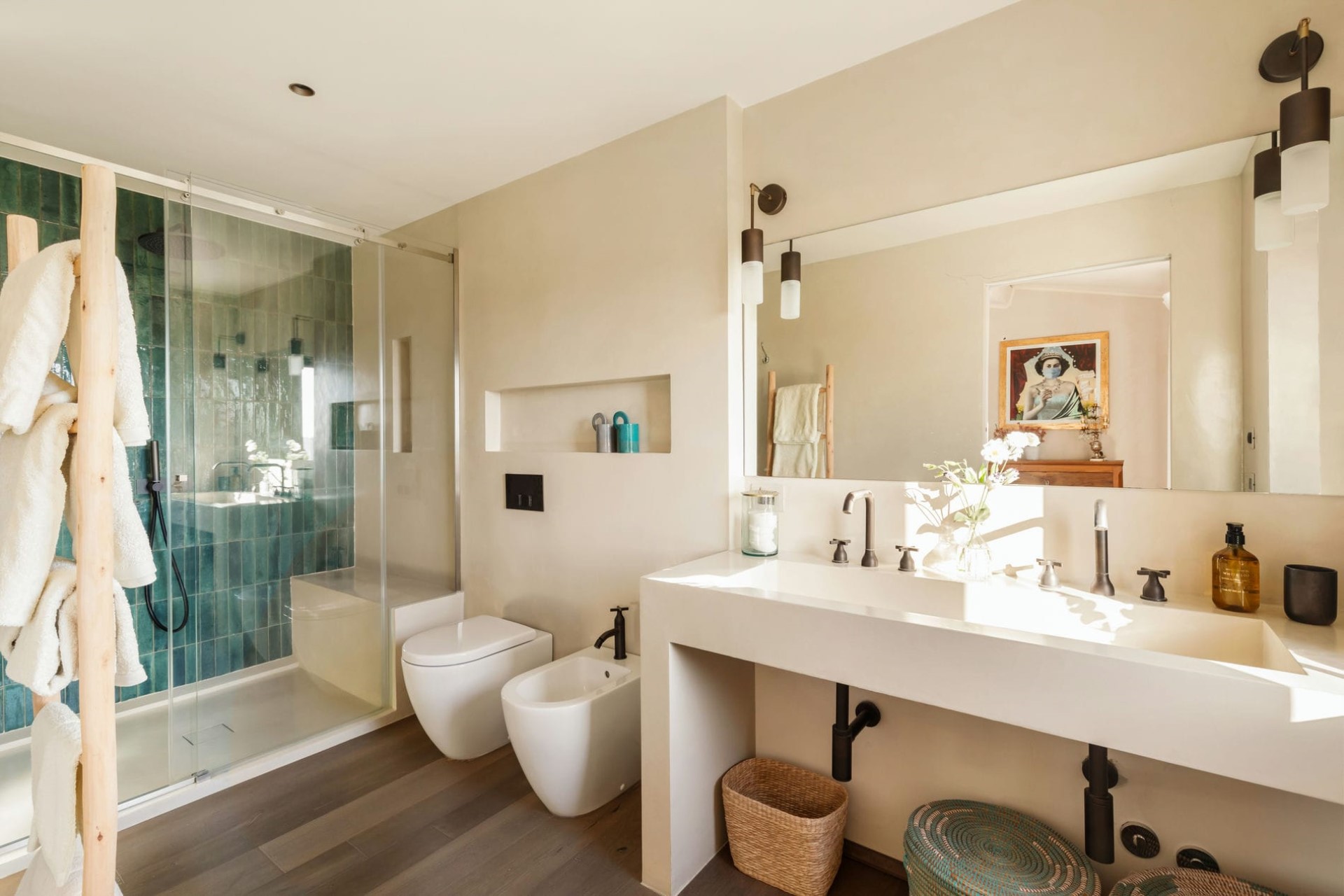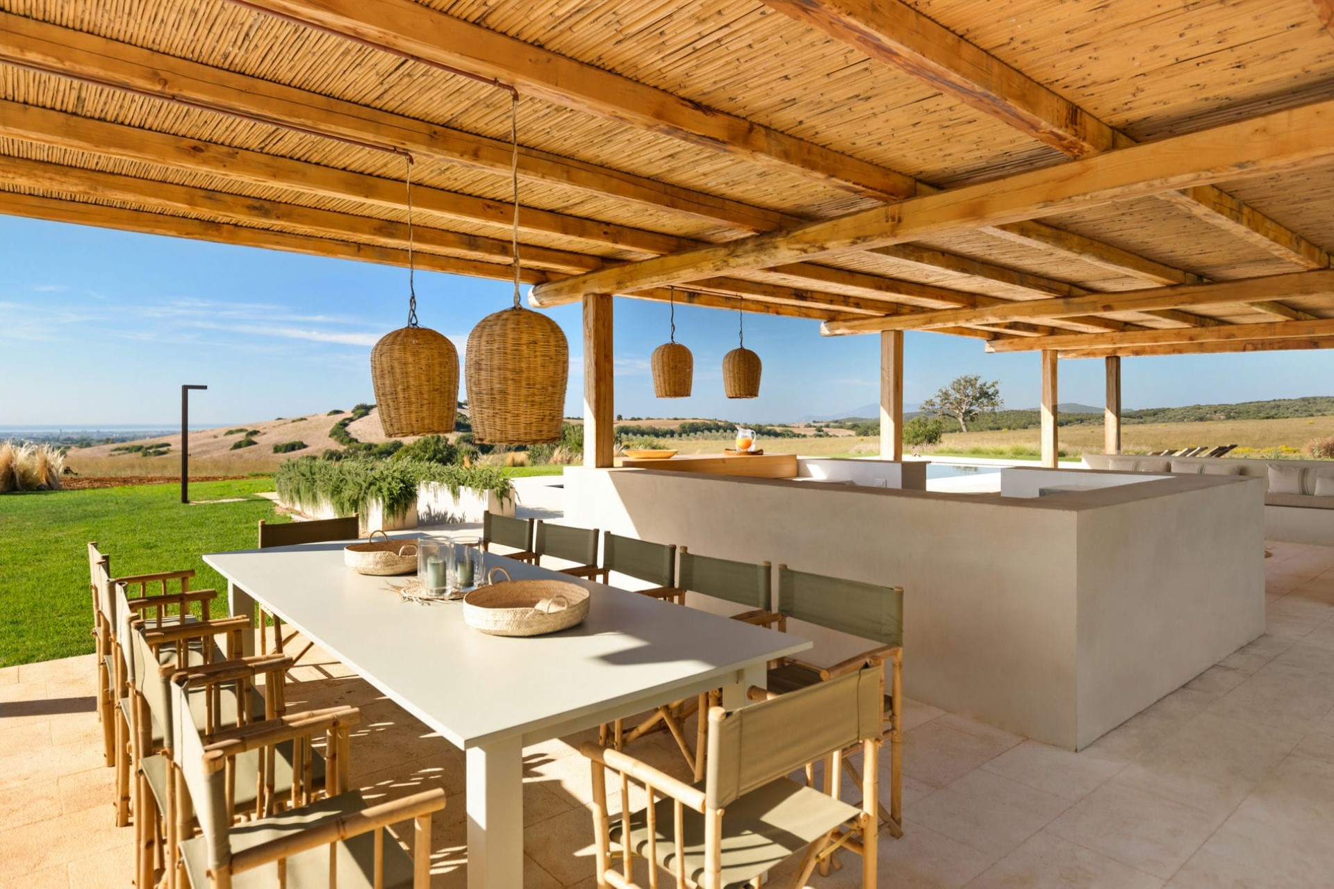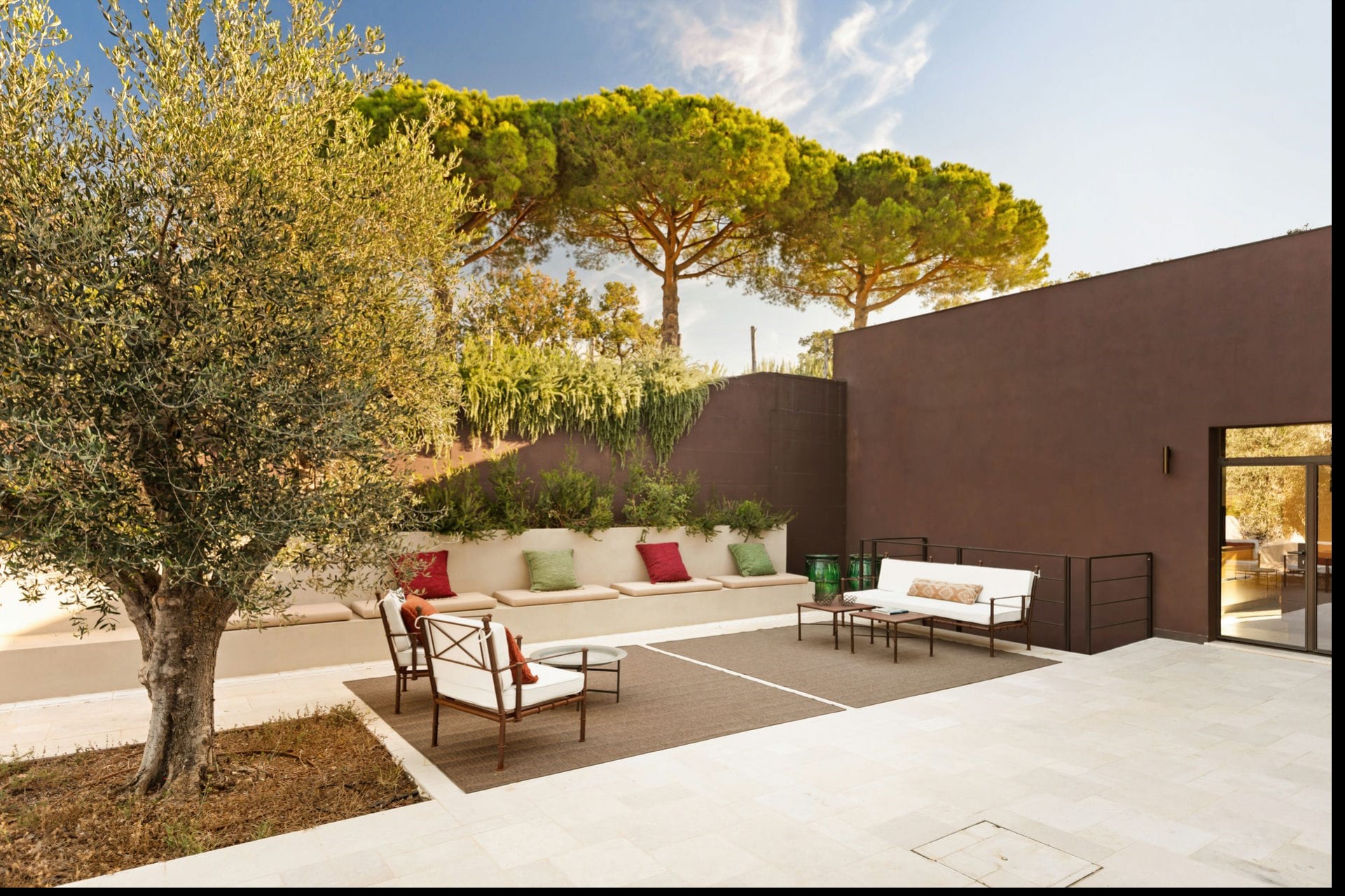 Beside the villa are several more outdoor living spaces. The ground floor terrace with lounge and dining area is perfect for enjoying a morning coffee, al fresco lunches, or evening drinks with sunset views. The courtyard offers a shady space to relax, whilst the first-floor terrace boasts sweeping views across the countryside right down to the sea.