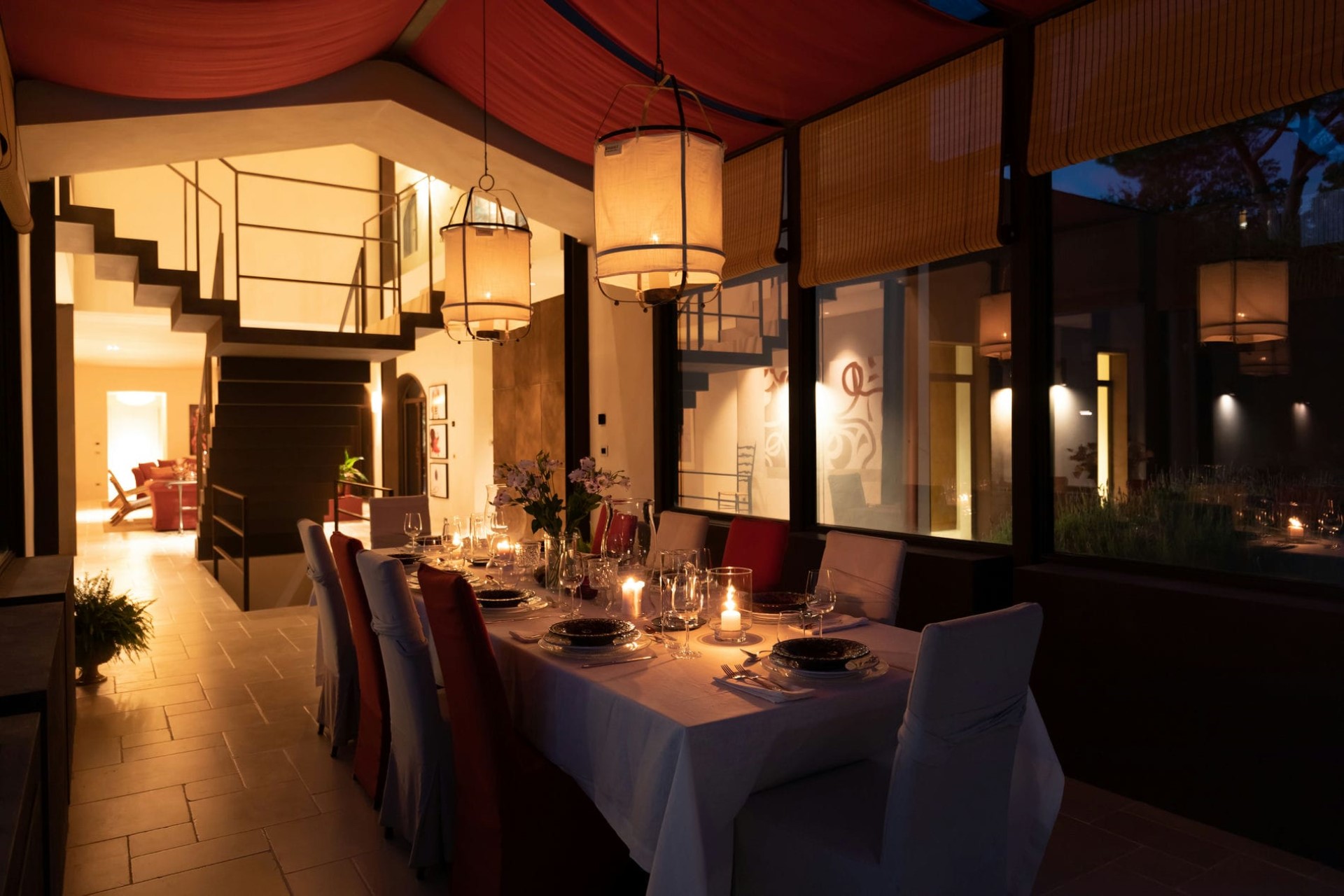 At one end of the lounge is a cosy dining alcove. With a 12-seater table surrounded by glass walls on three sides and colourful ceiling drapes overhead, it is perfect for atmospheric dinner parties.