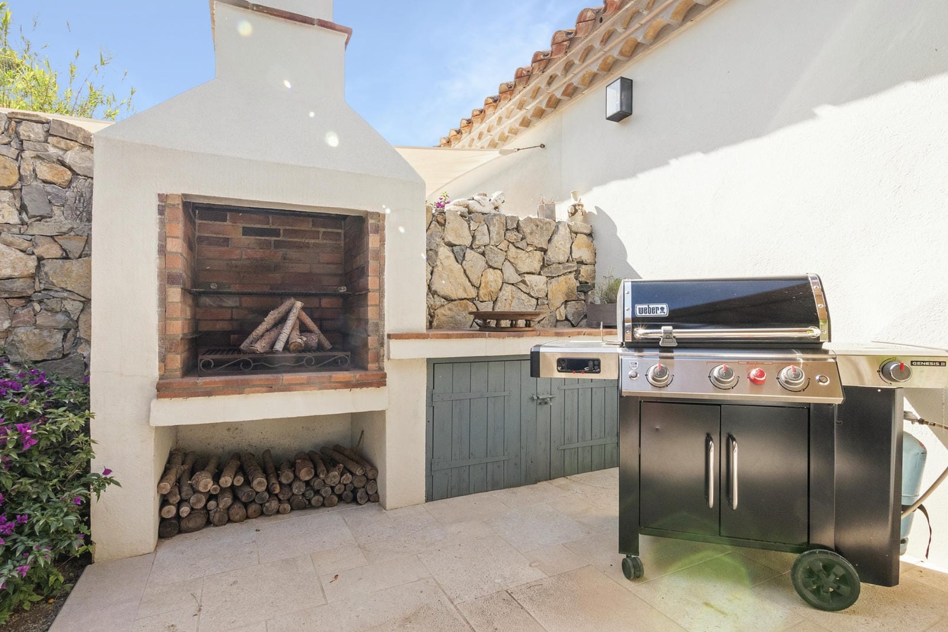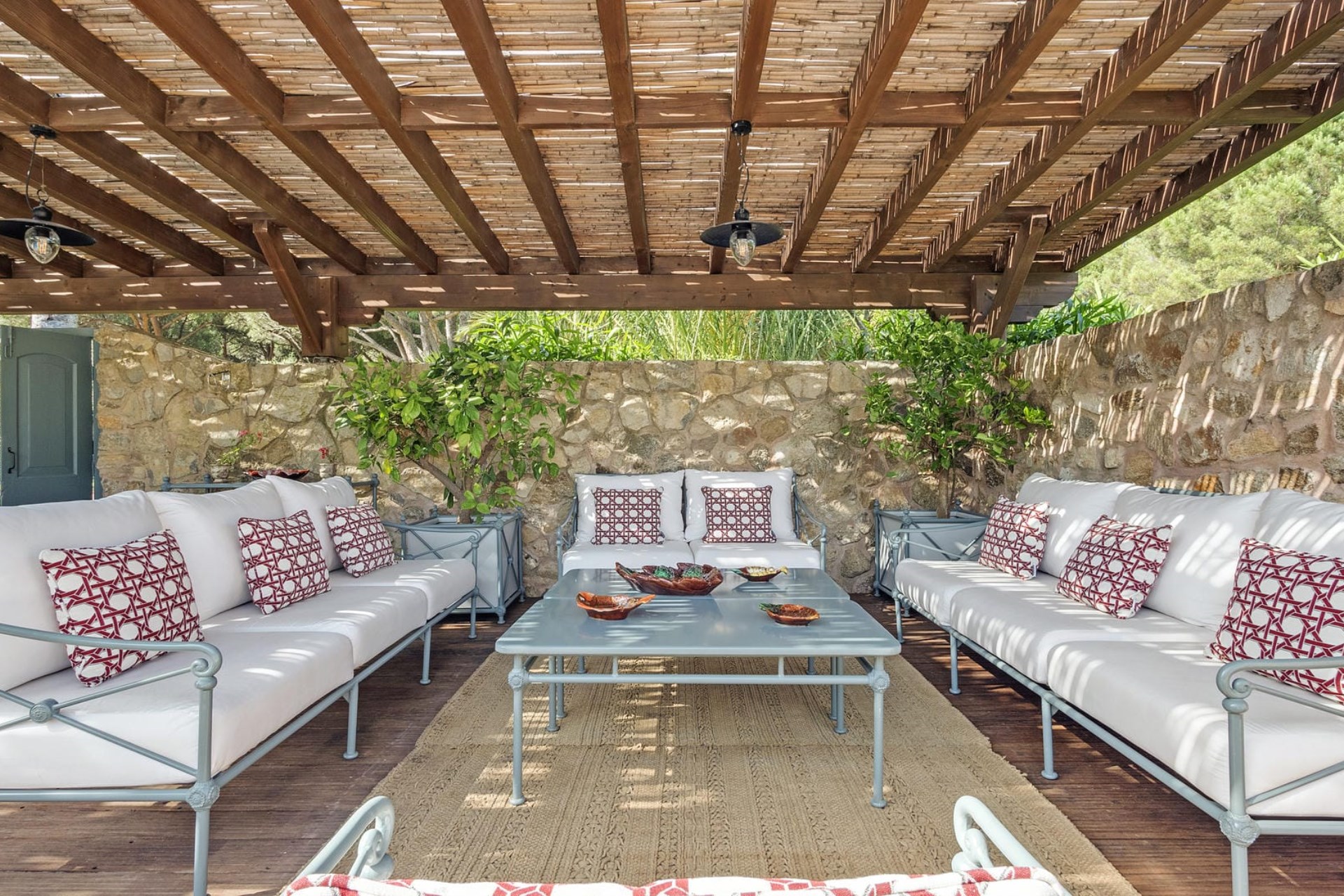 The villa offers plenty of space for outdoor living. Set within two hectares of lush pine forest, it offers beautifully landscaped gardens and verdant spaces for relaxation, al fresco dining, and enjoying the glorious Mediterranean climate. A sparkling swimming pool is the focal point, surrounded by sun loungers and umbrellas for post-swim relaxation. Guests can lounge on outdoor sofas, enjoy informal al fresco meals prepared in the barbecue area, which includes a pizza oven. In one corner of the grounds, a shaded courtyard provides a tranquil space for moments of calm solitude.