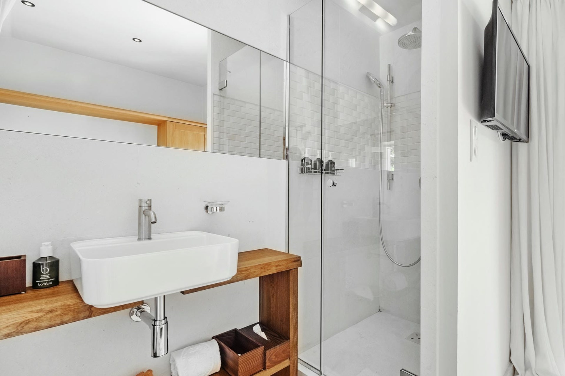 Bedroom 2 – queen-size bed, en-suite bathroom with shower, and garden access