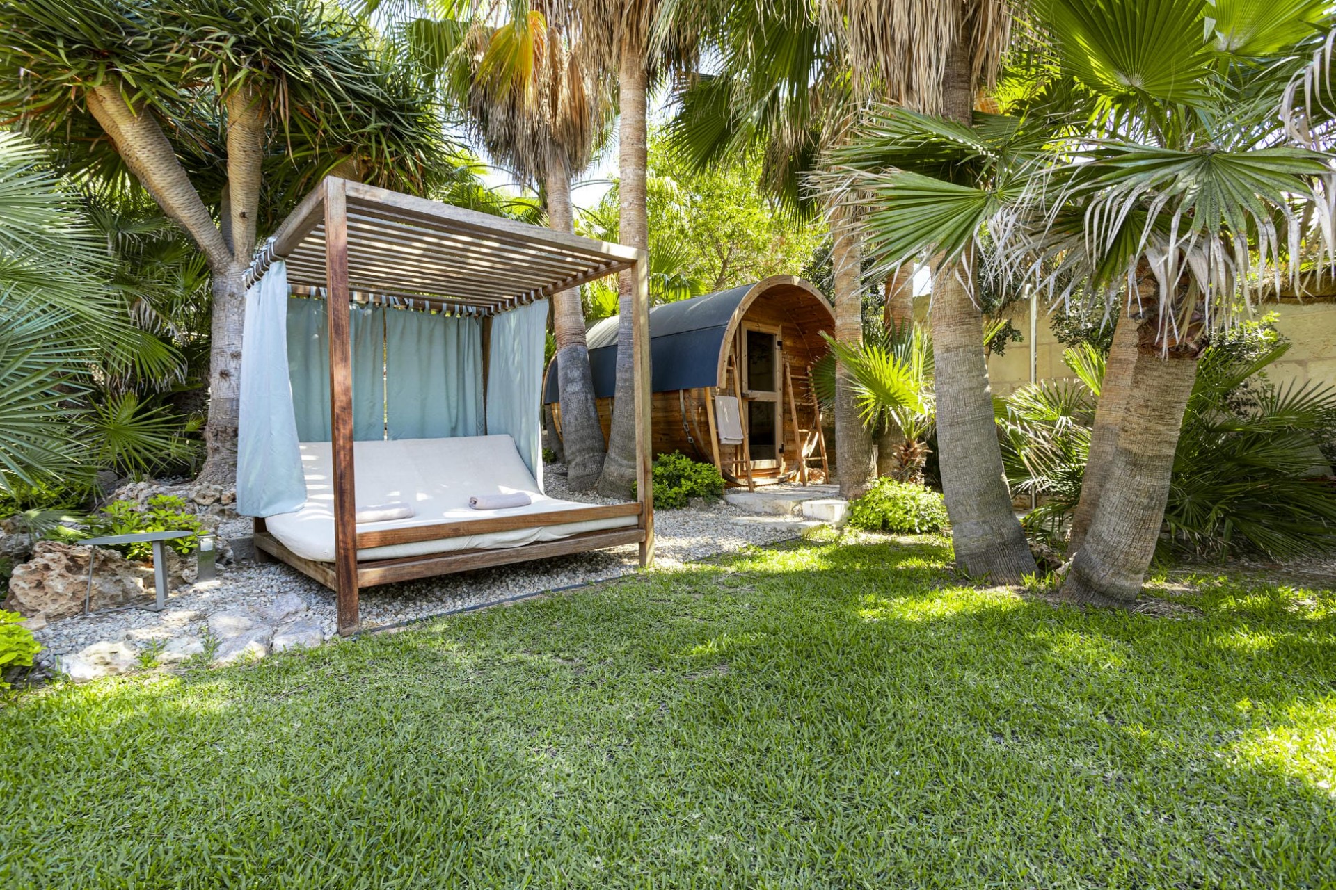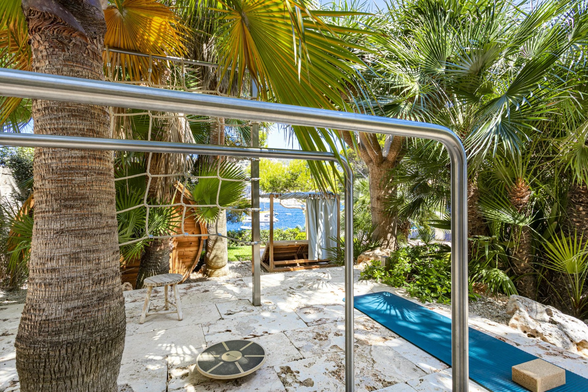A wooden sauna cabin and a cosy daybed are tucked away on the lush lawns under the shade of palm trees. Active guests can also make use of the outdoor gym, which is set up with everything from a leg press machine to a rope ladder to gymnastics equipment.