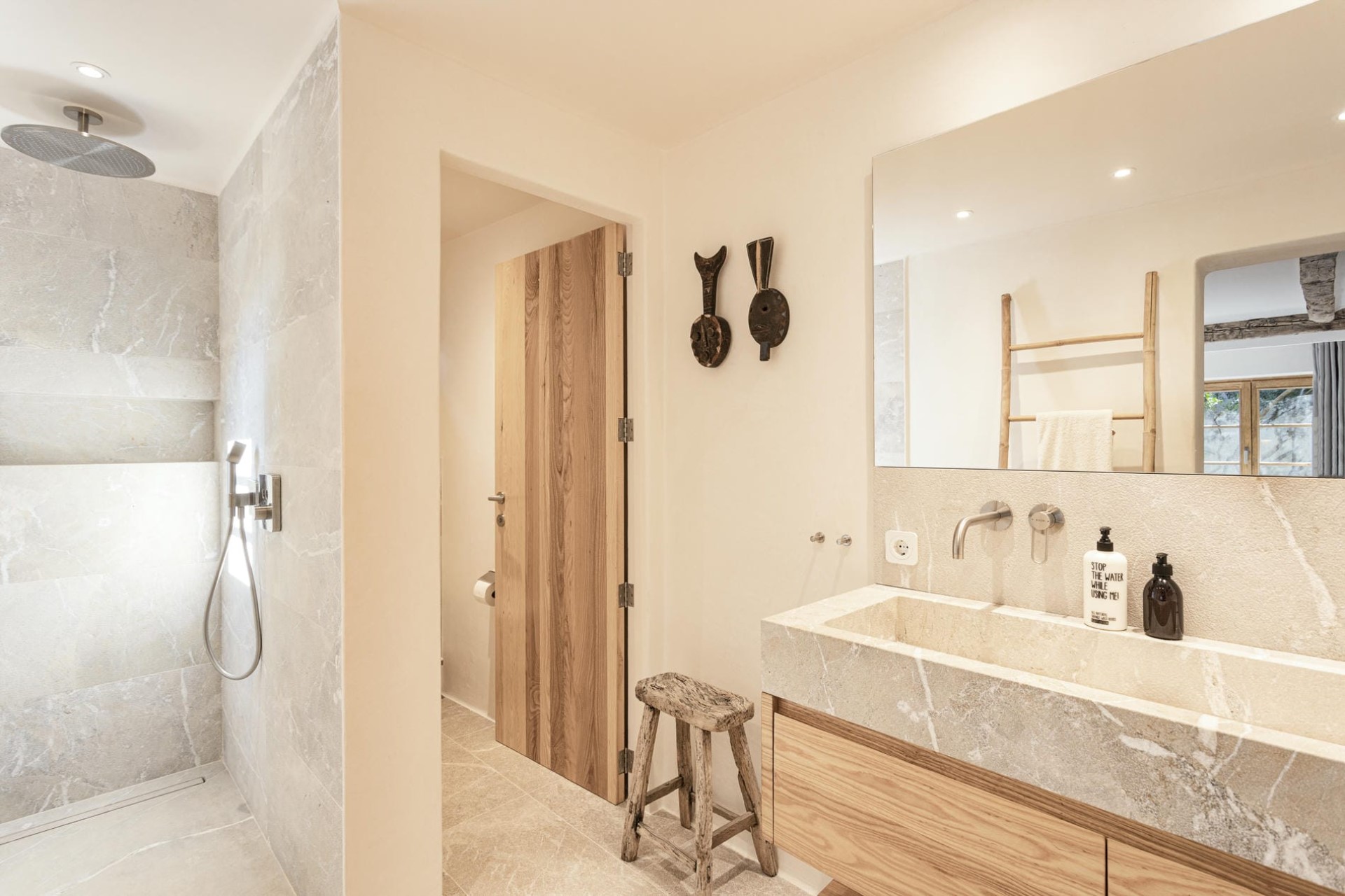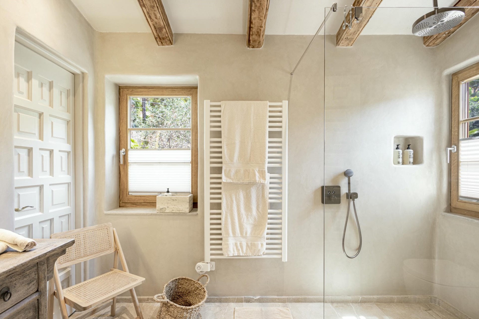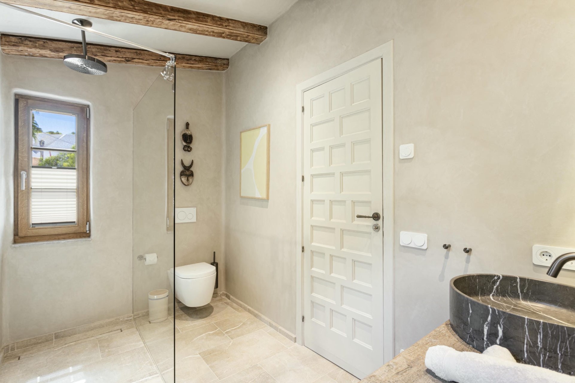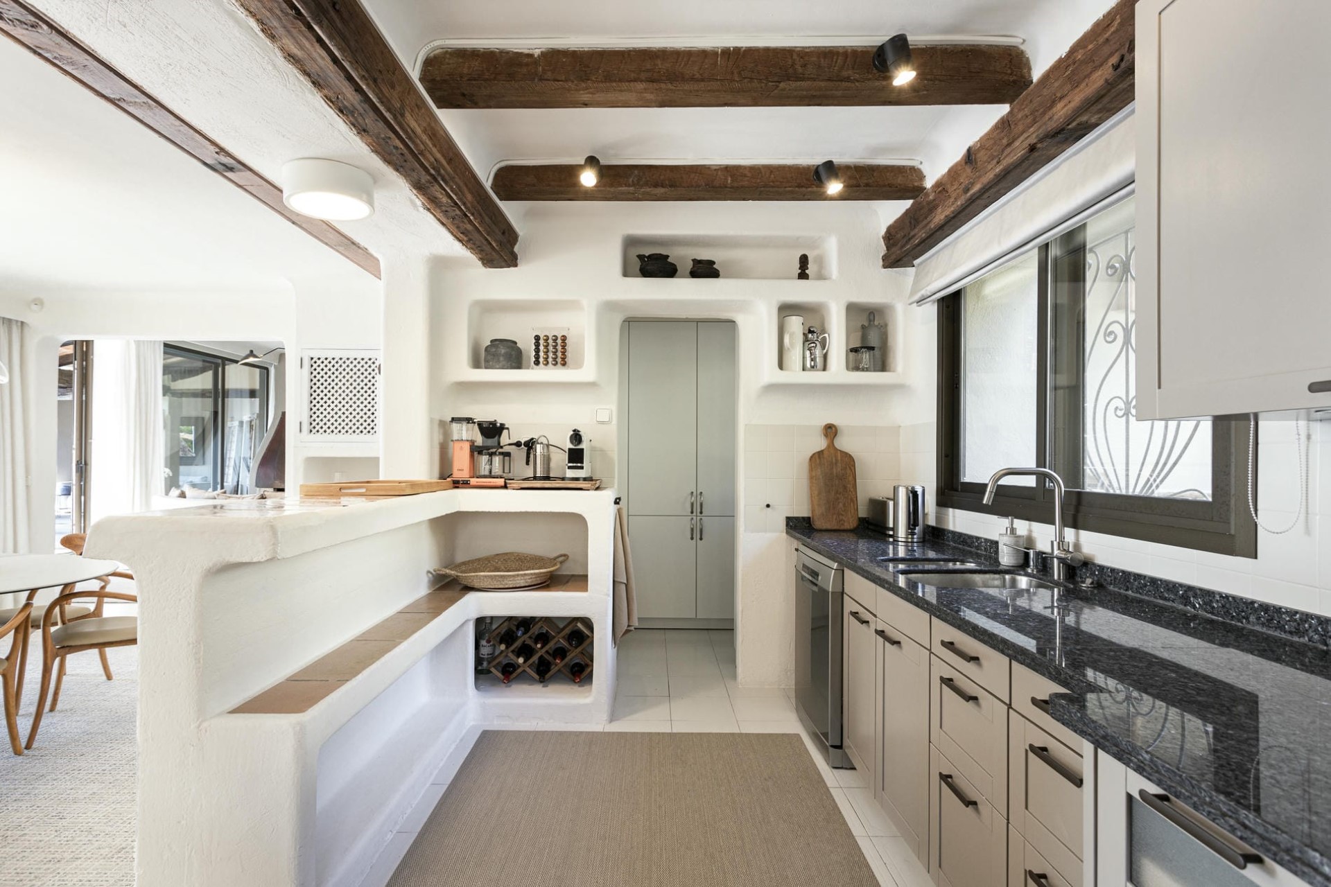 Within the main villa are four comfortable double rooms with en-suite facilities set across two floors. The large master bedroom boasts a private sea view terrace on the first floor. In addition, there is a fifth bedroom in a separate guest house, ideal for those seeking more privacy. Along with en-suite facilities, it features a well-equipped kitchen and a private courtyard.