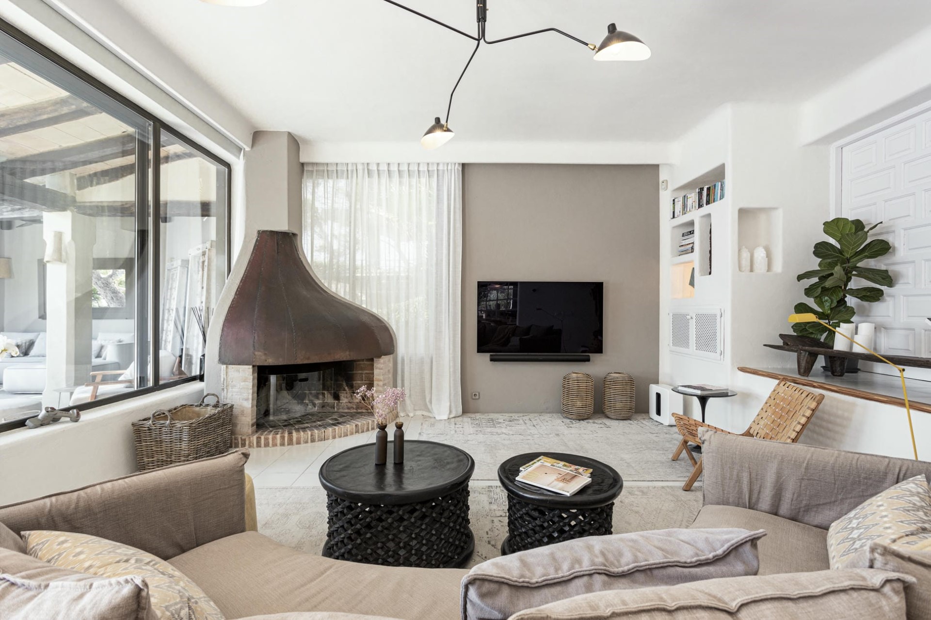 Indoors, white walls and minimalist furnishings create a bright and spacious feel. A carefully selected art collection adorns the walls and floors, with antique pieces from Africa and Asia tastefully blended with contemporary European works.