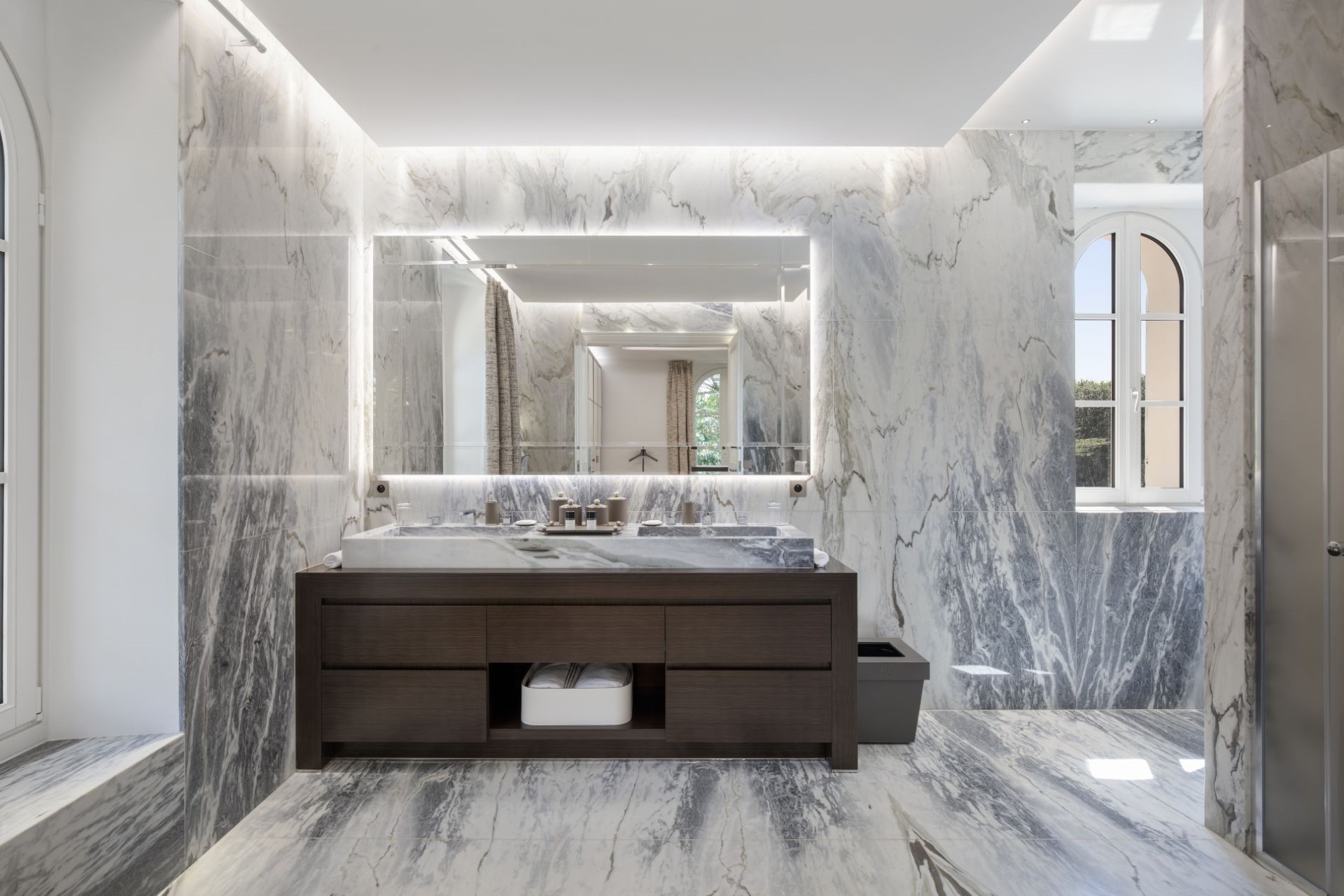 Alongside the main house is a second pool dedicated to wellness and relaxation, with koi fish and floating water lilies creating a tranquil atmosphere. Enhancing the wellness concept, the villa also offers a full private spa with various treatment rooms, a hammam, a sauna, and a fully-equipped gym.
