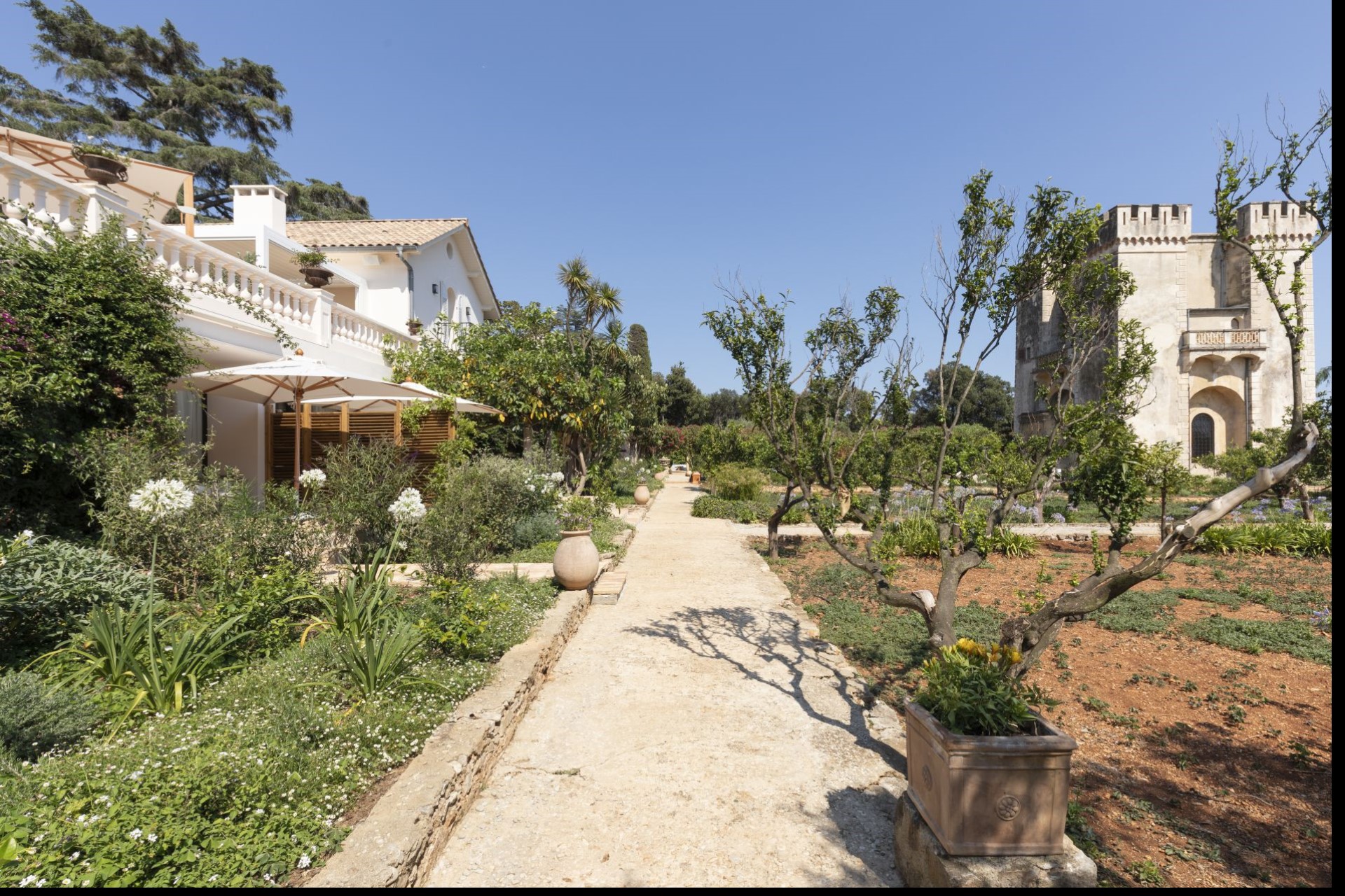 Villa Le Grand Jardin is the only private property on the isle of Sainte Marguerite, just off the coast of Cannes on the Cote d’Azur. This car-free island is accessible only by boat or helicopter, adding to its exclusivity.
