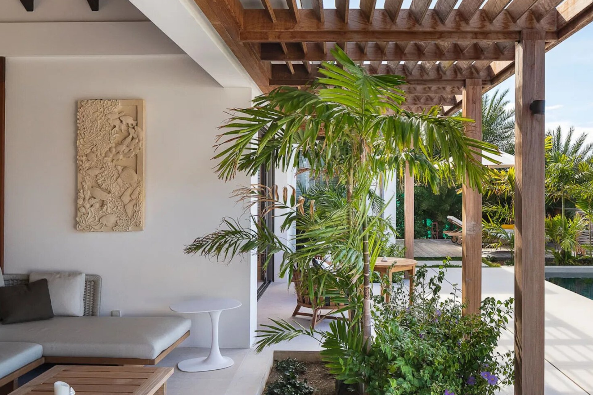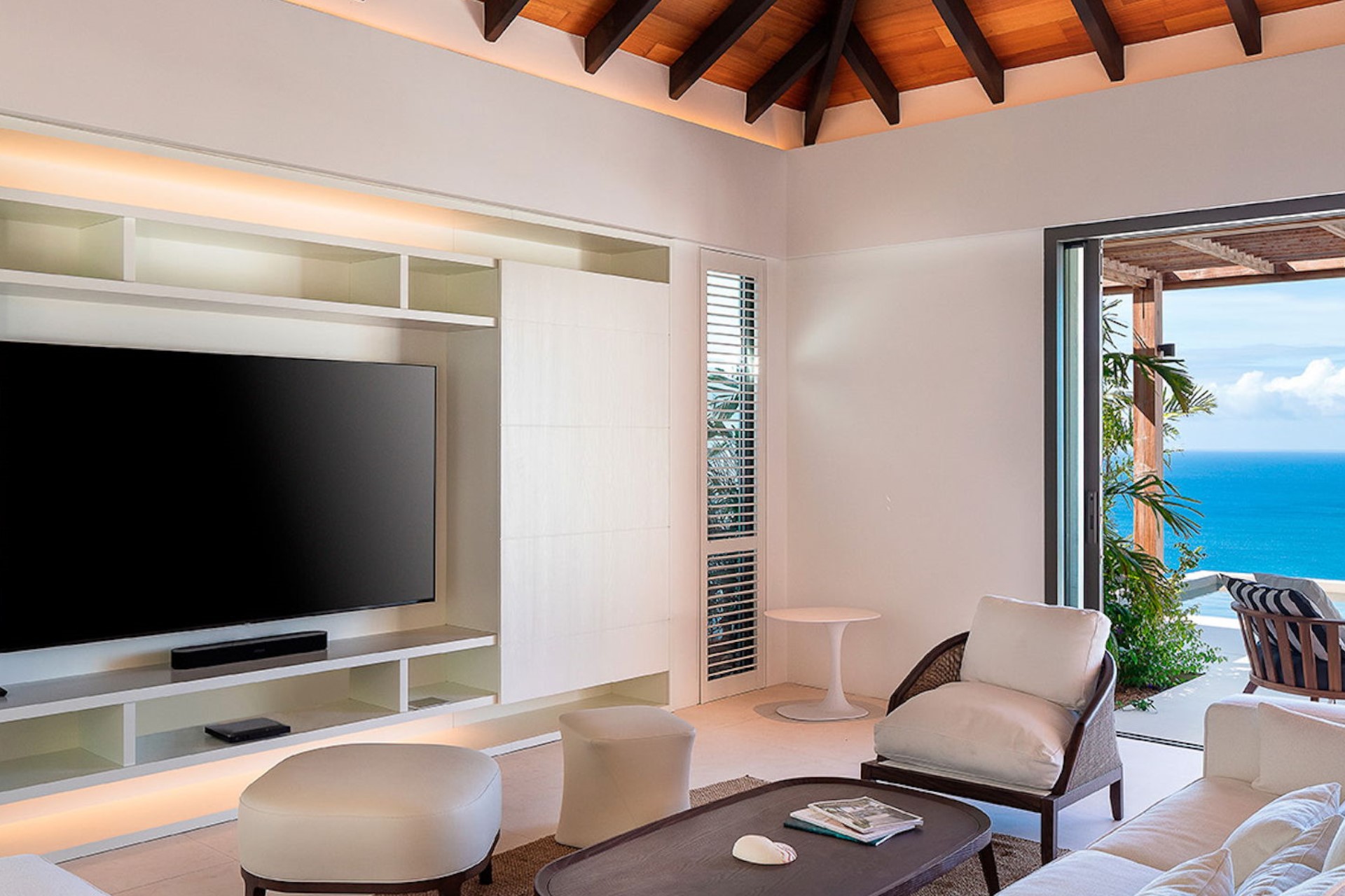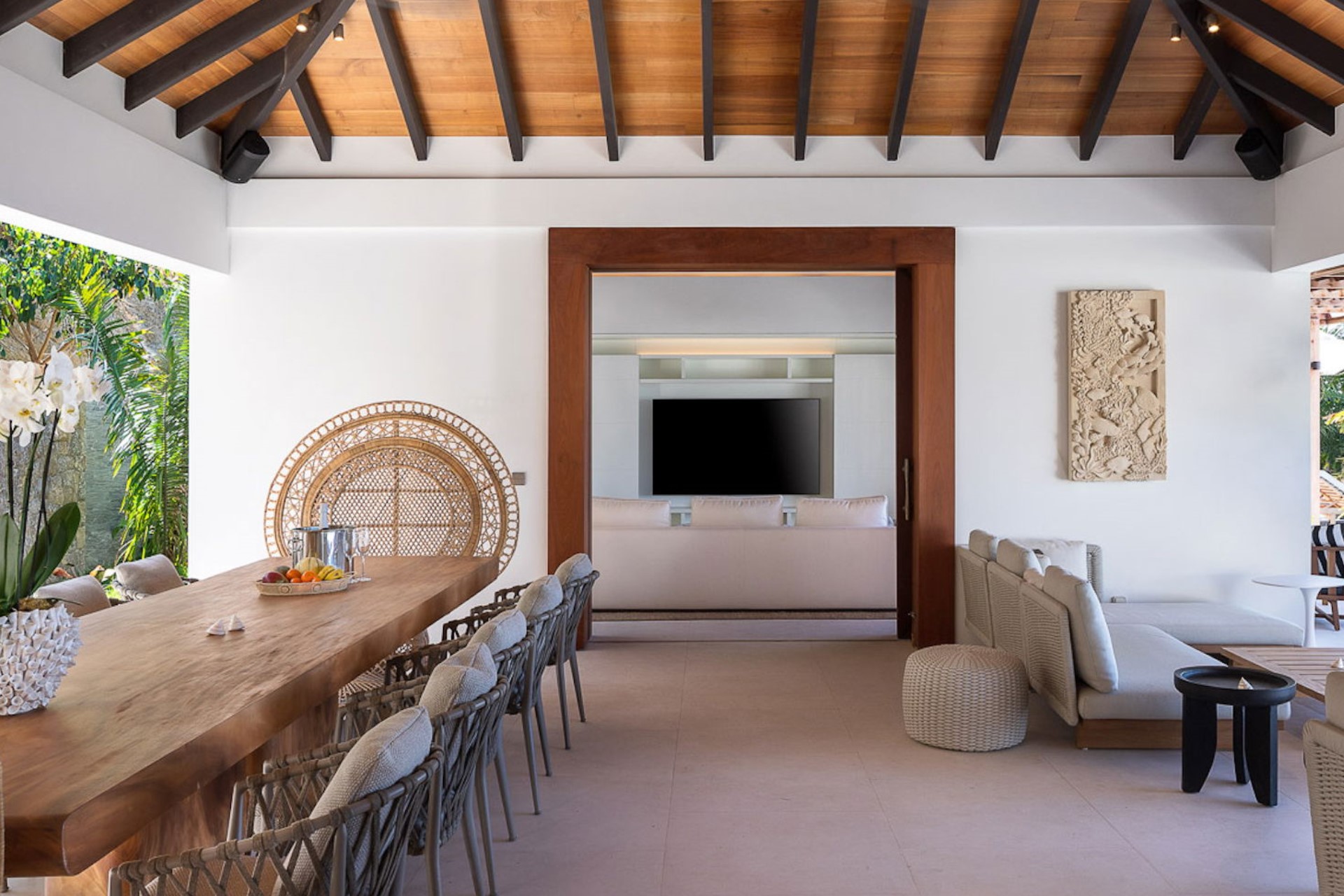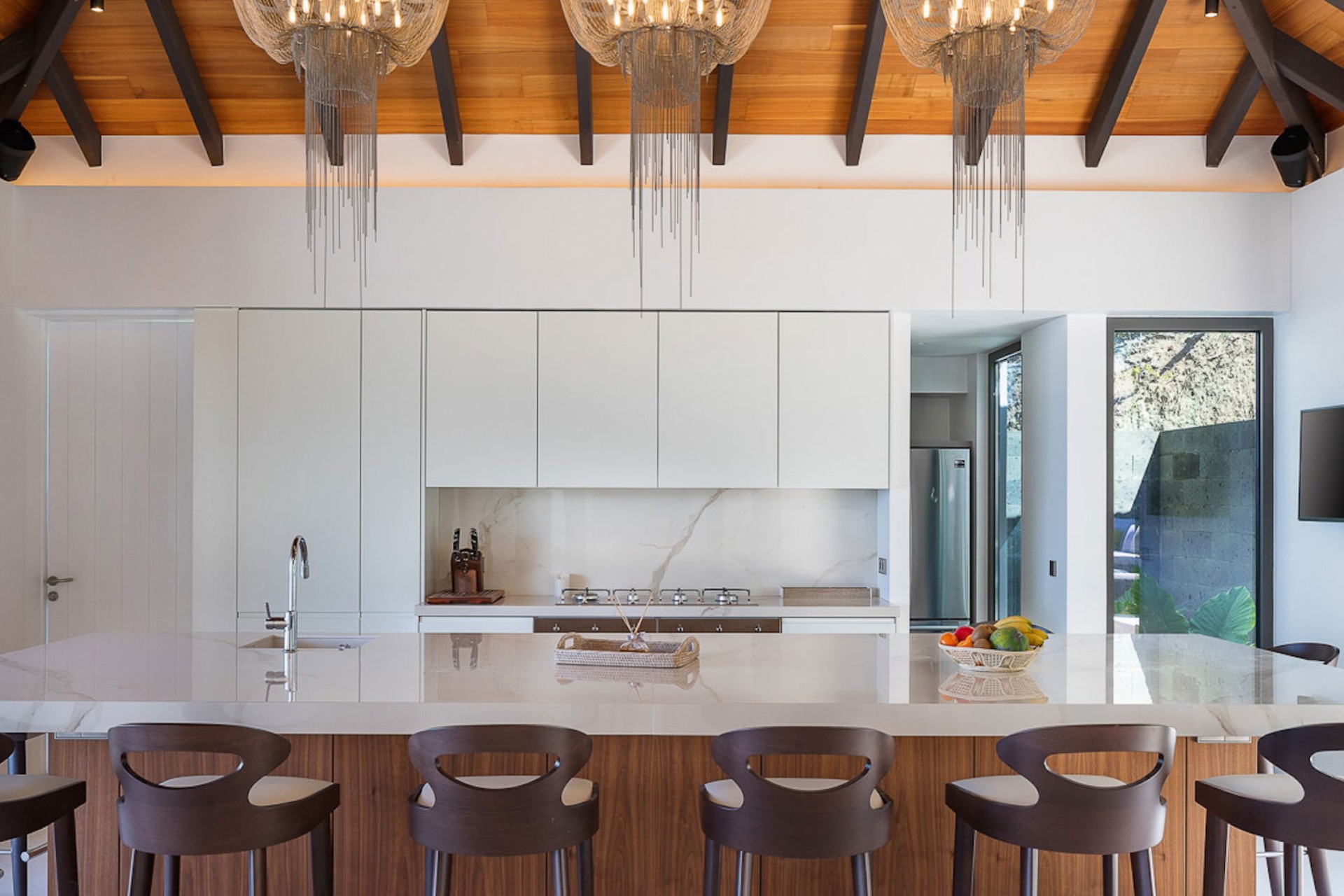 The villa’s interior is a blend of elegance and functionality. The air-conditioned living room features comfortable sofas and expansive windows, inviting in natural light and framing the ocean views. A fully equipped kitchen with modern appliances ensures effortless meal preparation. The open-plan design flows seamlessly into the shared spaces, making it ideal for gatherings and relaxation.