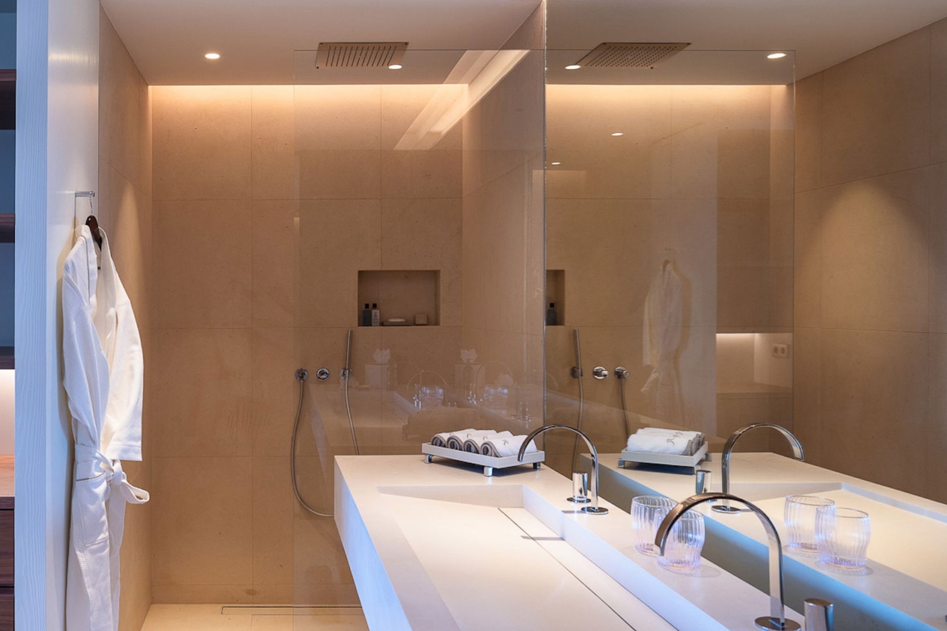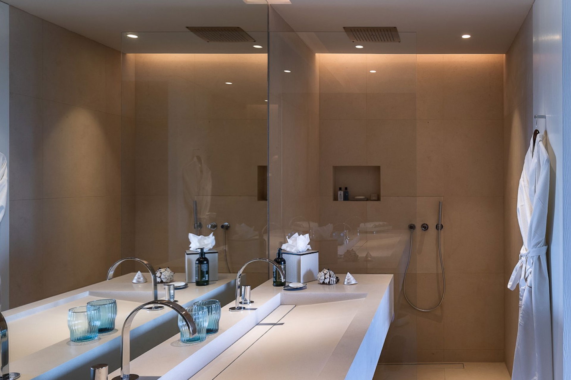 Each of the villa’s five air-conditioned bedrooms is beautifully appointed, featuring king-size beds, en-suite bathrooms, and private terraces. The bedrooms are thoughtfully distributed across the property, with three located on the main level and two on the lower level, ensuring a balance between shared spaces and personal retreats.