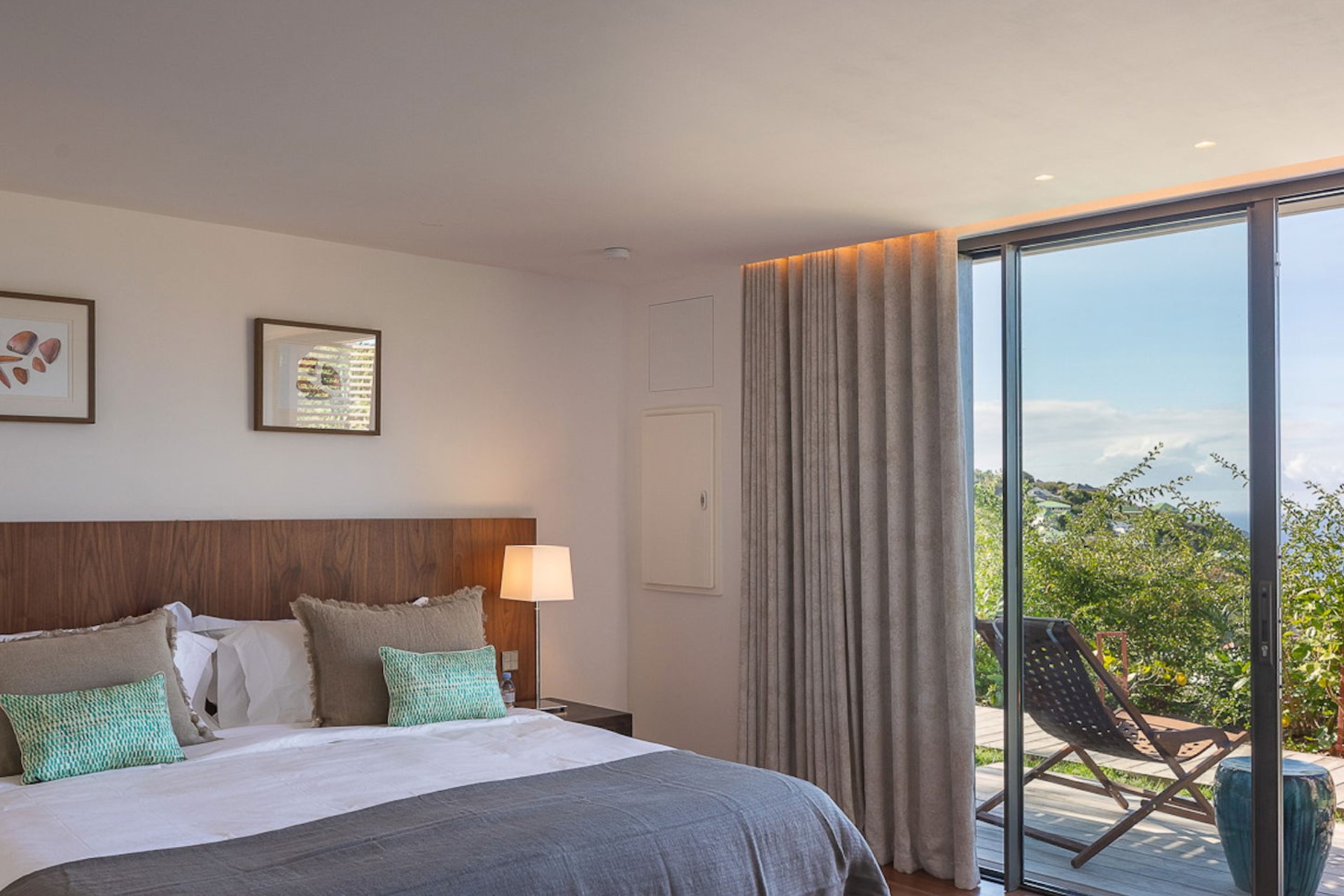 Bedroom 5 – king-size bed, en-suite bathroom with dual vanity & shower, private terrace, ocean views