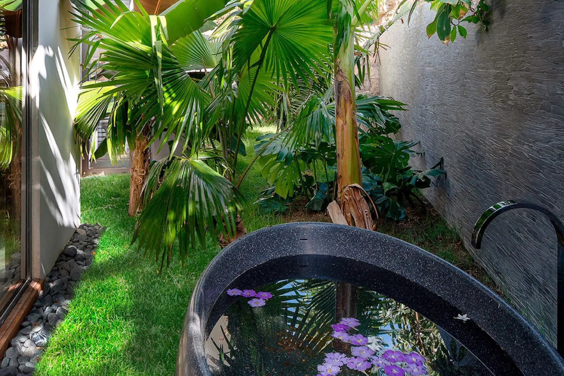 Bedroom 1 – king-size bed, en-suite bathroom with dual vanity & shower, private garden with outdoor bathtub, private terrace, ocean views