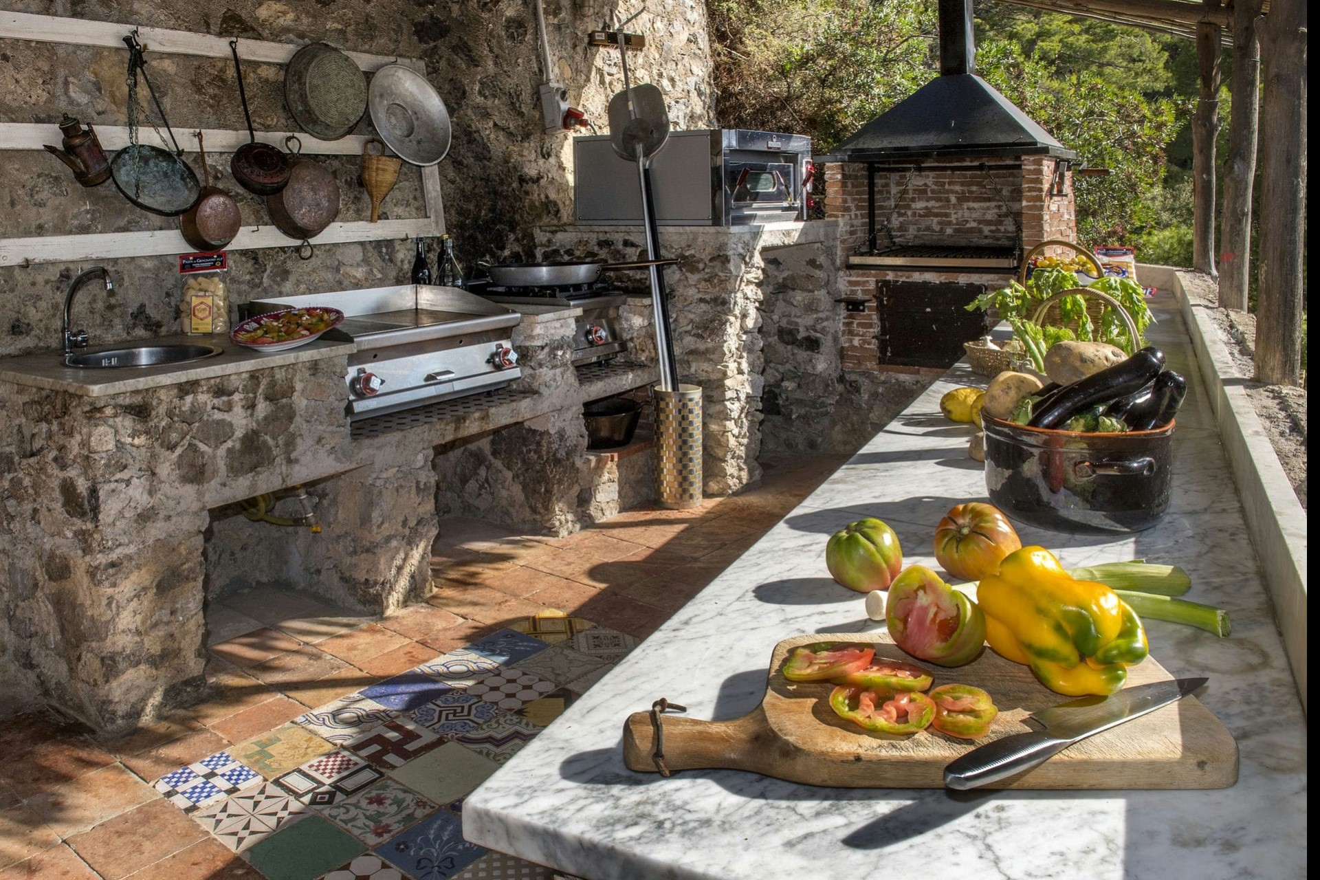 When it comes to outdoor living, guests are spoilt for choice. From the sunny open terrace to a trellis-shaded outdoor dining space to the vine-covered outdoor lounge, there is plenty of space to savour a glass of local wine while watching the sunset, or simply relax and soak in the idyllic atmosphere. The villa also features an outdoor kitchen equipped with a barbecue and a wood-fired pizza oven for convivial al fresco meals.