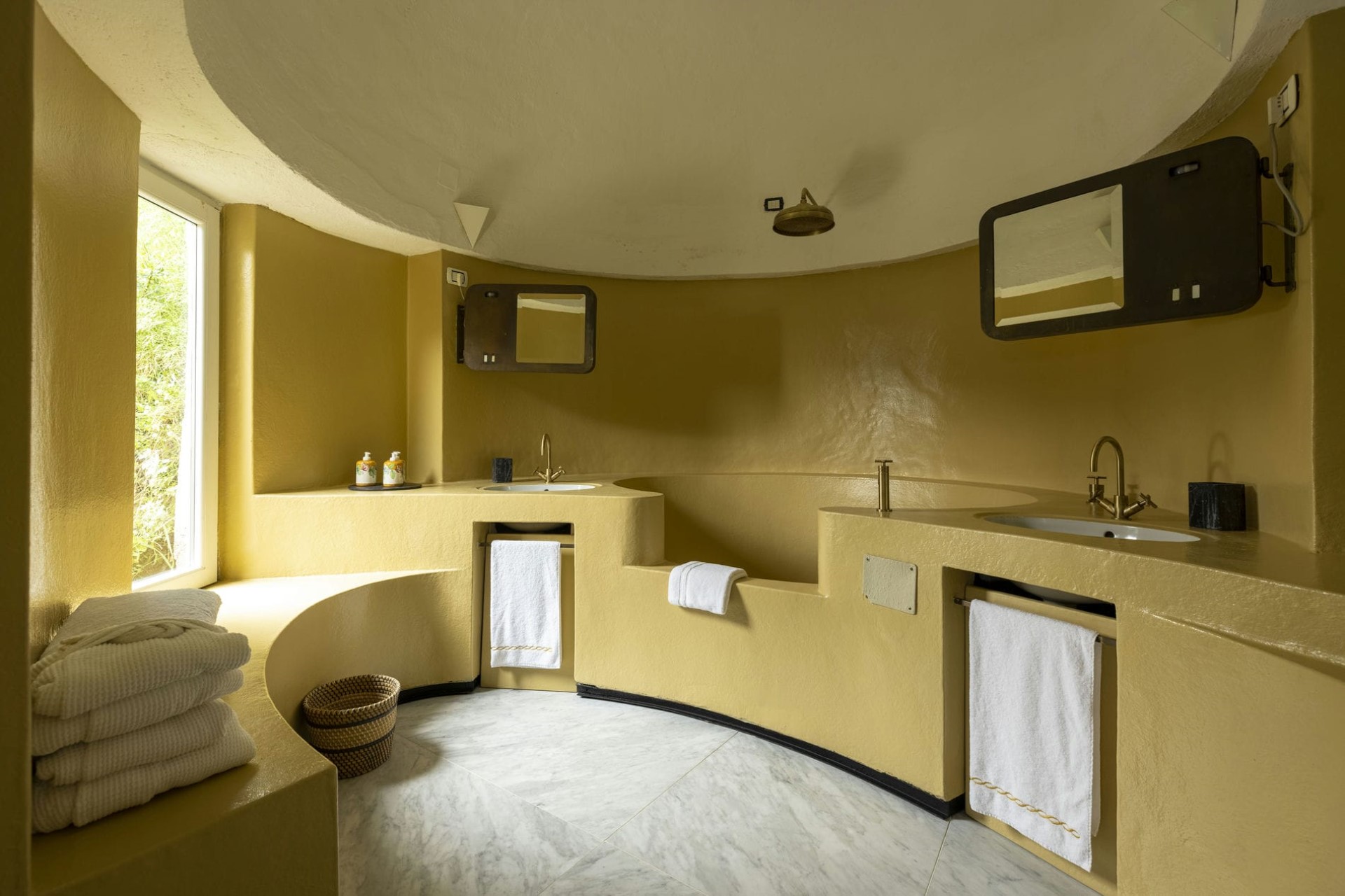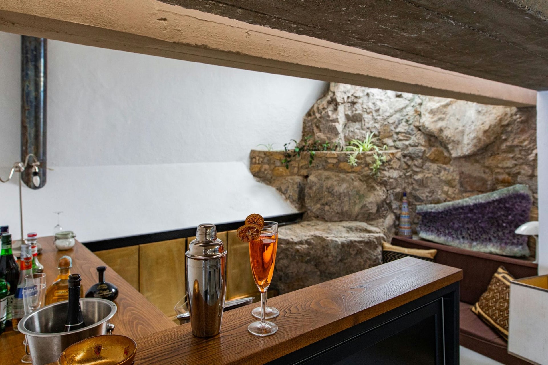 On one of its many terraces, the villa features a saltwater pool uniquely designed to incorporate the sheer cliff wall and offers panoramic views. Post-swim, guests can laze on a poolside lounger to soak up the rays.
