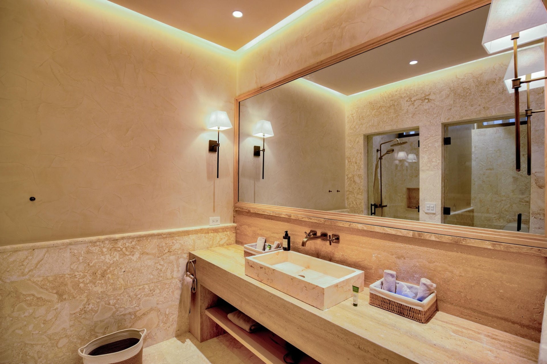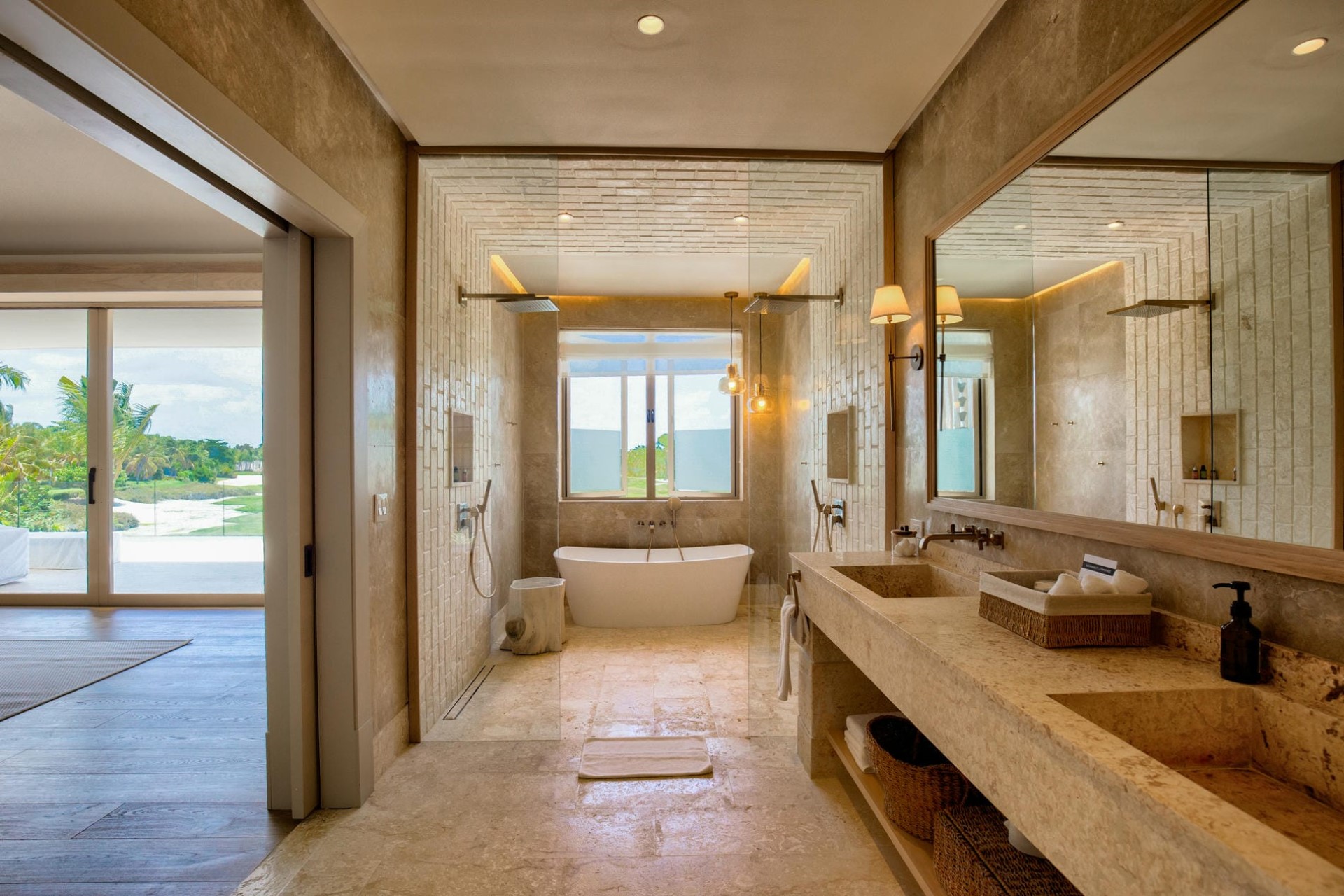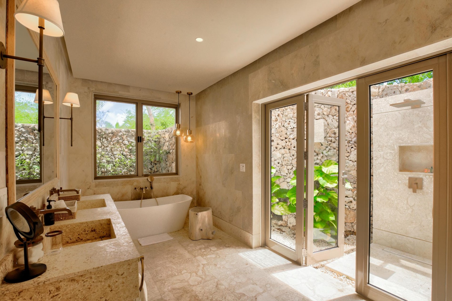 All the en-suite bathrooms have been thoughtfully and elegantly designed, with warm cream marble and natural wood used throughout, luxury rain showers, indulgent bathtubs and a tropical outdoor shower in one of the ground floor rooms, making even a simple morning wake-up routine feel like a spa visit.