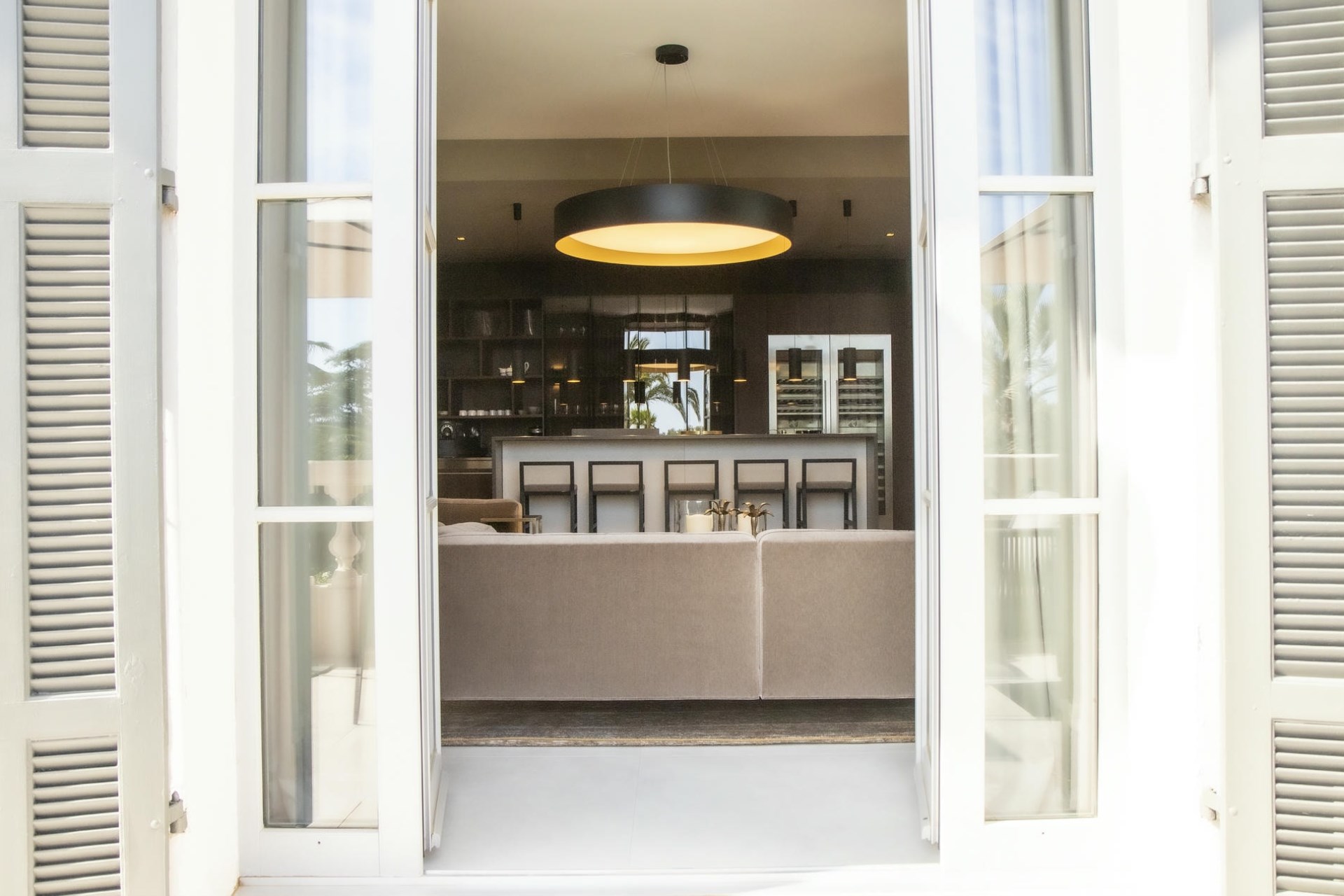 Indoors, sleek lines, designer furnishings, and a luxuriant palette of grey, beige, and olive create a sophisticated yet natural ambience. Oversized French doors and windows ensure a breezy, light-filled atmosphere and offer seamless transitions from outdoors to in.