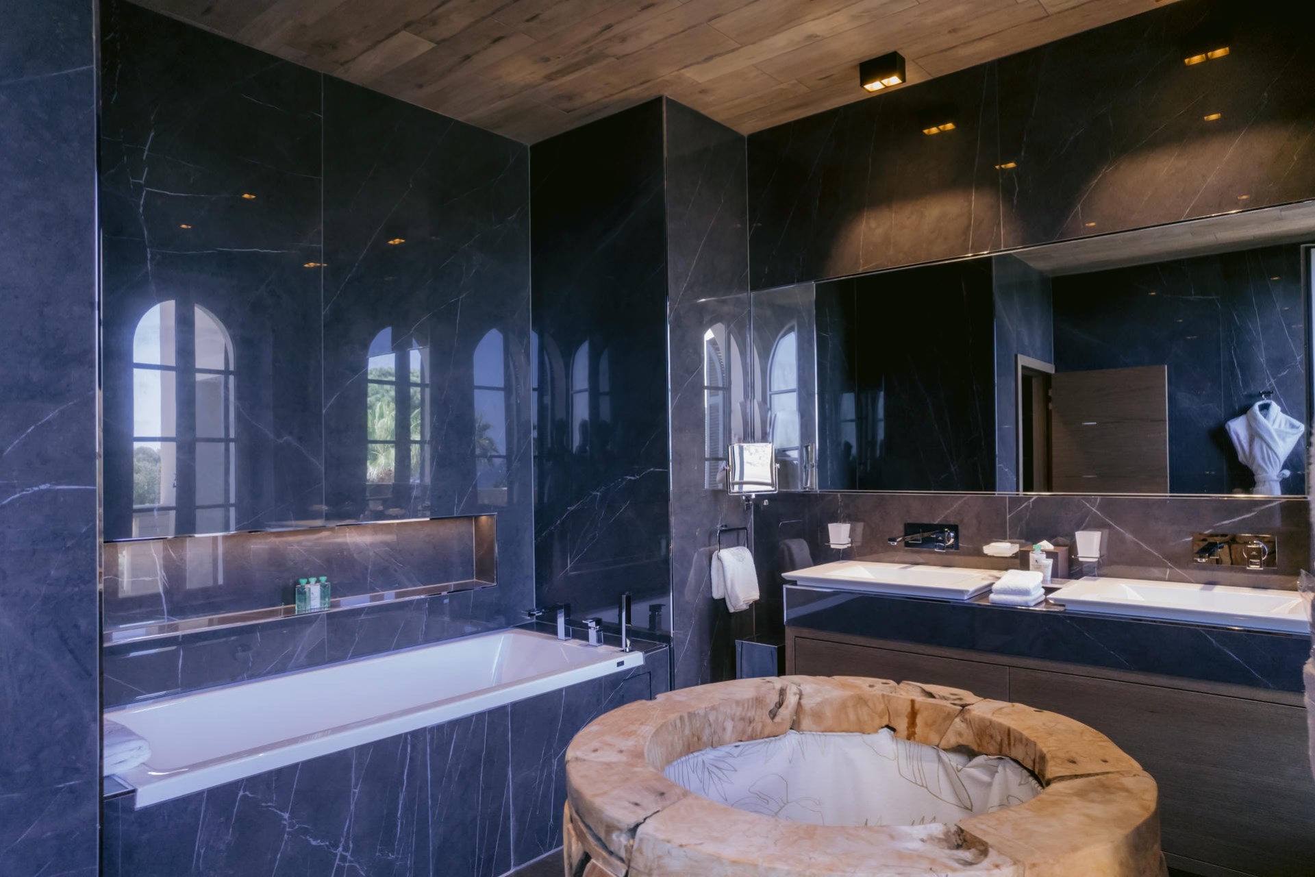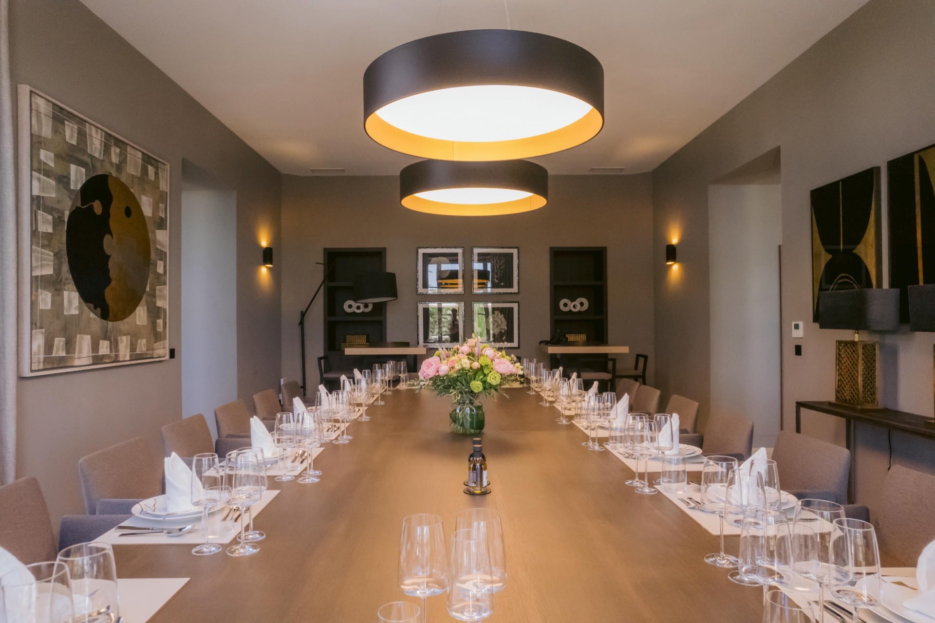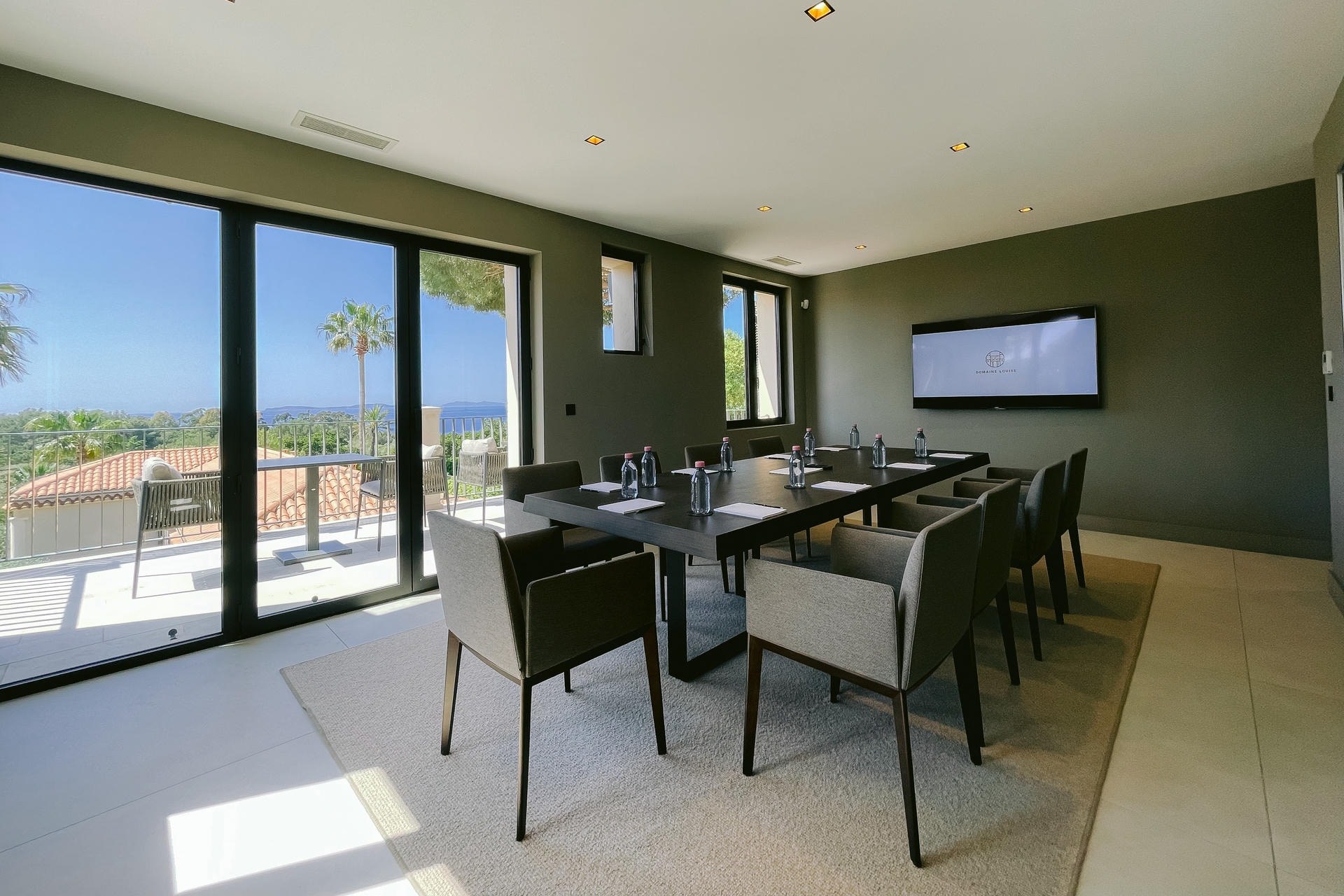The villa features a spacious lounge bar, an elegant dining room, and a large professional kitchen. A wellness area with a massage room, private gym, and courtyard Jacuzzi further enhance the luxury experience Moreover, a meeting room with conference facilities makes it the ideal property for corporate groups.