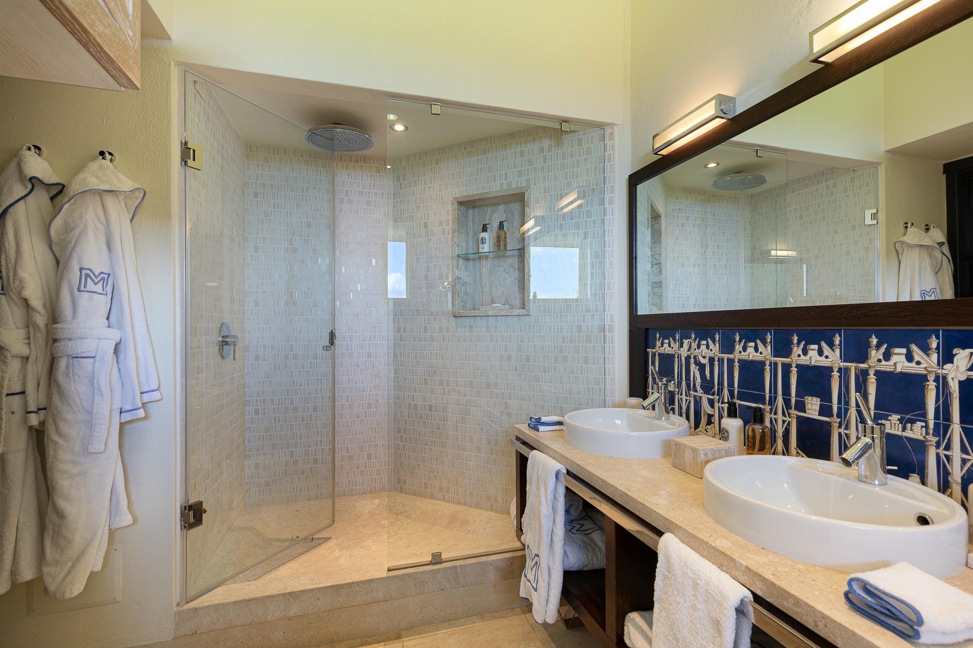 The nine double bedrooms – eight in the main villa and one in a separate guest cottage – are all well-appointed and feature sweeping views across the bay. The large windows allow for ample natural light and make for perfect viewing of stunning sunrises. Five rooms feature en-suite facilities with the remaining four sharing a bathroom between two. Additionally, there is a sauna near the master bedroom.