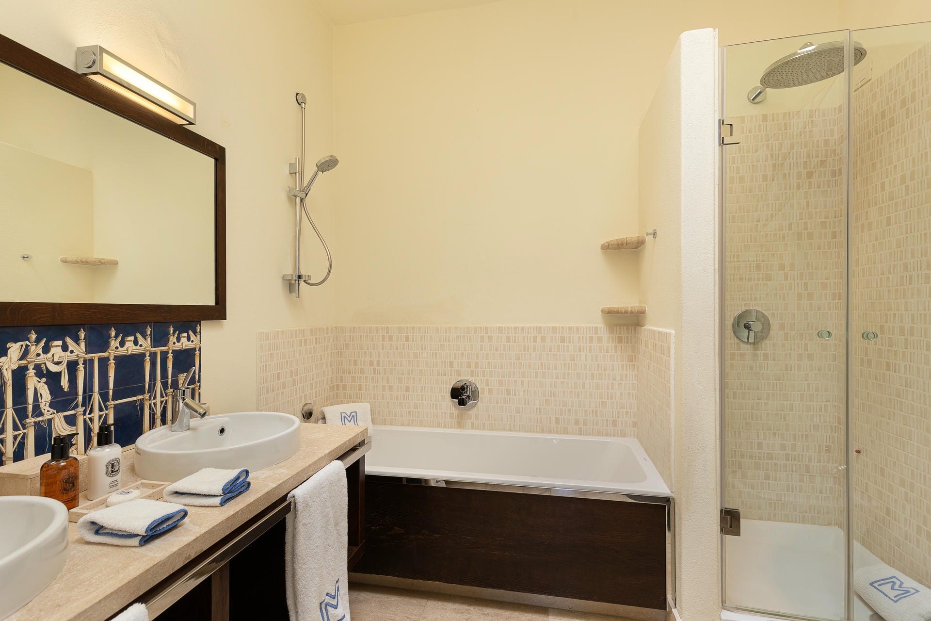 Bedroom 9 – double bed, en-suite bathroom with dual vanity, bathtub & separate shower, and private patio