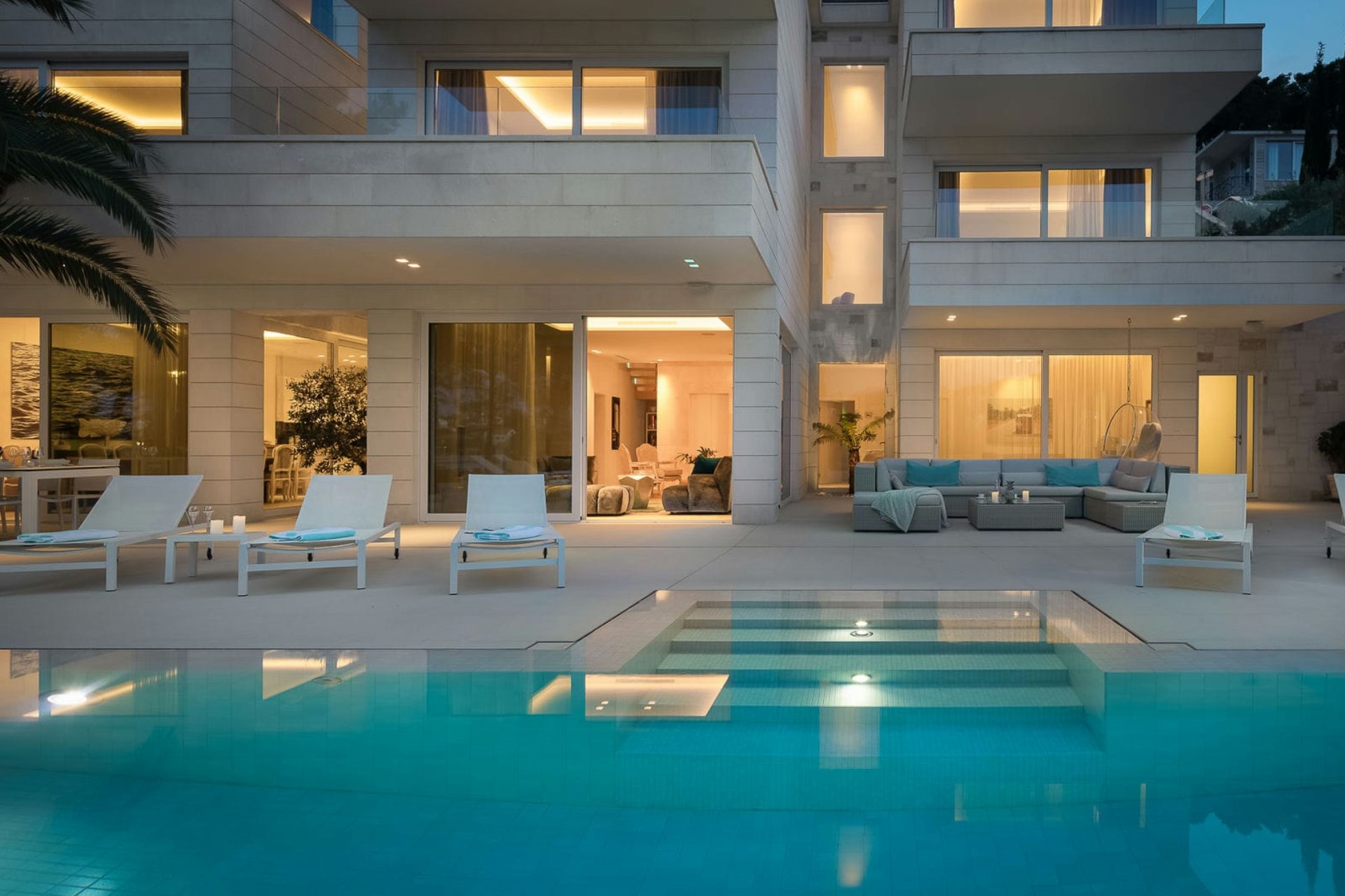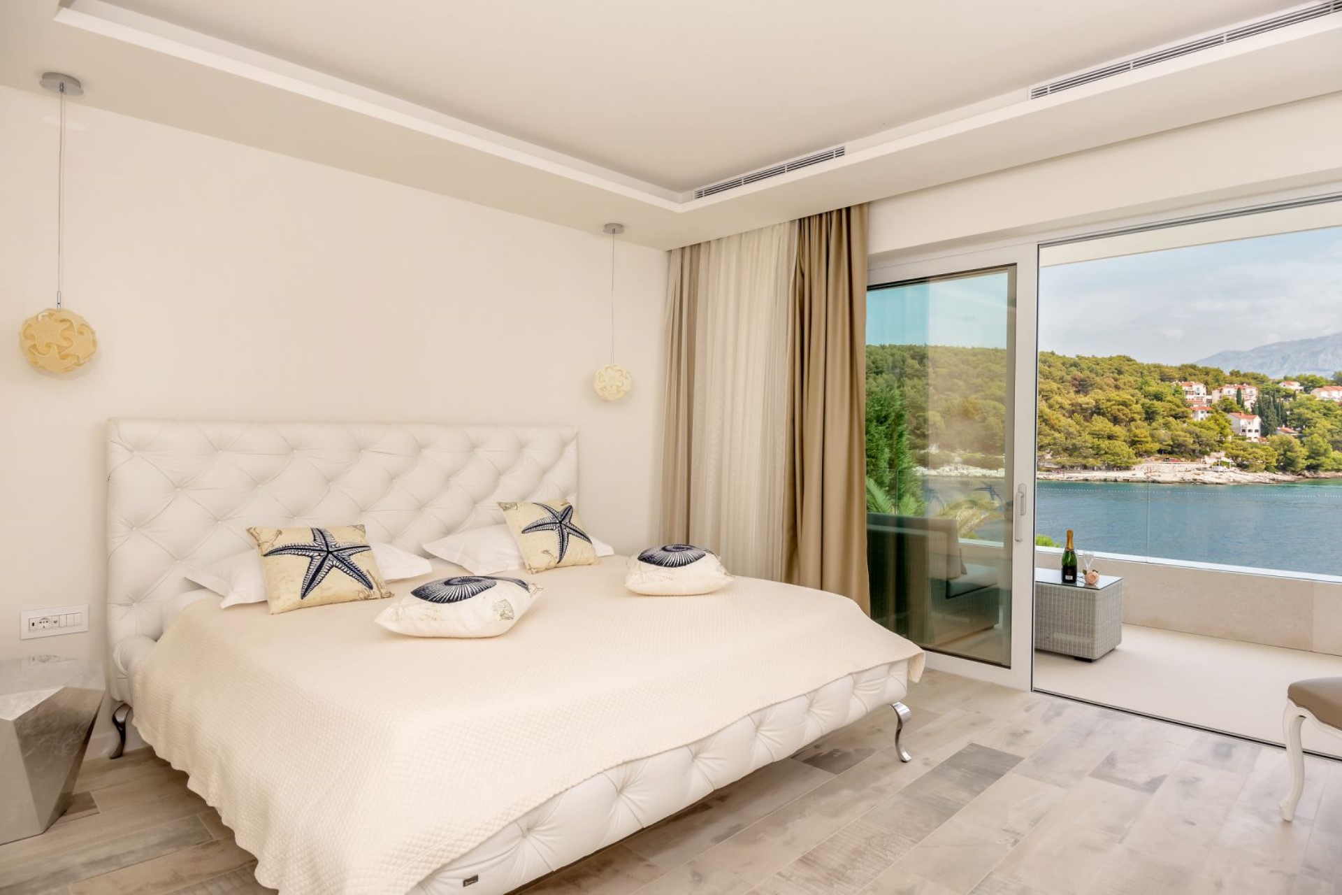 Situated on the waterfront of Sumartin – a small fishing village on the Croatian island of Brač – Villa Mila sleeps up to 12 guests in style and comfort. It enjoys views across the water to the village centre of Sumartin and is flanked by the impressive Biokovo Mountains behind. The luxury property is built entirely from the famous white stone of Brač and features a traditional stone roof, however the architecture and interior design are decidedly modern.