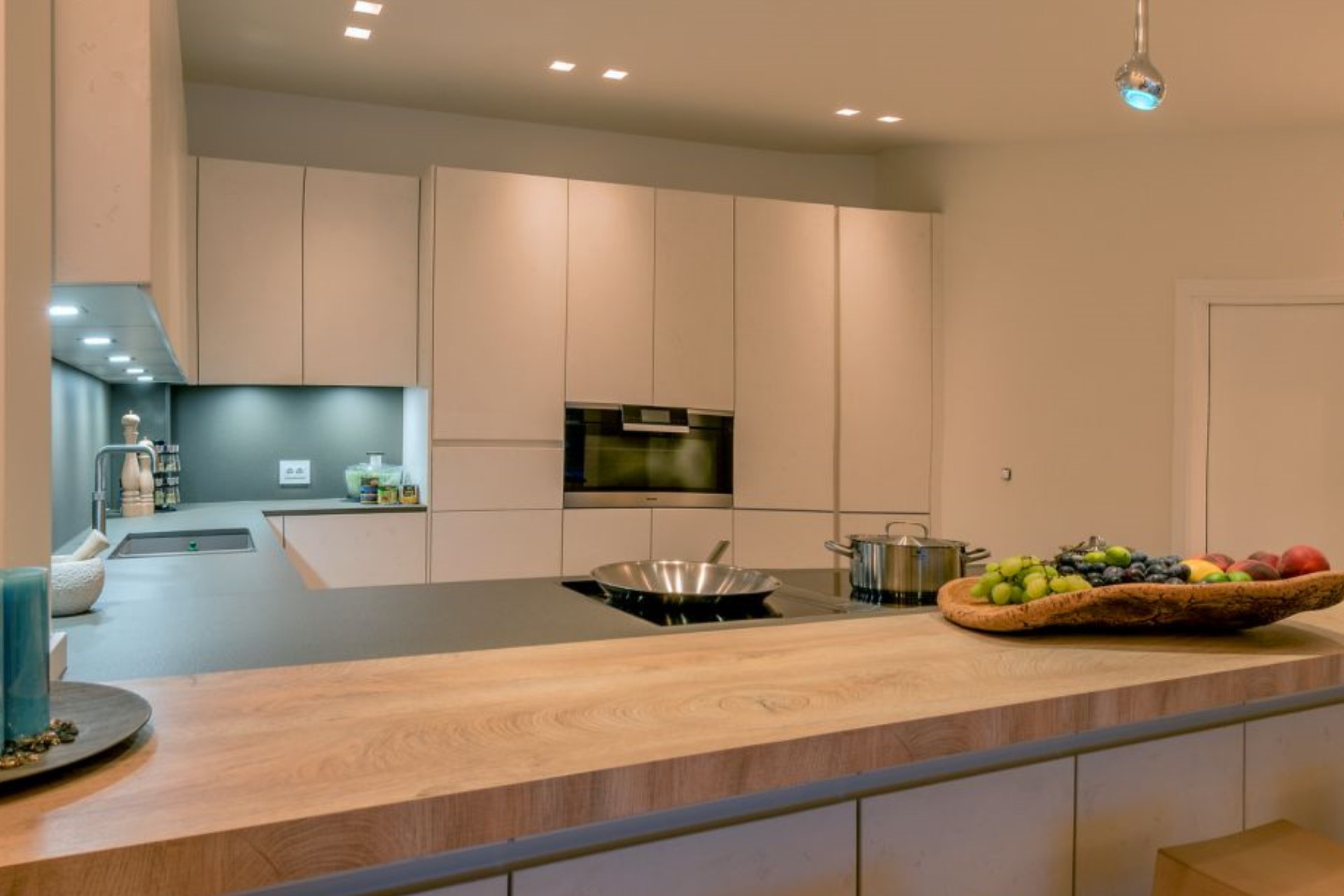 Creating a social atmosphere for meals with family and friends, the fully-equipped kitchen adjoins the dining room in an open-plan layout.