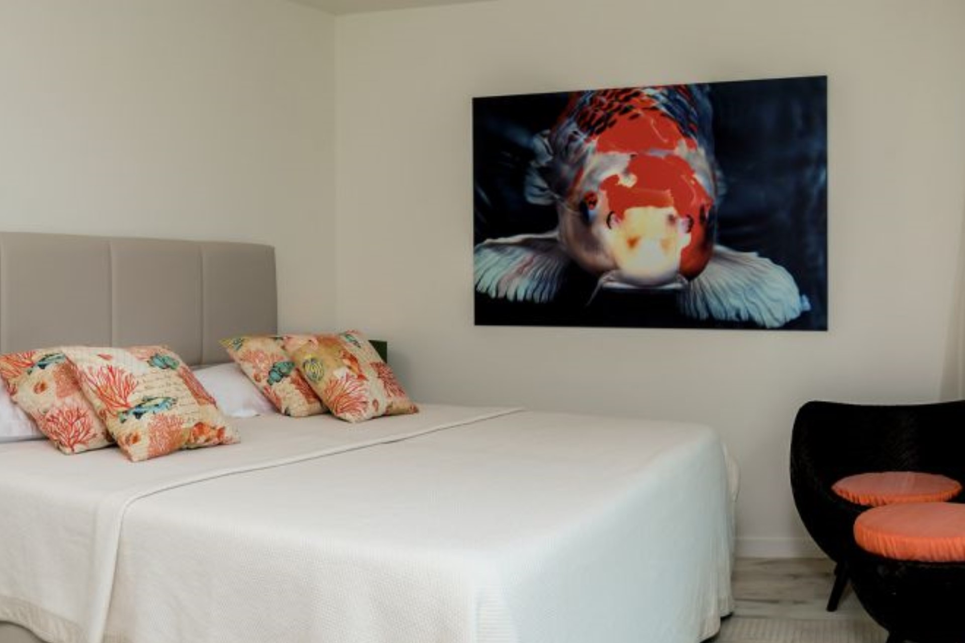 Bedroom 4 – king-size bed, dressing room, en-suite bathroom with bathtub & separate shower, and private balcony with sea views