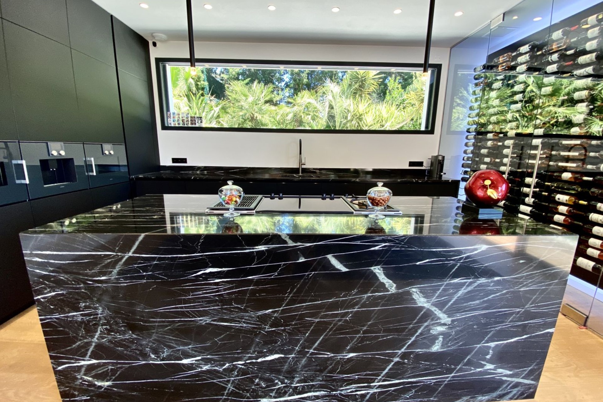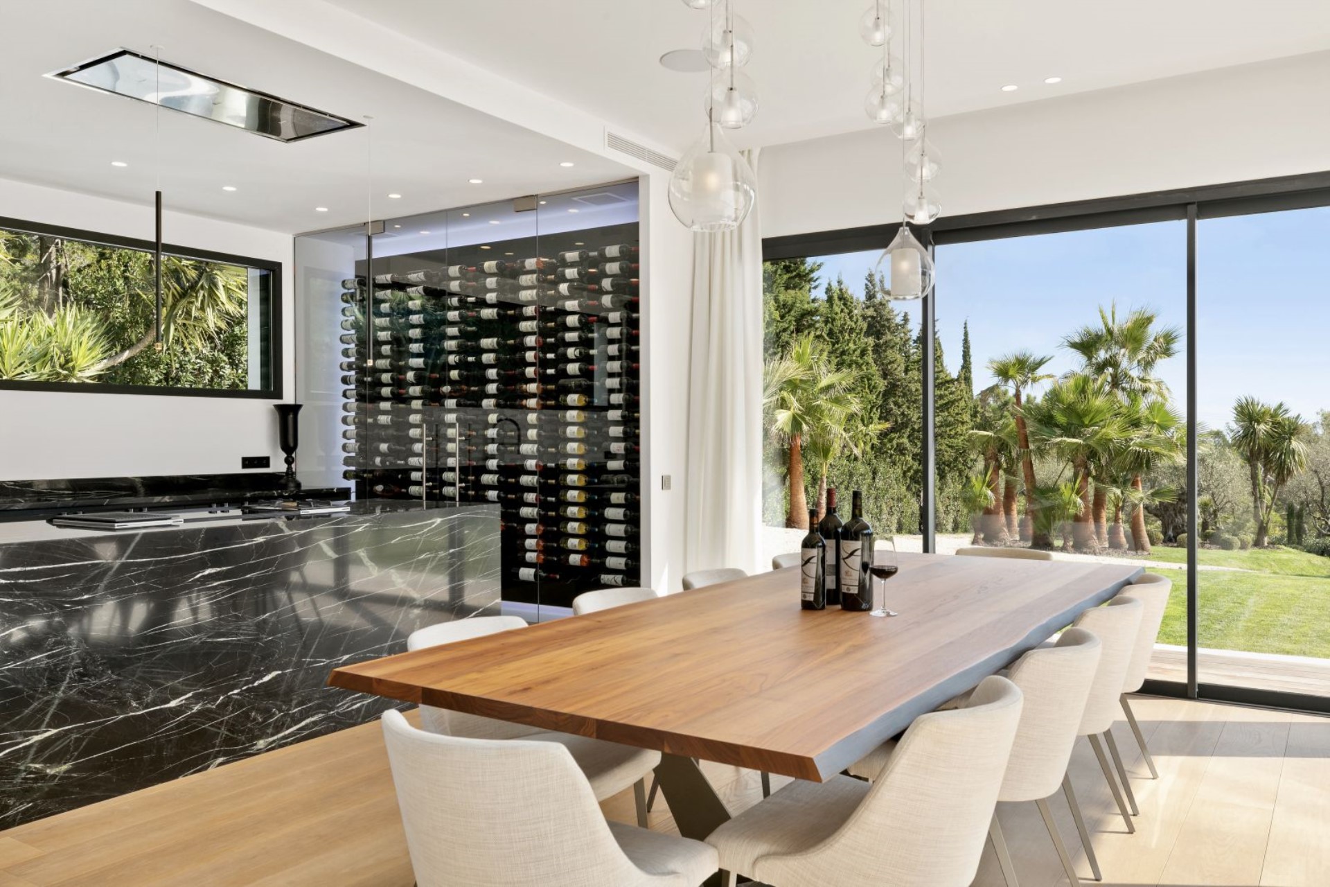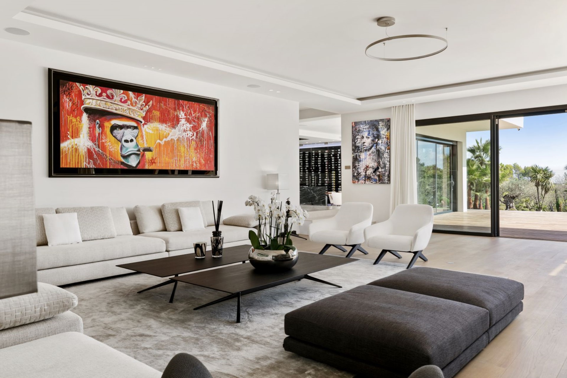 An open-plan living area features a spacious lounge with comfortable sofas and a large flatscreen TV, whilst vibrant modern artworks adorn the walls. This leads through to the dining area with an elegant dining table and gourmet kitchen. The kitchen is sure to impress any chef with its sleek onyx island, Gaggenau appliances, and a floor-to-ceiling, glass-encased wine rack.