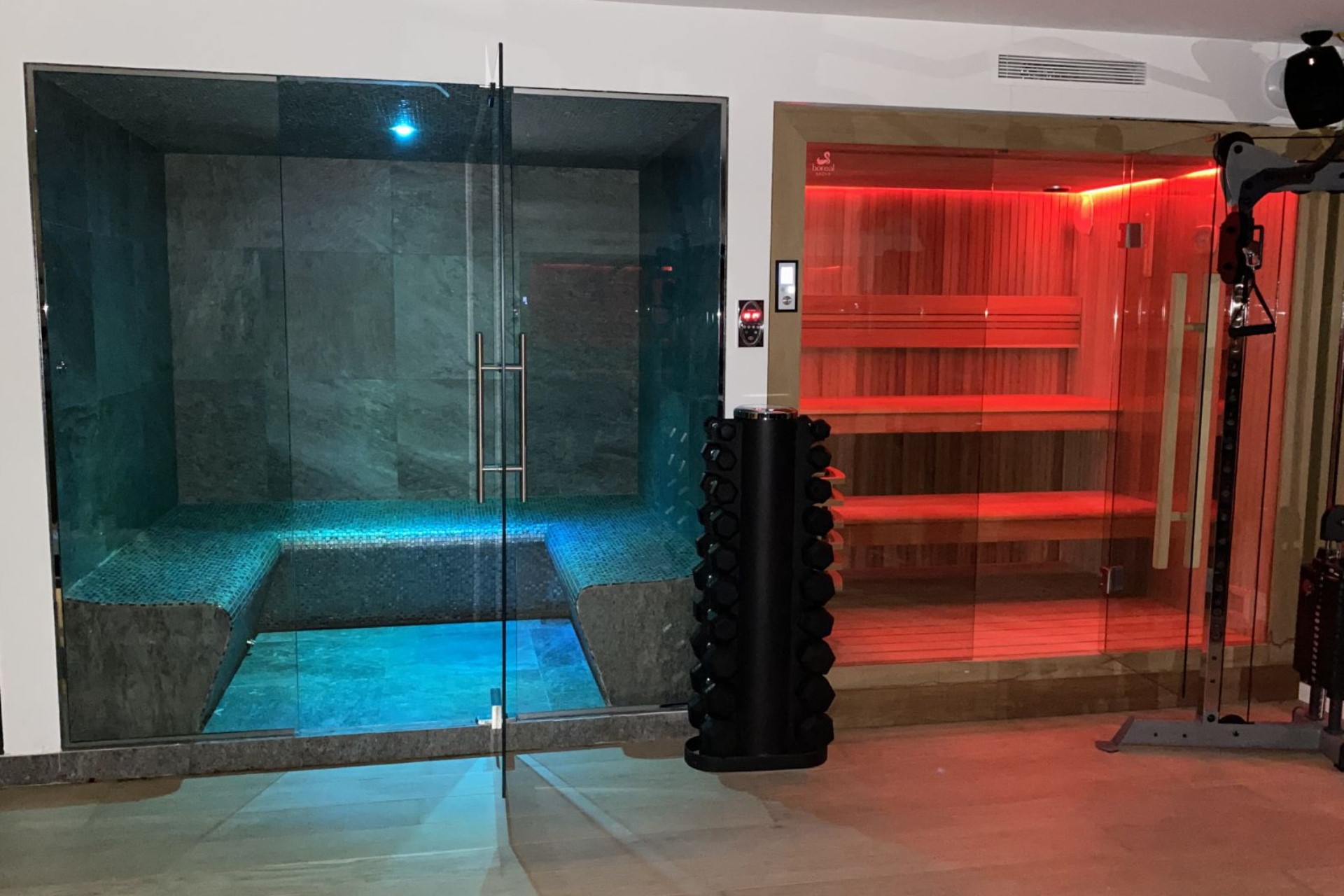 The basement level is dedicated to entertainment and recreation. A full cinema experience can be enjoyed in the home theatre, whilst the spacious games room hosts a pool table and table tennis set for guests’ enjoyment. Fitness fanatics will love the fully-equipped gym, and there’s a sauna and hammam to ease tired muscles post-workout.