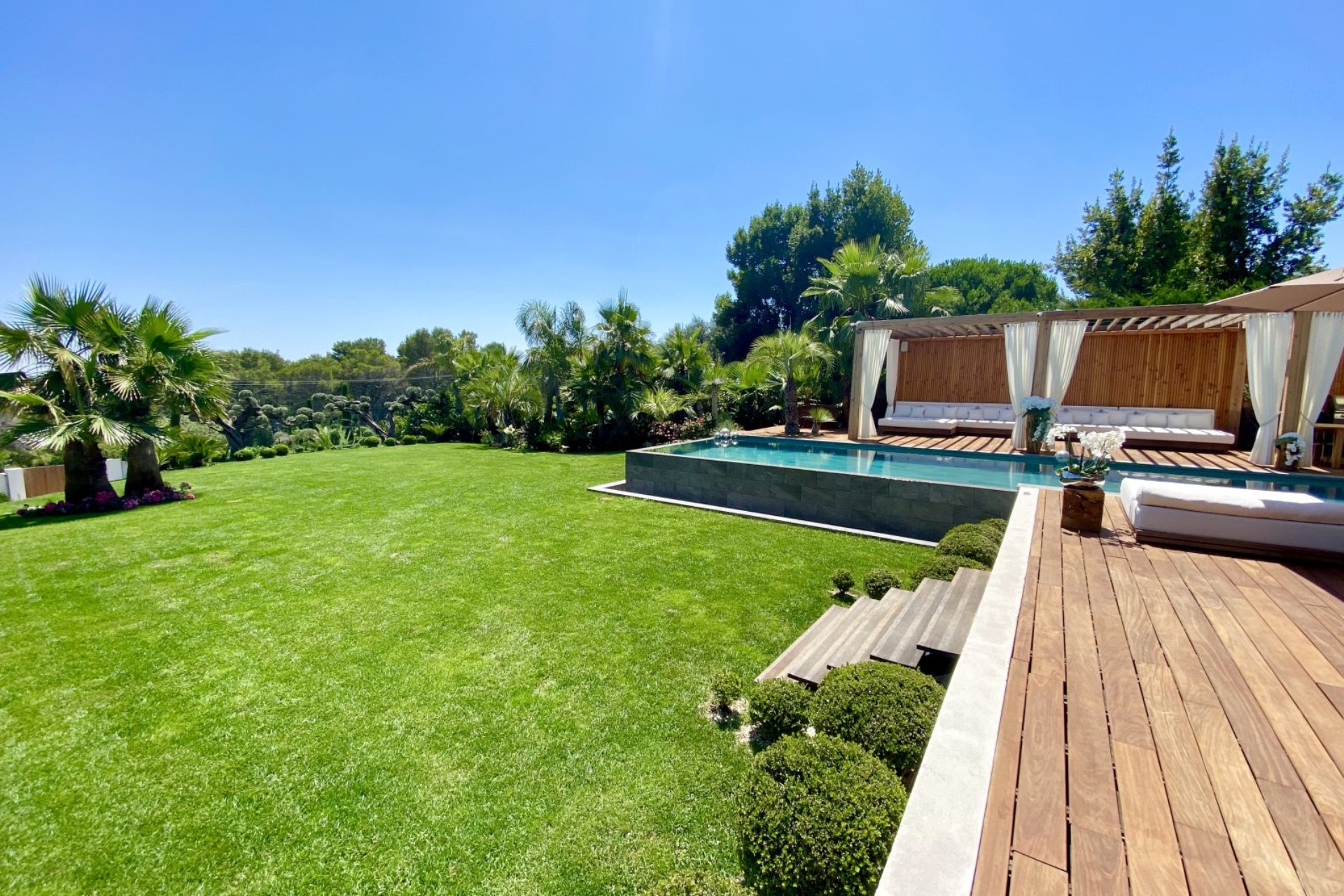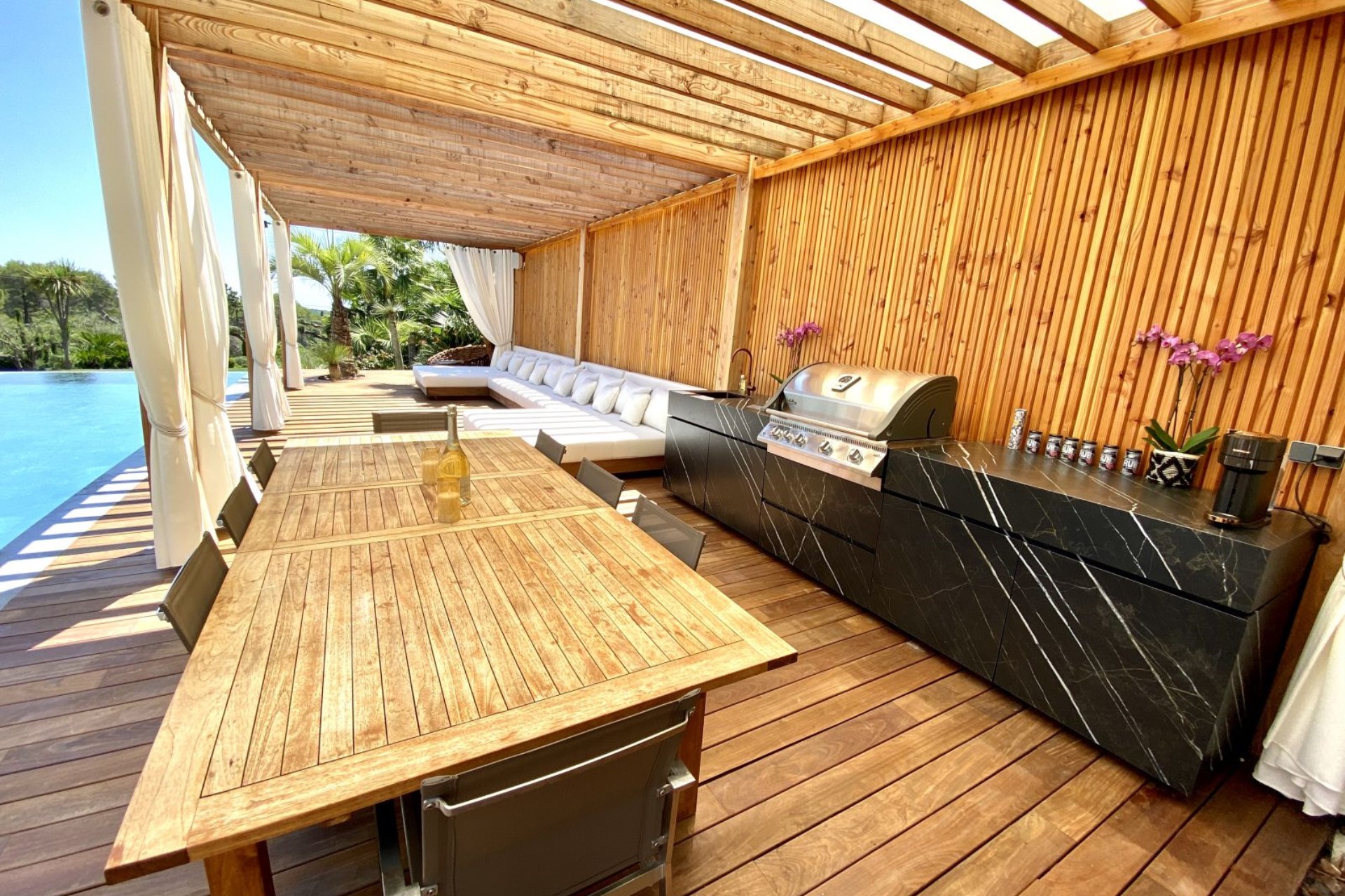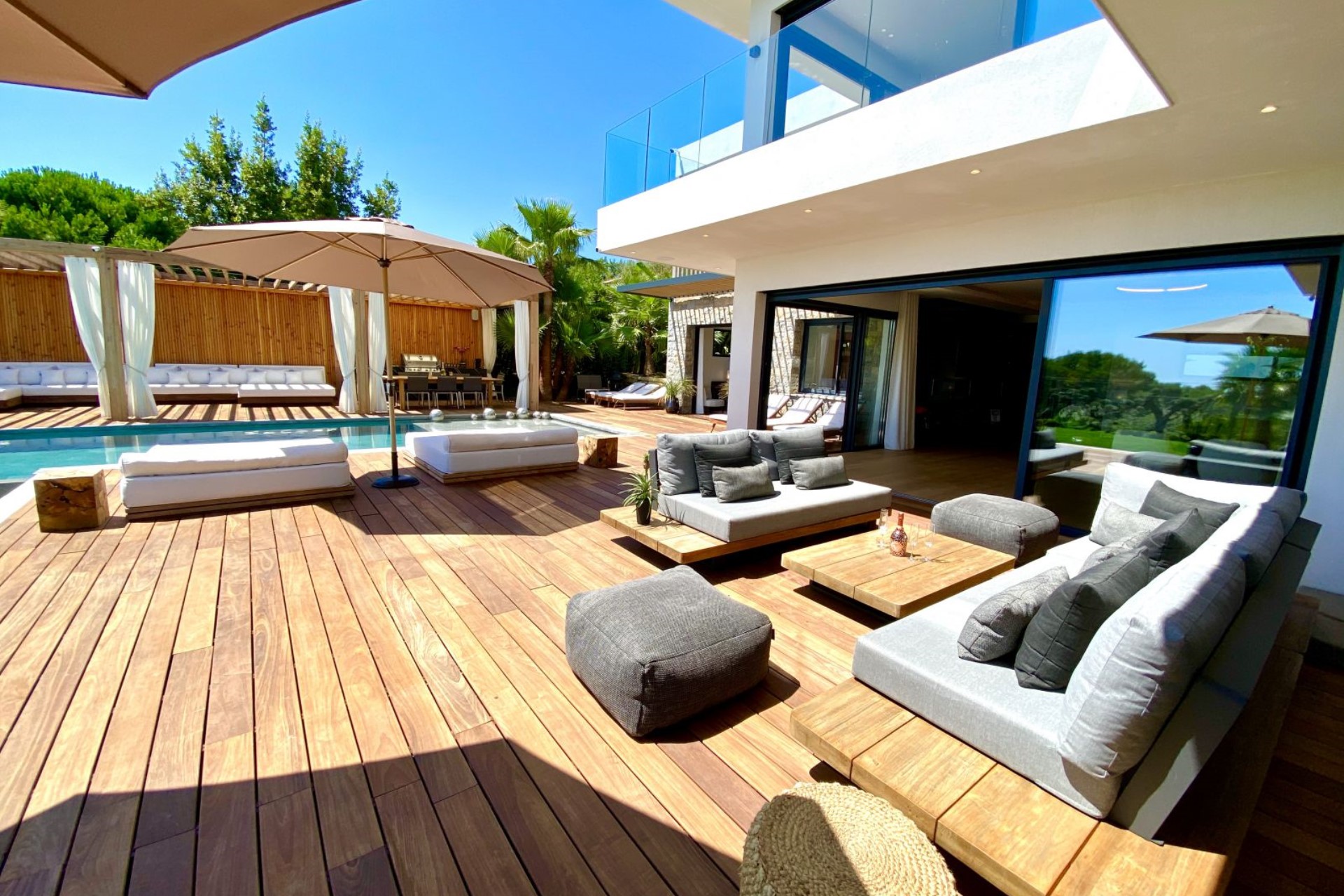 Within the 3000 m² gardens is a heated infinity swimming pool and vast terraces with various relaxation spaces. A poolside pergola shades plush seating, a large dining table and an outdoor kitchen with barbecue, perfect for entertaining. On the other side of the pool is another comfortable lounge area, and there are sun loungers and day beds shaded by sun umbrellas dotted across the terrace.