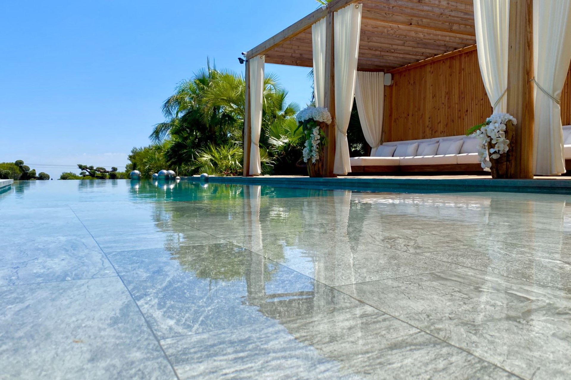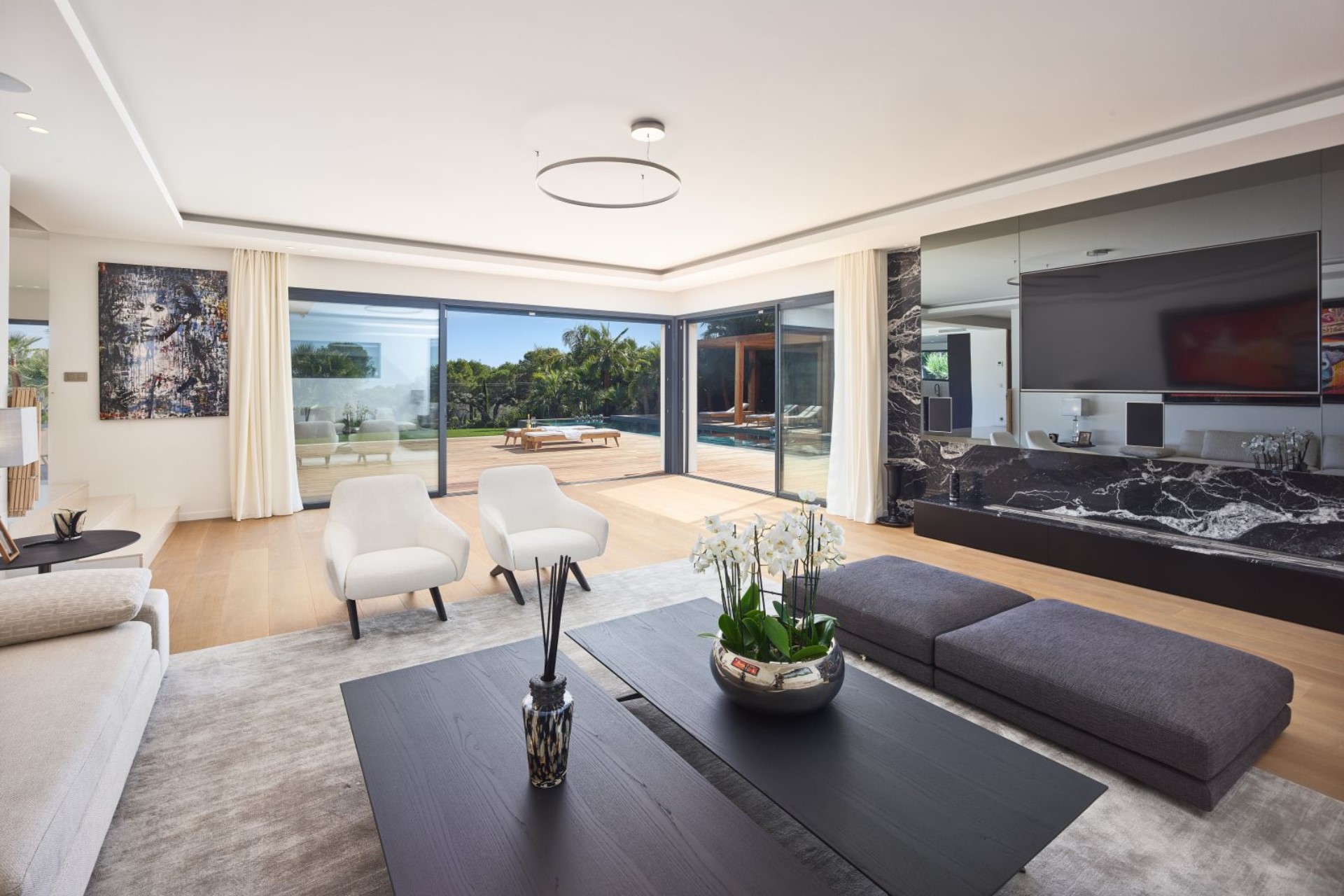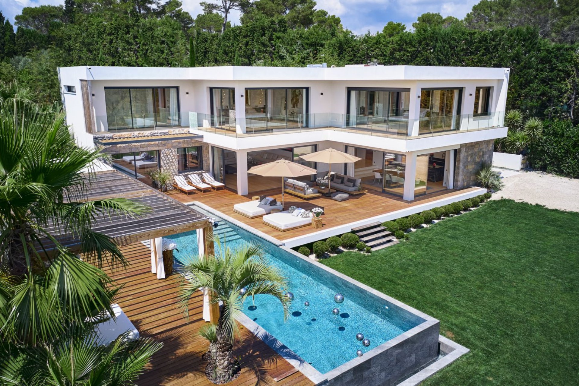 Within the 3000 m² gardens is a heated infinity swimming pool and vast terraces with various relaxation spaces. A poolside pergola shades plush seating, a large dining table and an outdoor kitchen with barbecue, perfect for entertaining. On the other side of the pool is another comfortable lounge area, and there are sun loungers and day beds shaded by sun umbrellas dotted across the terrace.