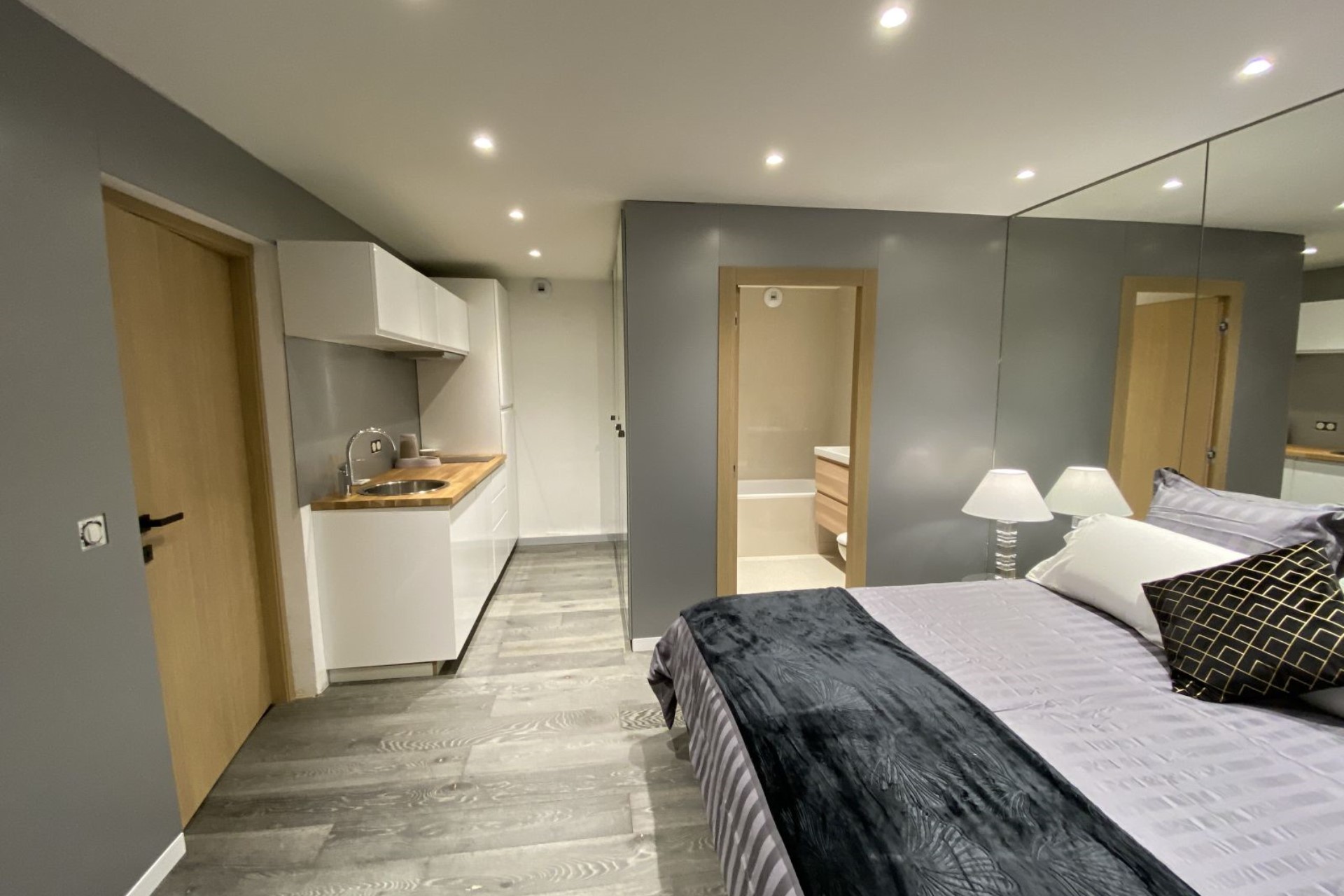 Bedroom 6 (Studio) – king-size bed, kitchenette, and en-suite bathroom with bathtub/shower