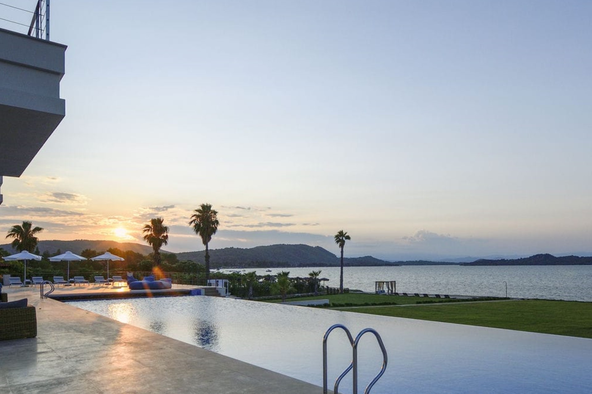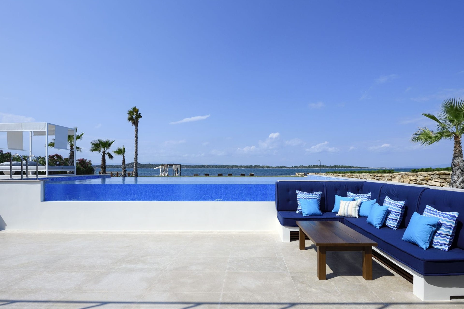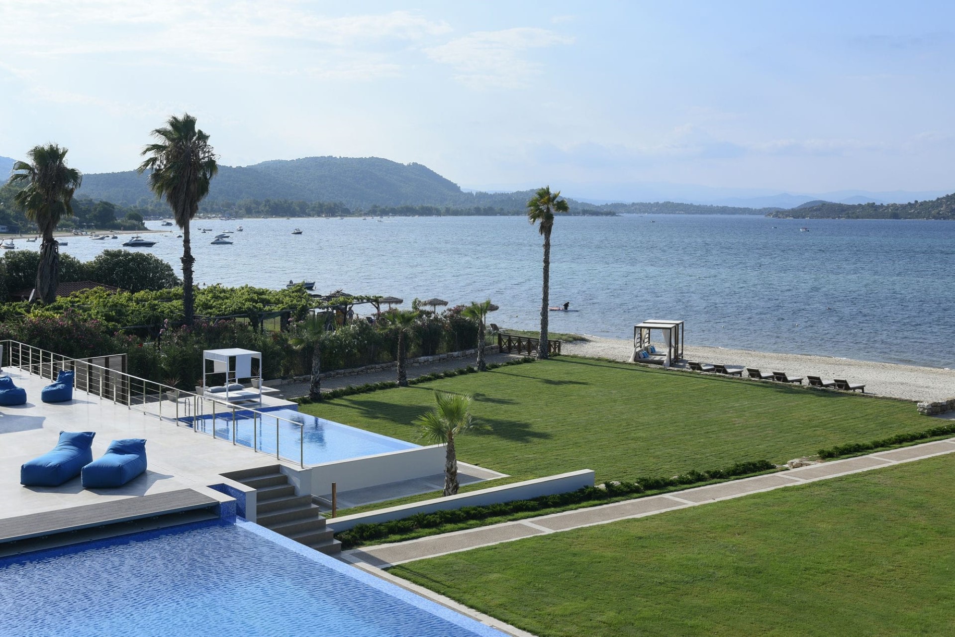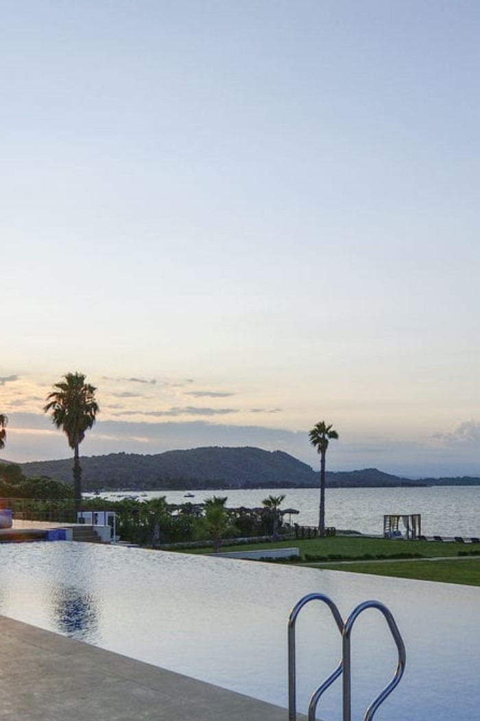 Overlooking the sandy beach and beautiful Diaporos Island beyond is an Olympic-sized infinity pool. It offers the perfect place to cool off in the heat of the day before relaxing on the surrounding sun loungers to top up a tan or enjoy a poolside cocktail.