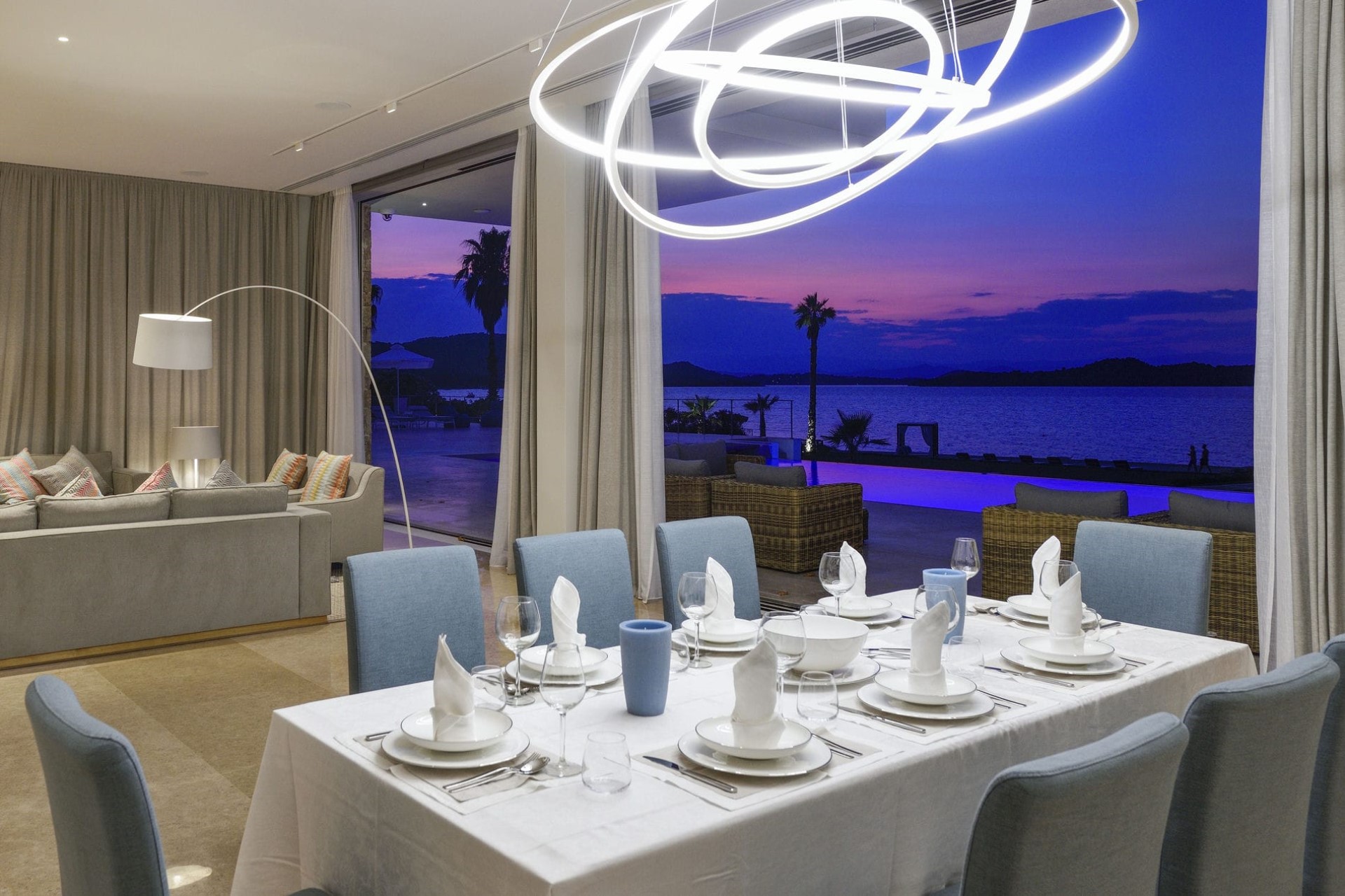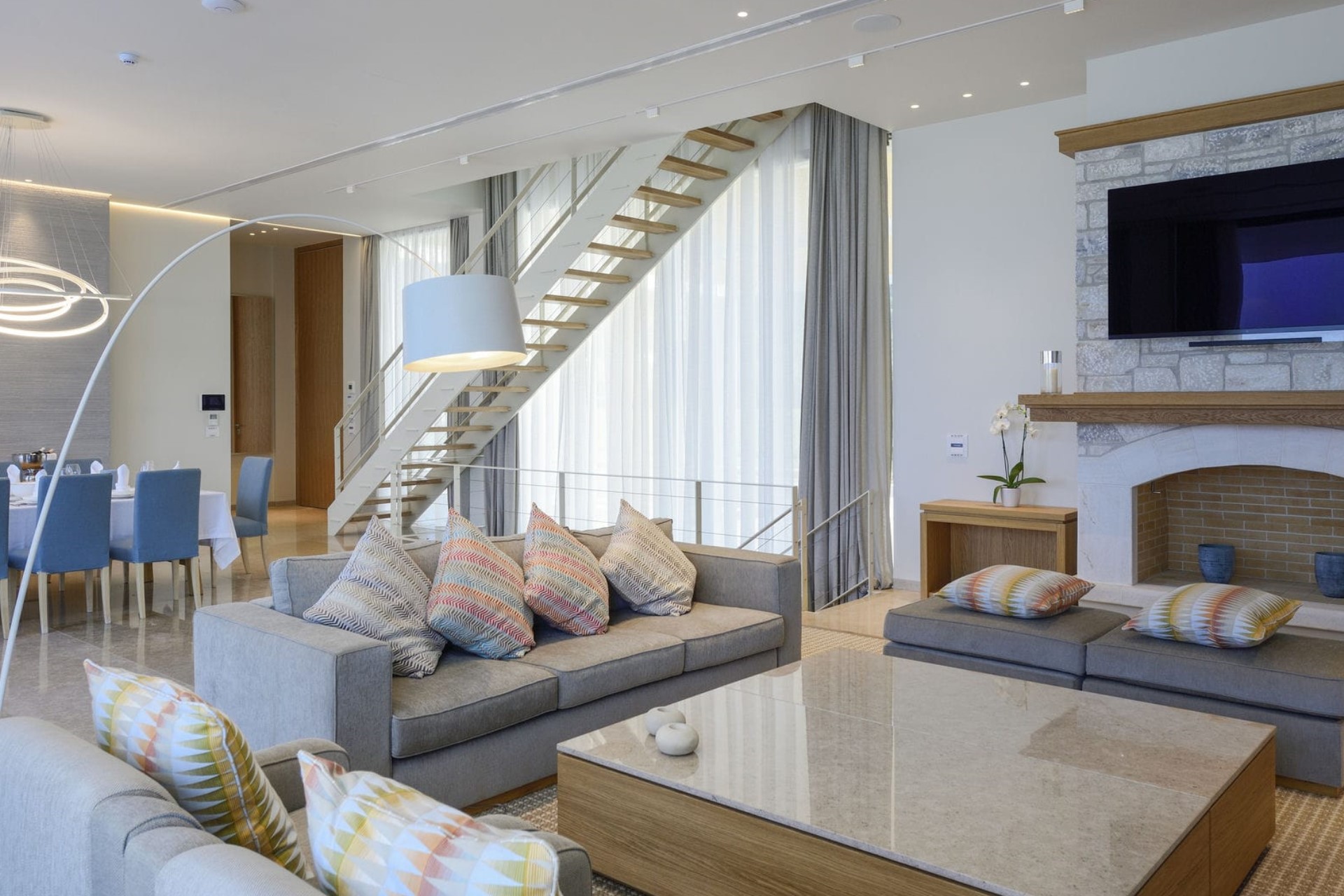 The main living space on the ground floor features a lounge area with a large flatscreen TV and an elegant dining setting under impressive statement lighting.