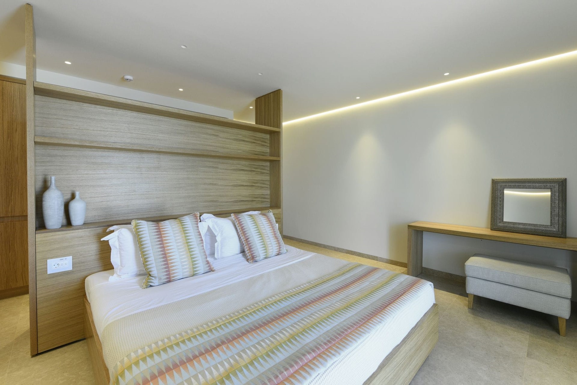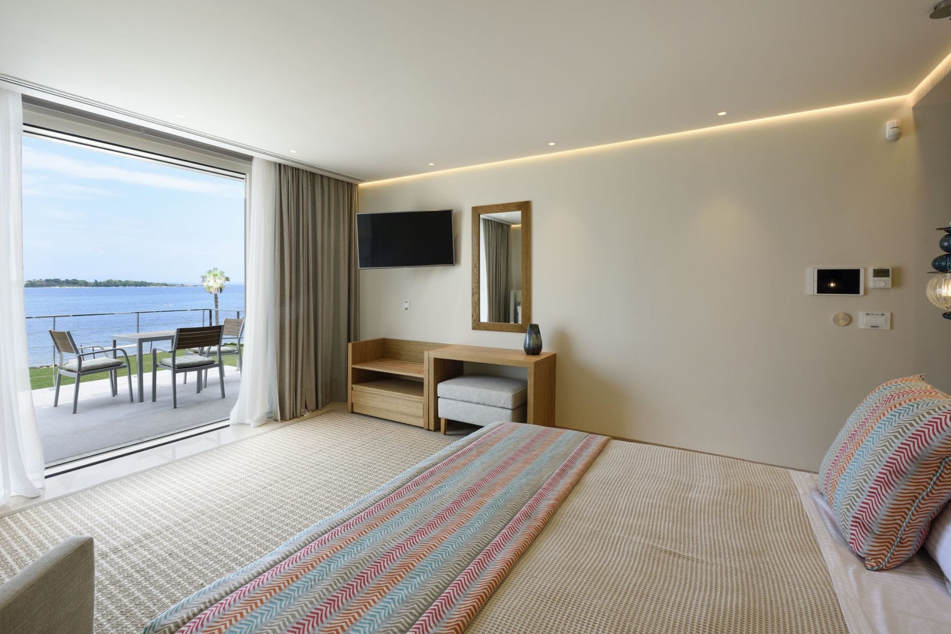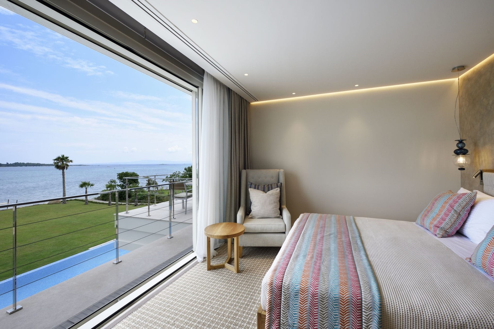 Master Bedroom – king-size bed, en-suite bathroom with dual vanity & shower, and private balcony with sea views