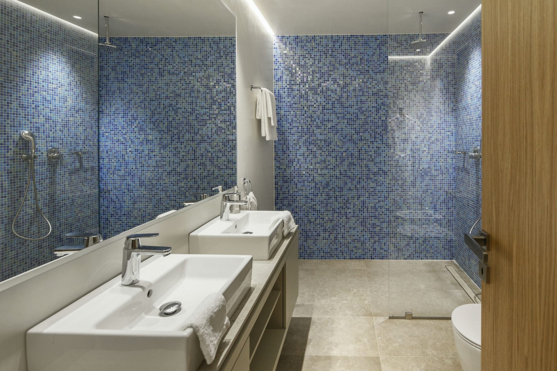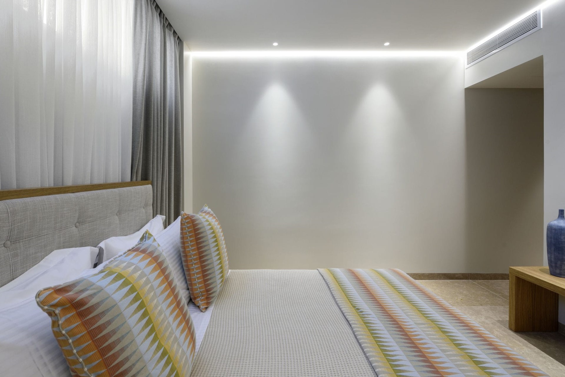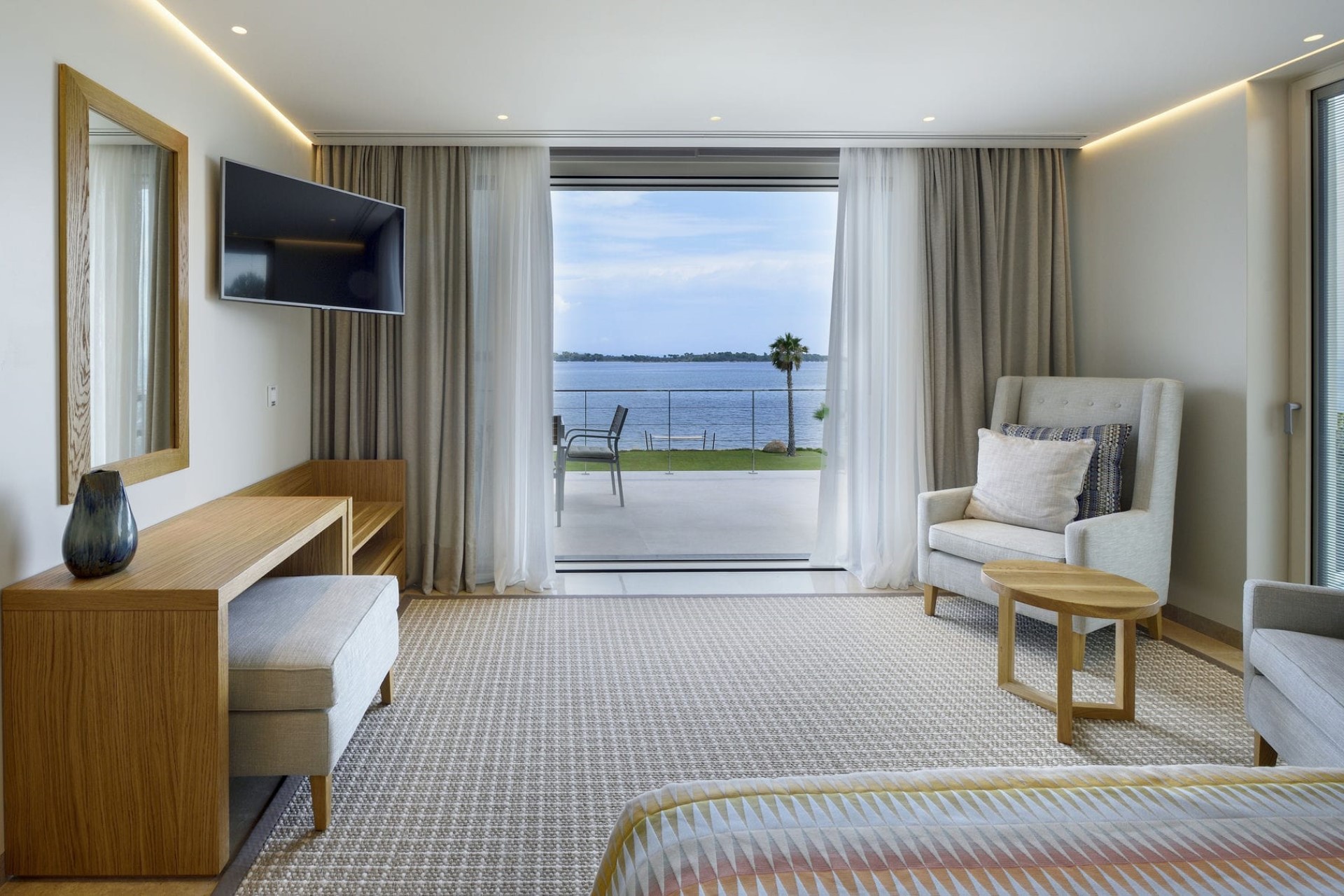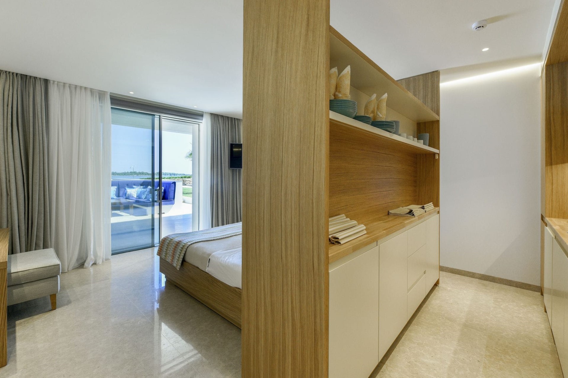 Master Bedroom – king-size bed, en-suite bathroom with dual vanity & shower, and private balcony with sea views