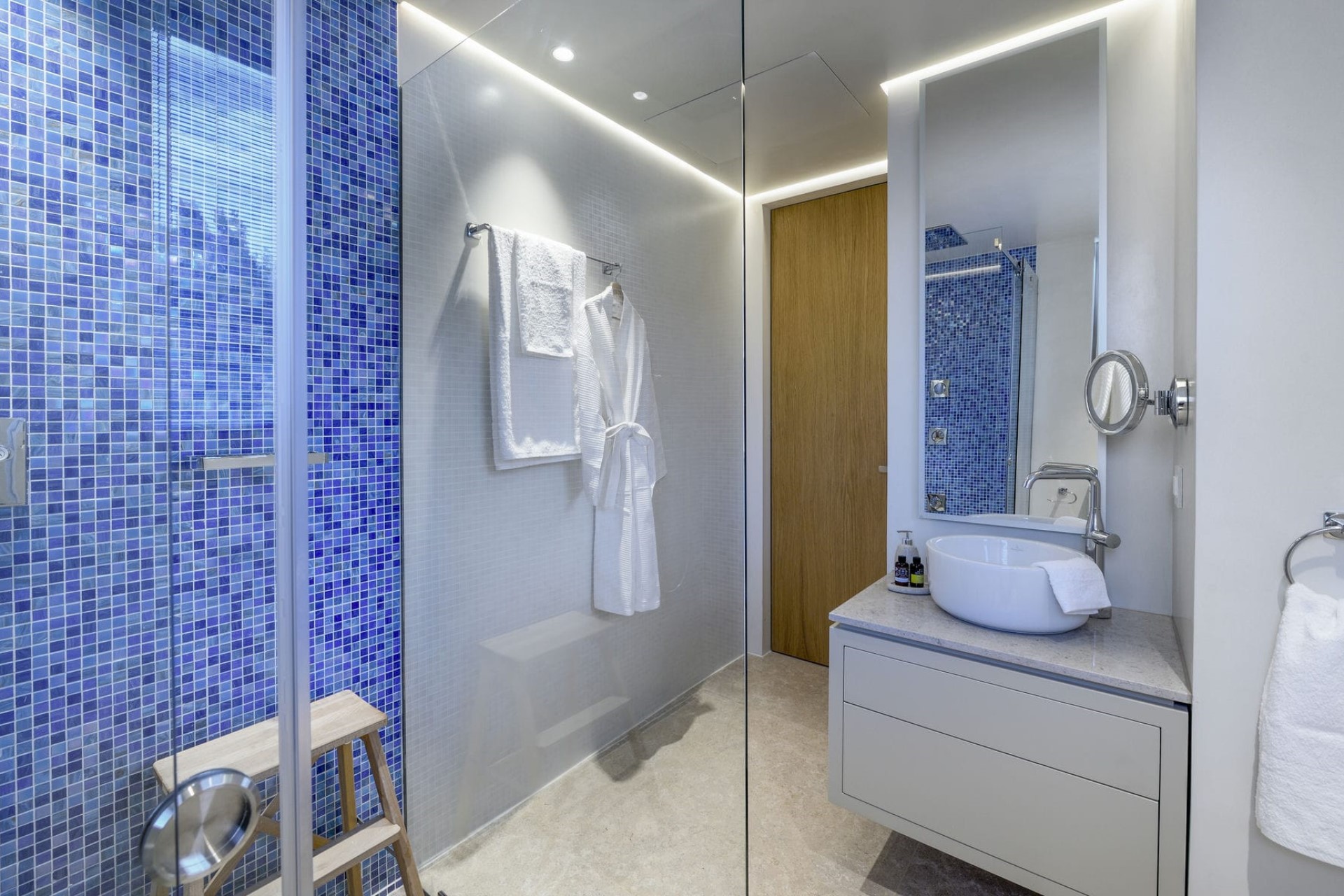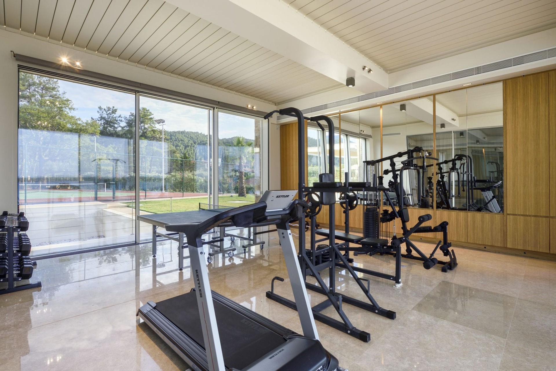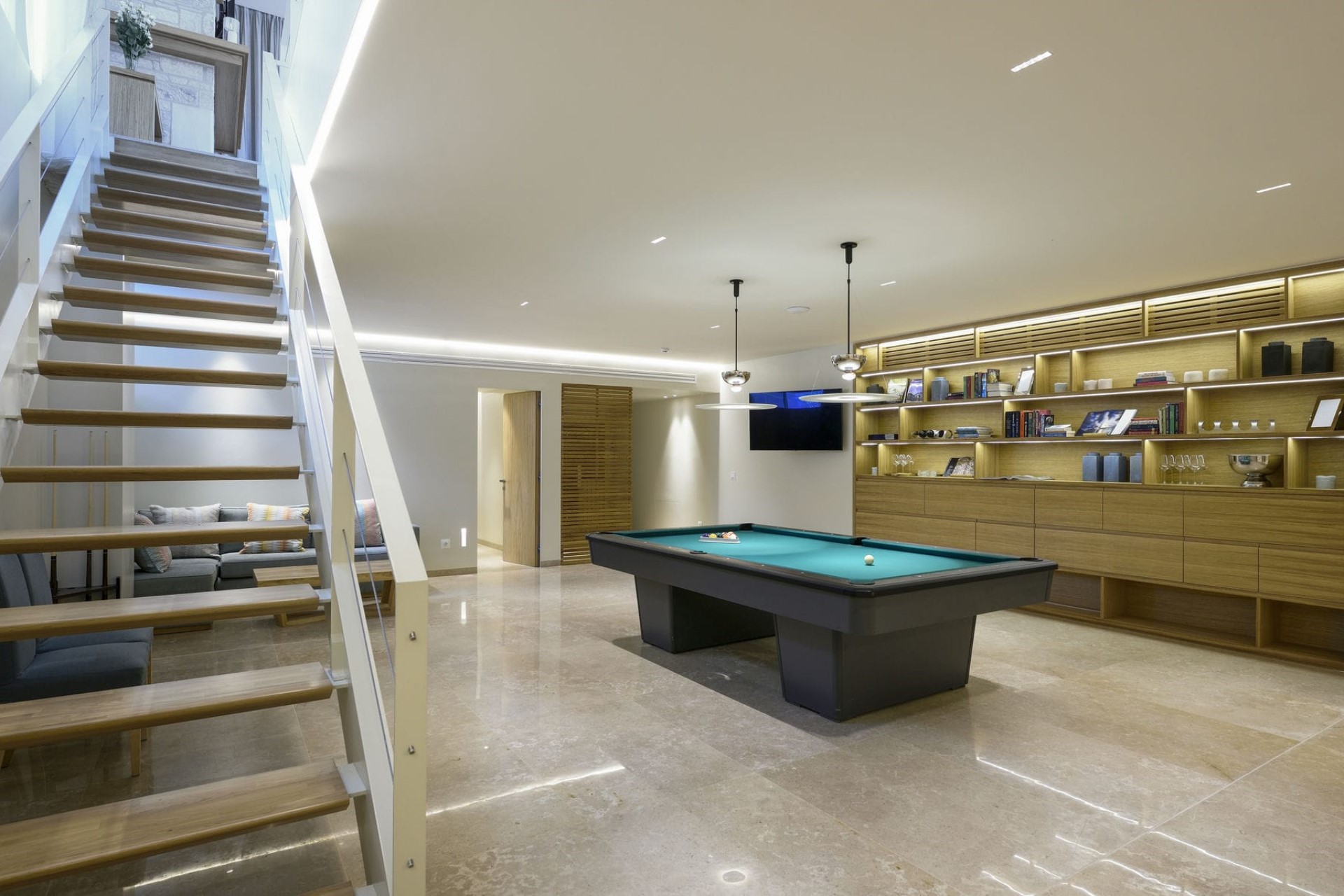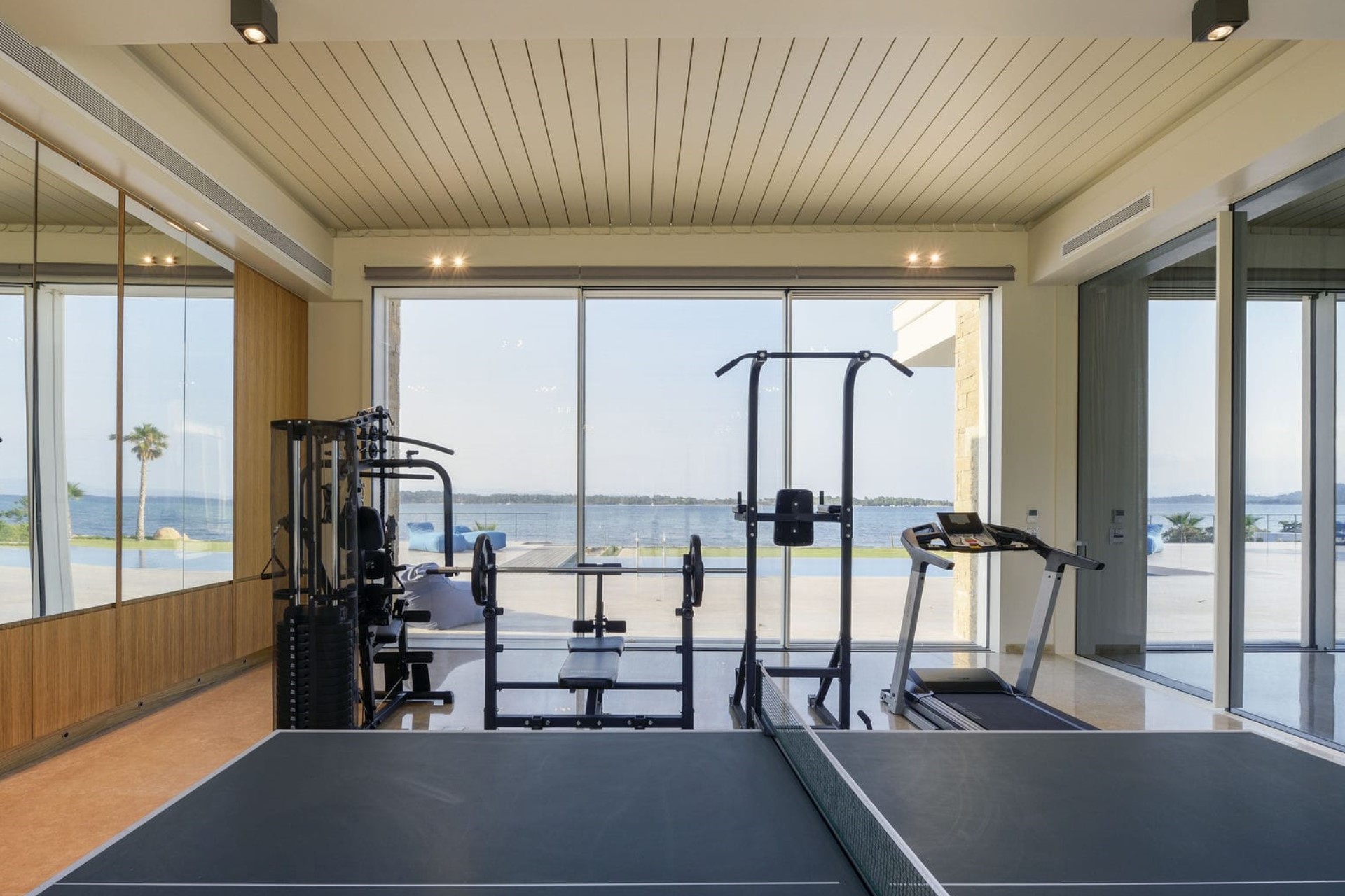 Indoors, the entertainment continues with a games room with a pool table, a table tennis set, a sea-view gym, and a sauna for post-workout relaxation.