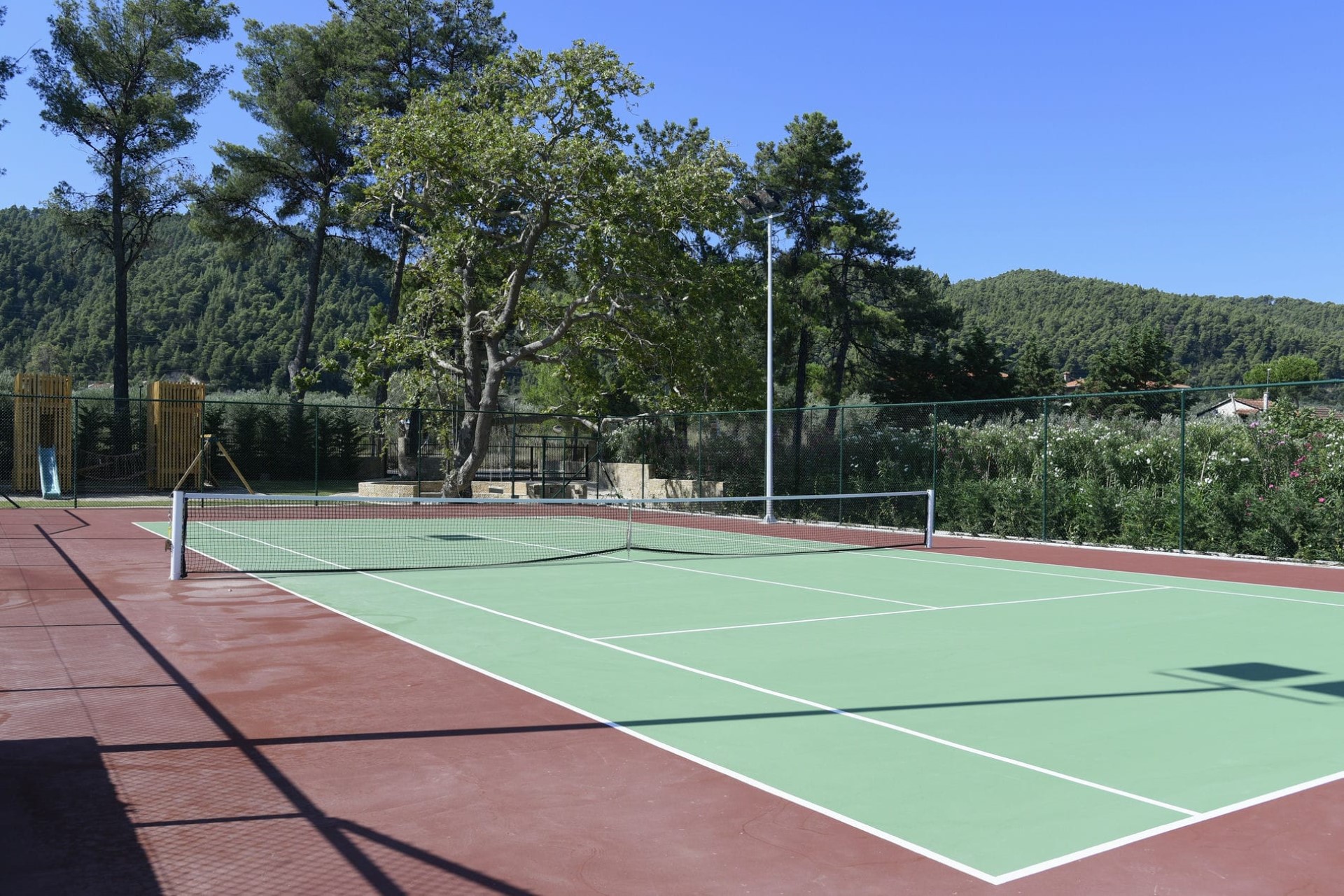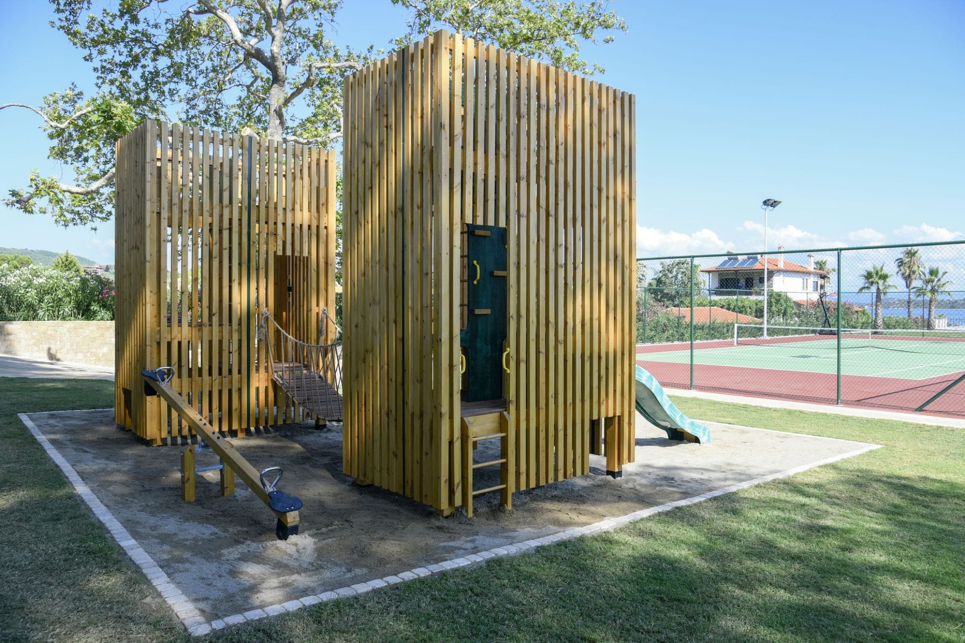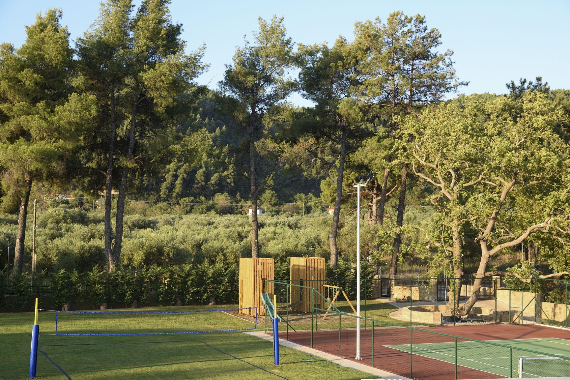 In addition, there is a second, smaller pool perfect for kids to splash around in. When it comes to keeping younger guests entertained, the villa’s expansive grounds also boast a tennis court, a volleyball court, football nets, a children’s playground, and vast lawns perfect for sports and games.
