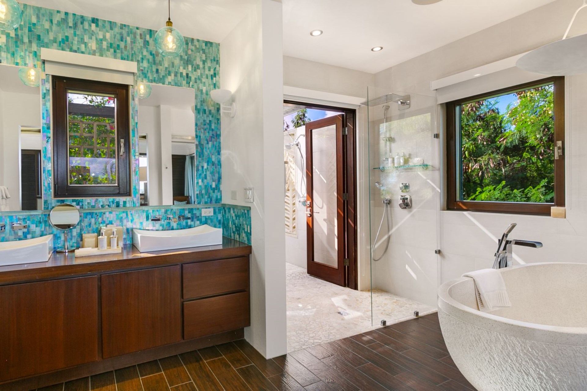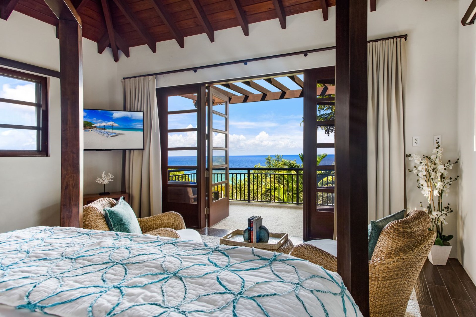 Aquamarine Suite (Master 2) – king-size bed, en-suite bathroom with outdoor shower, and private deck with ocean view
