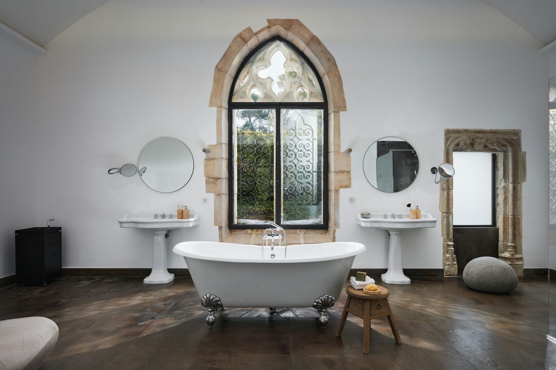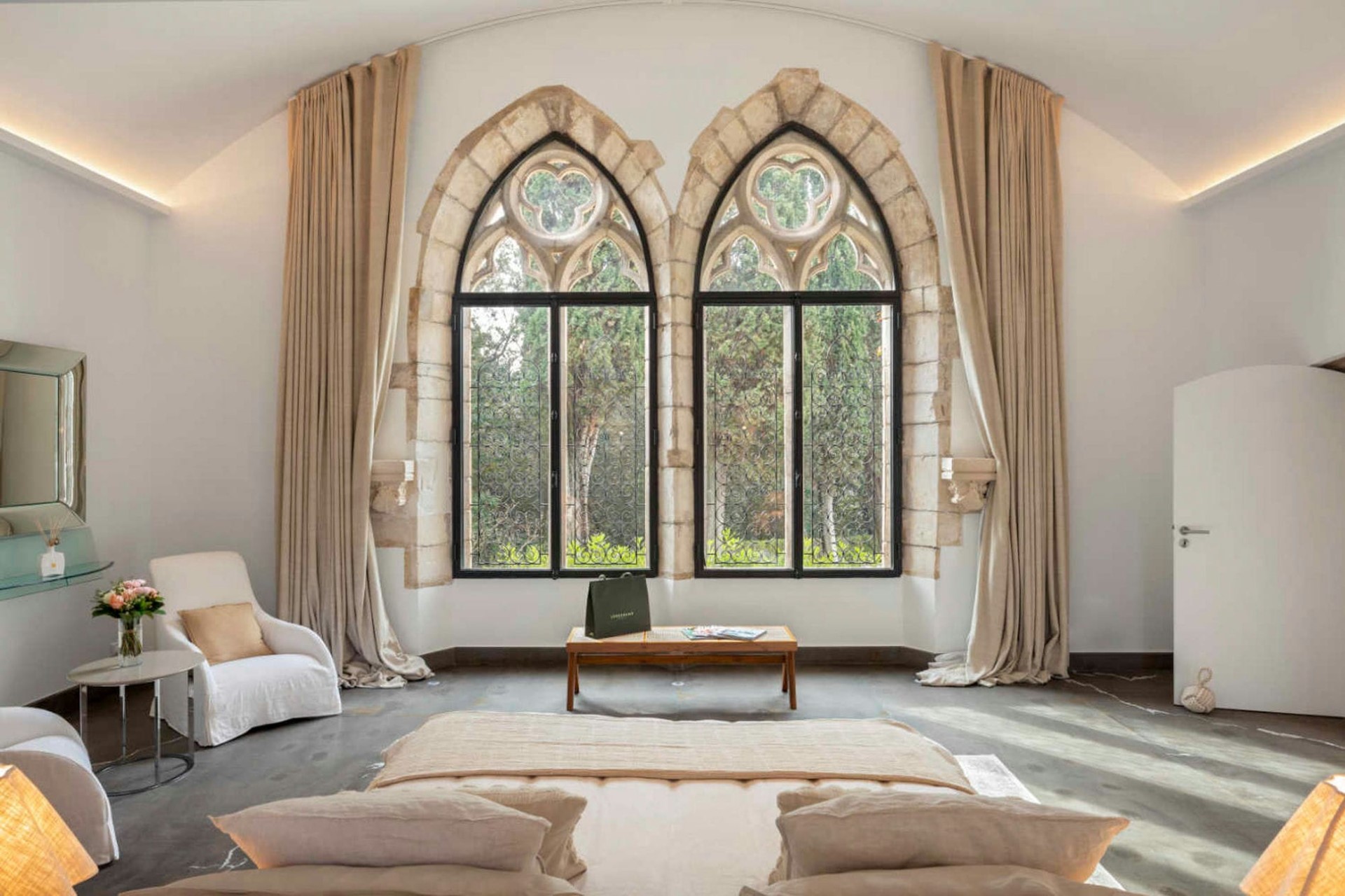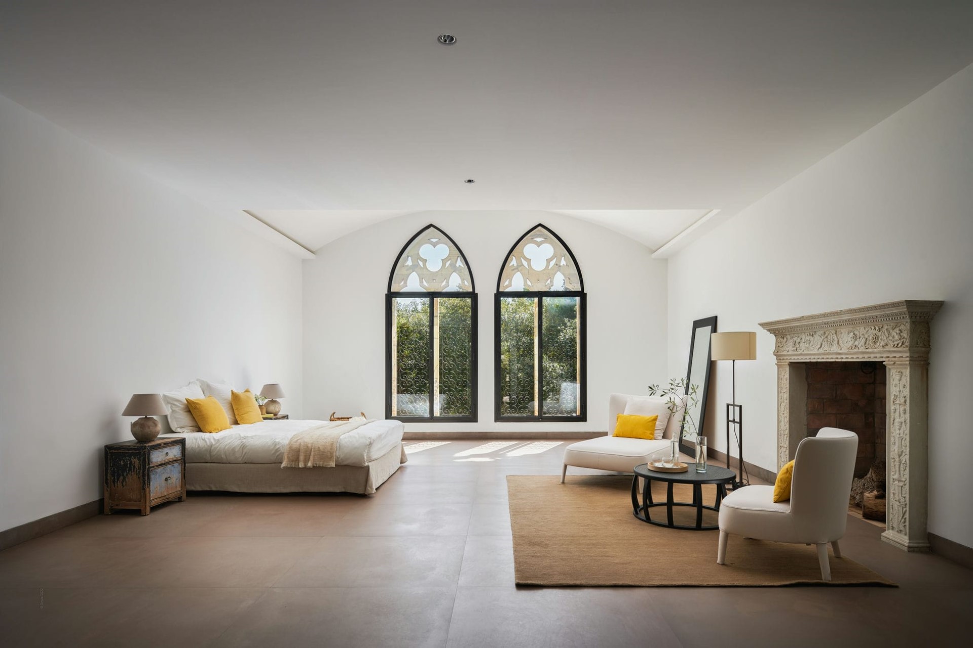 The villa interiors seamlessly blend the authenticity of its medieval origins with the sleek minimalism of contemporary design. Original abbey windows, soaring ceilings, and exposed stone walls offer a glimpse into the past, while the carefully curated furnishings and modern amenities ensure an unparalleled level of comfort.