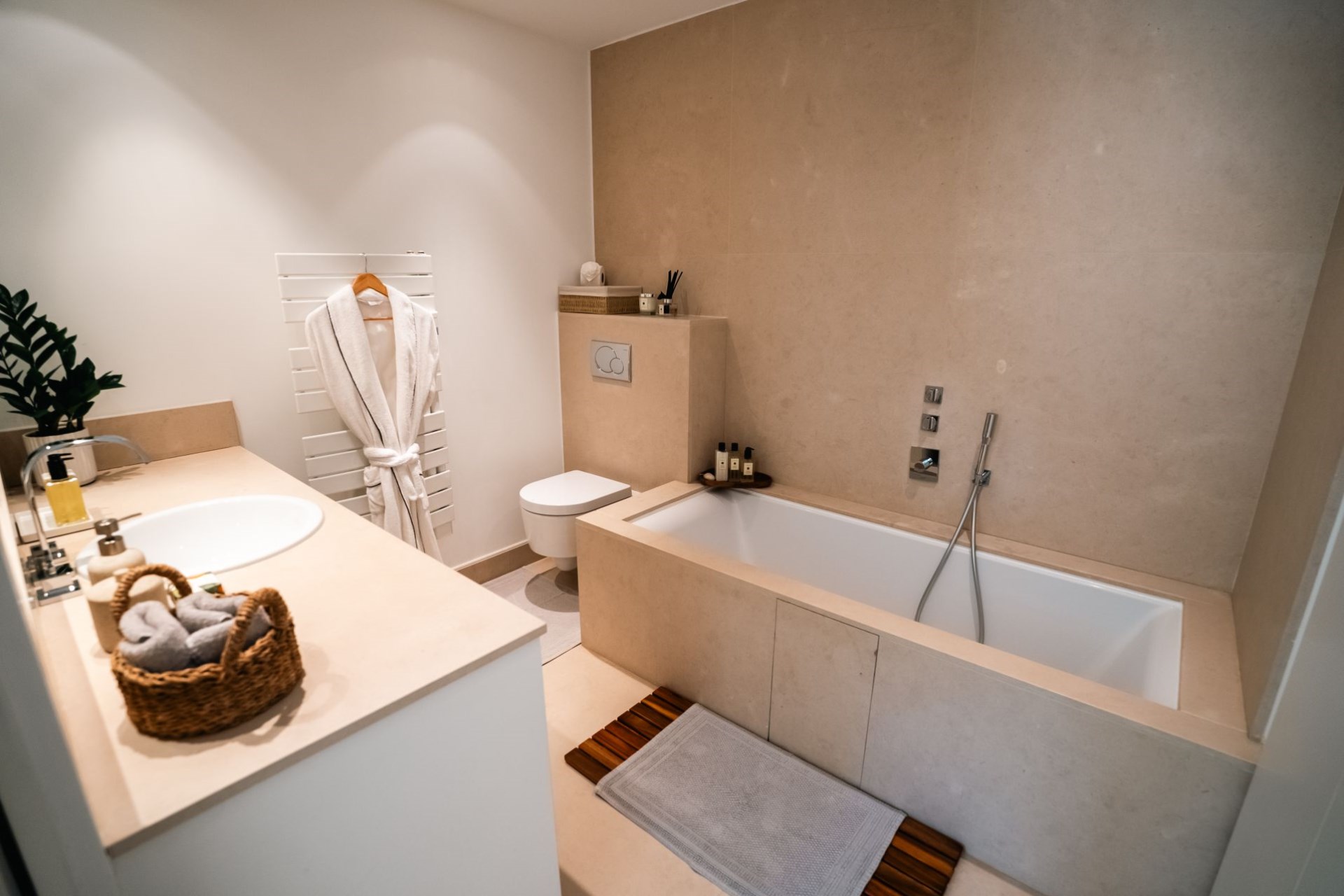 Junior Suite 1 – double bed and en-suite bathroom with bathtub