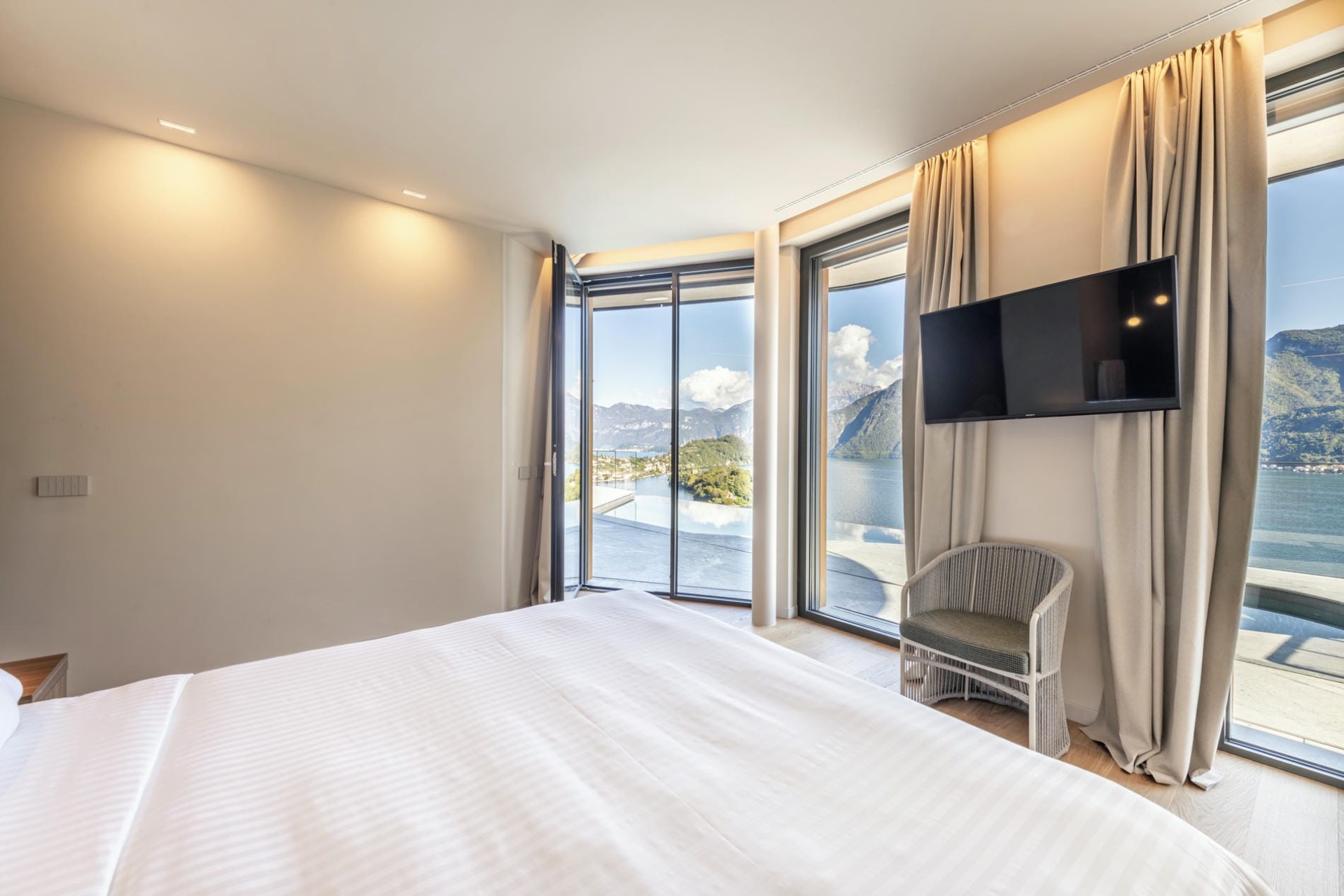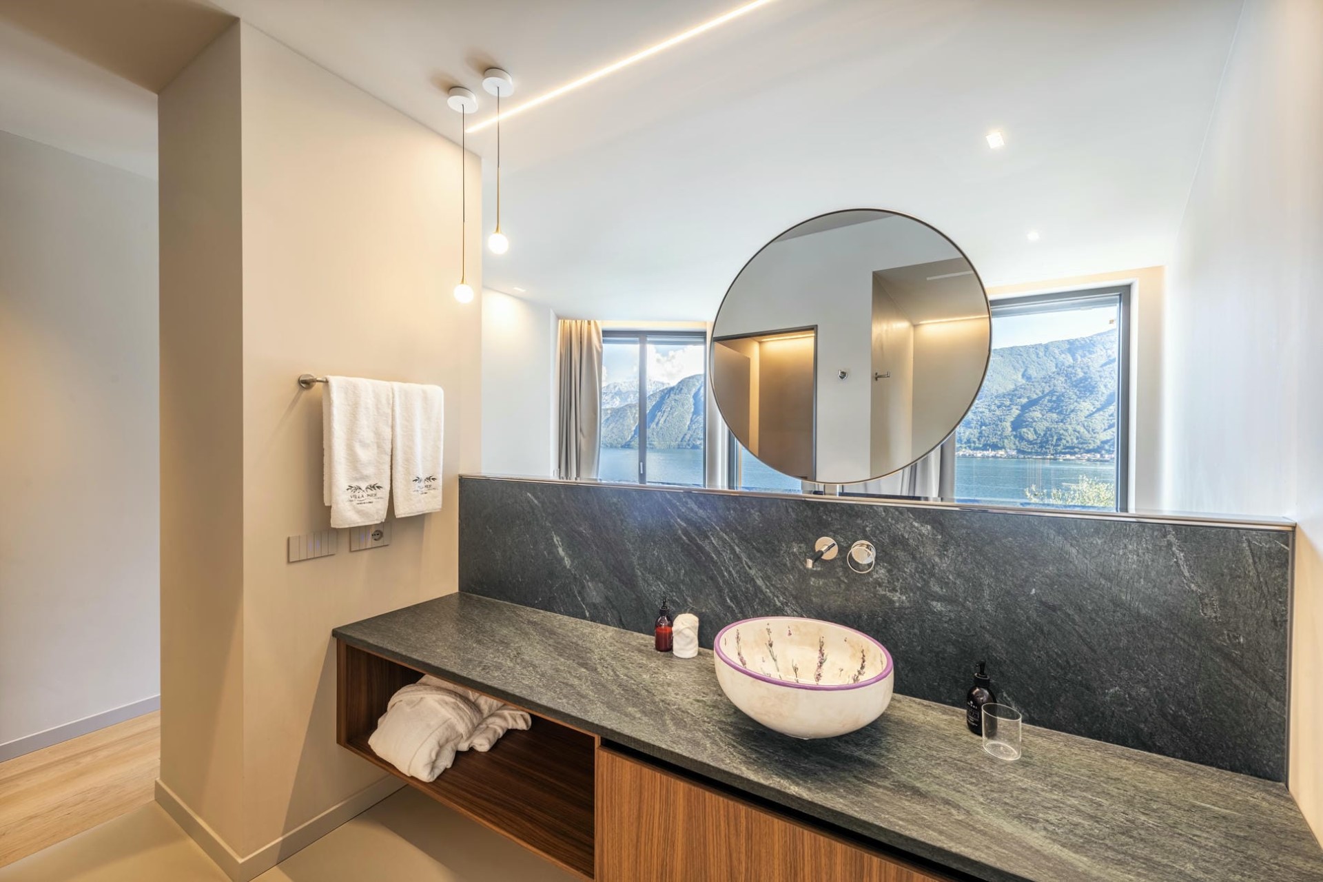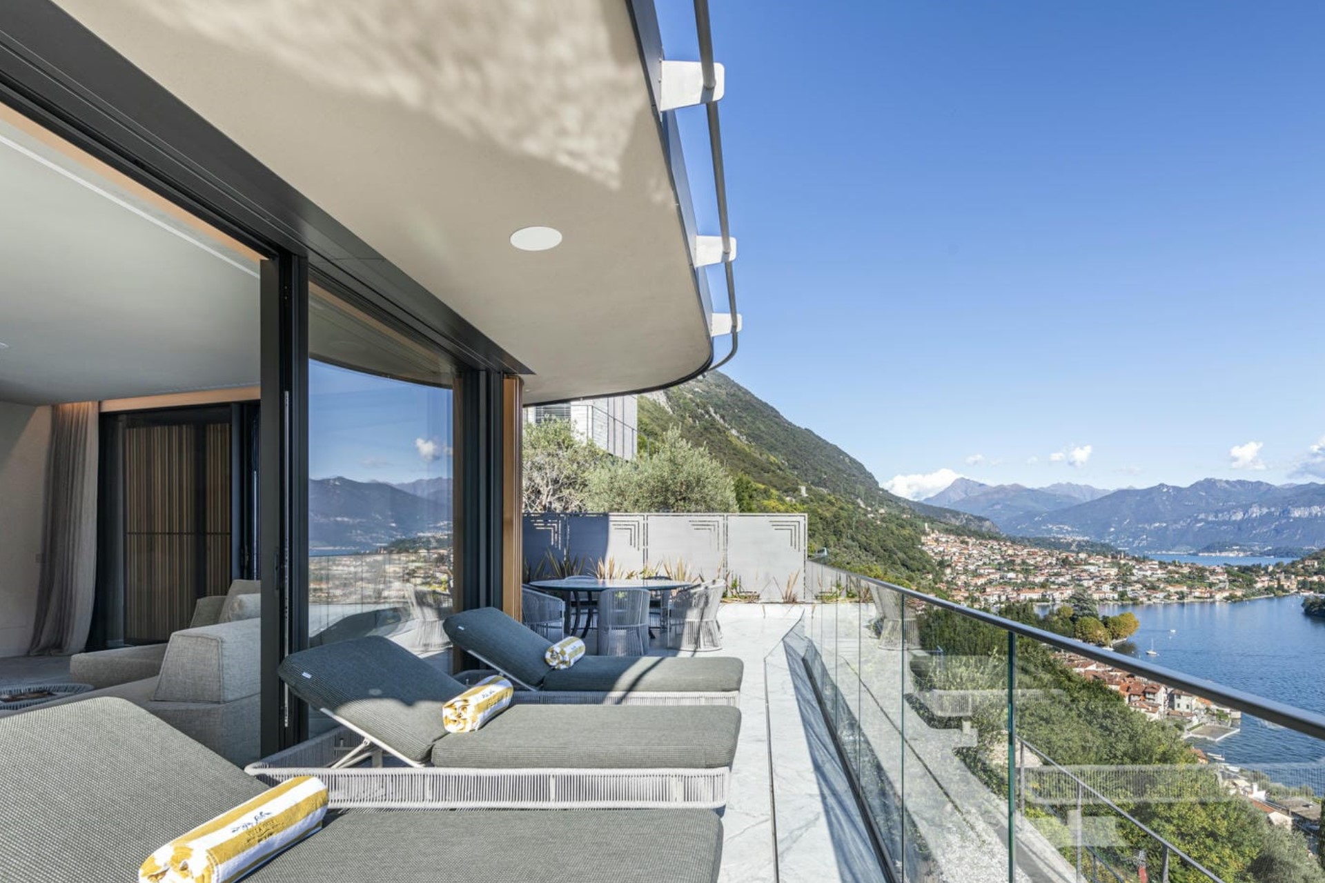 Five king-size bedrooms with en-suites are spread across the villa’s three levels, offering private sanctuaries to retreat to at the end of each day. The top level is home to the master bedroom, which boasts panoramic lake views and a vast private balcony and grassy terrace. The three bedrooms on the ground floor each have access to the main terrace and offer stunning lake views. The fifth bedroom is tucked away on the lower ground floor, offering extra privacy but without lake views, making it best suited to teens or personal staff.