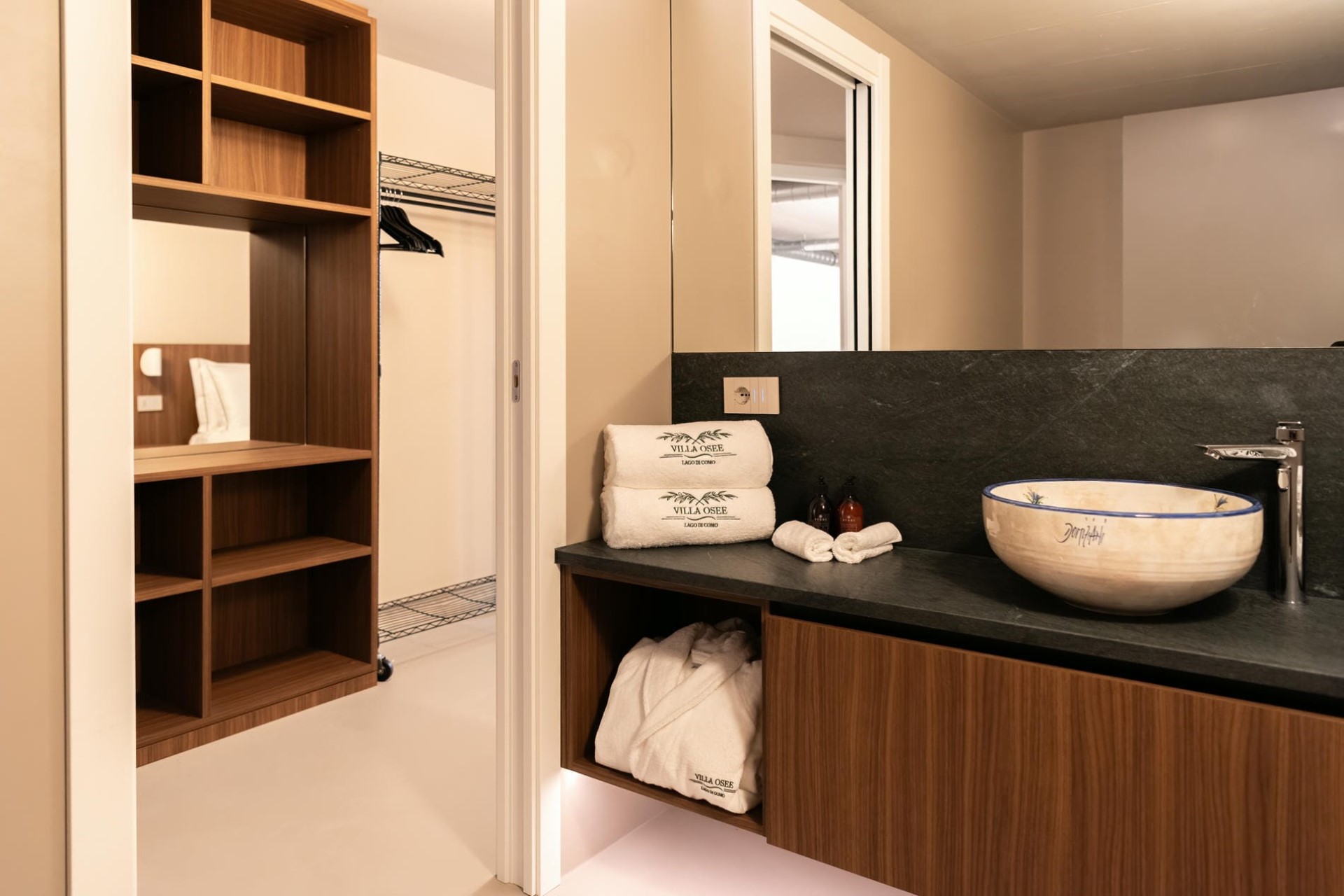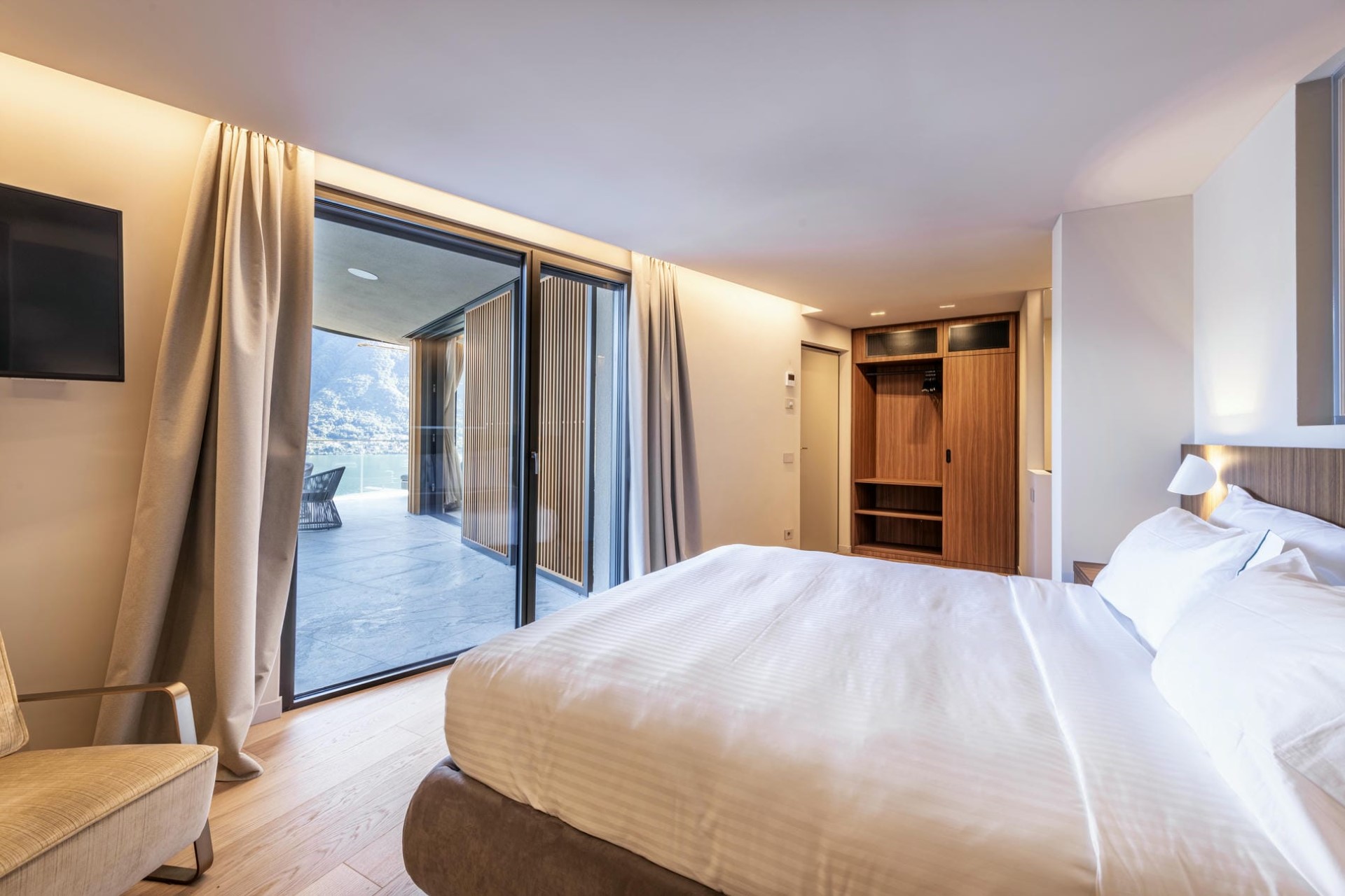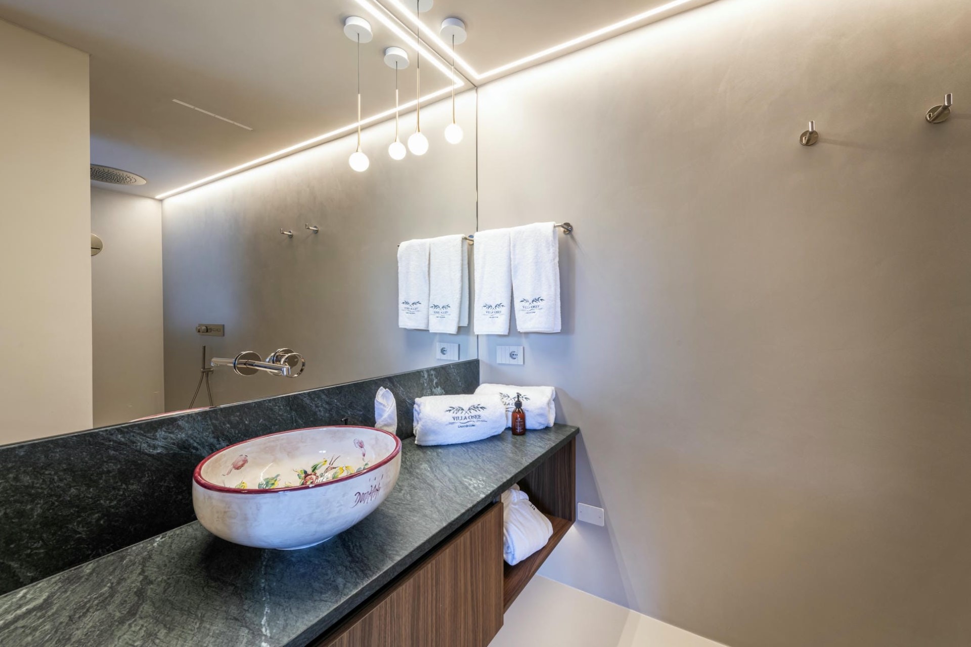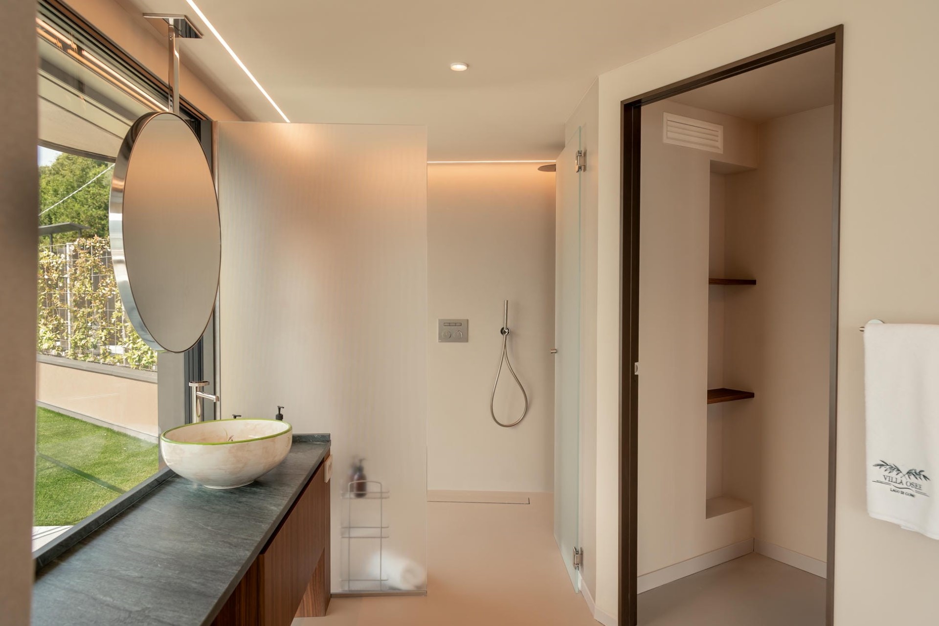 Five king-size bedrooms with en-suites are spread across the villa’s three levels, offering private sanctuaries to retreat to at the end of each day. The top level is home to the master bedroom, which boasts panoramic lake views and a vast private balcony and grassy terrace. The three bedrooms on the ground floor each have access to the main terrace and offer stunning lake views. The fifth bedroom is tucked away on the lower ground floor, offering extra privacy but without lake views, making it best suited to teens or personal staff.