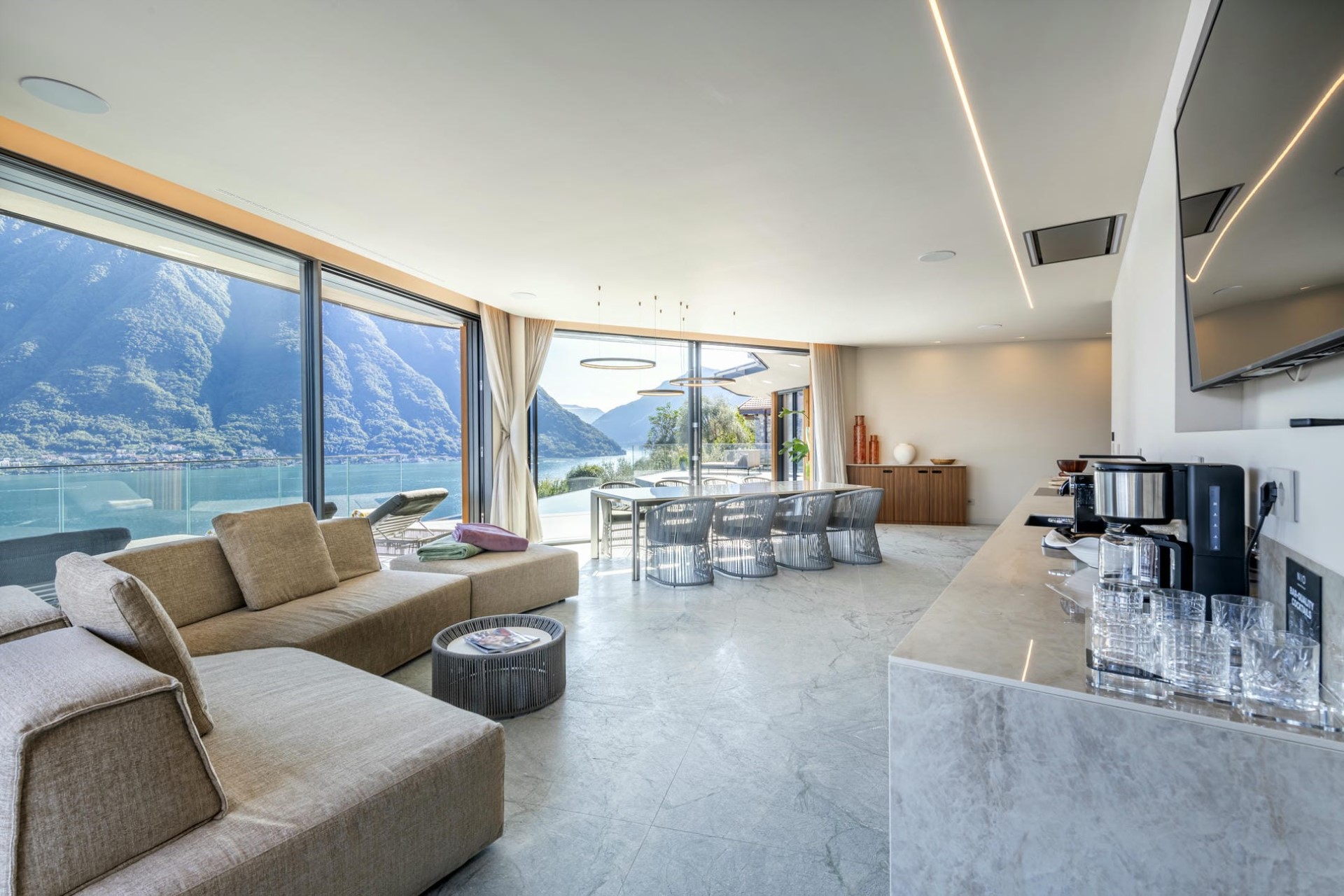 On its sprawling terrace, an infinity pool seamlessly blends with the lake’s horizon, providing a serene and relaxing setting. Beside the pool, a sunken Jacuzzi seating six is the perfect spot to sip a glass of local wine as the sun sets. The terrace also offers plenty of sun loungers and a spacious day bed for lazing beneath blue skies, as well as an outdoor dining table for relaxed al fresco meals.
