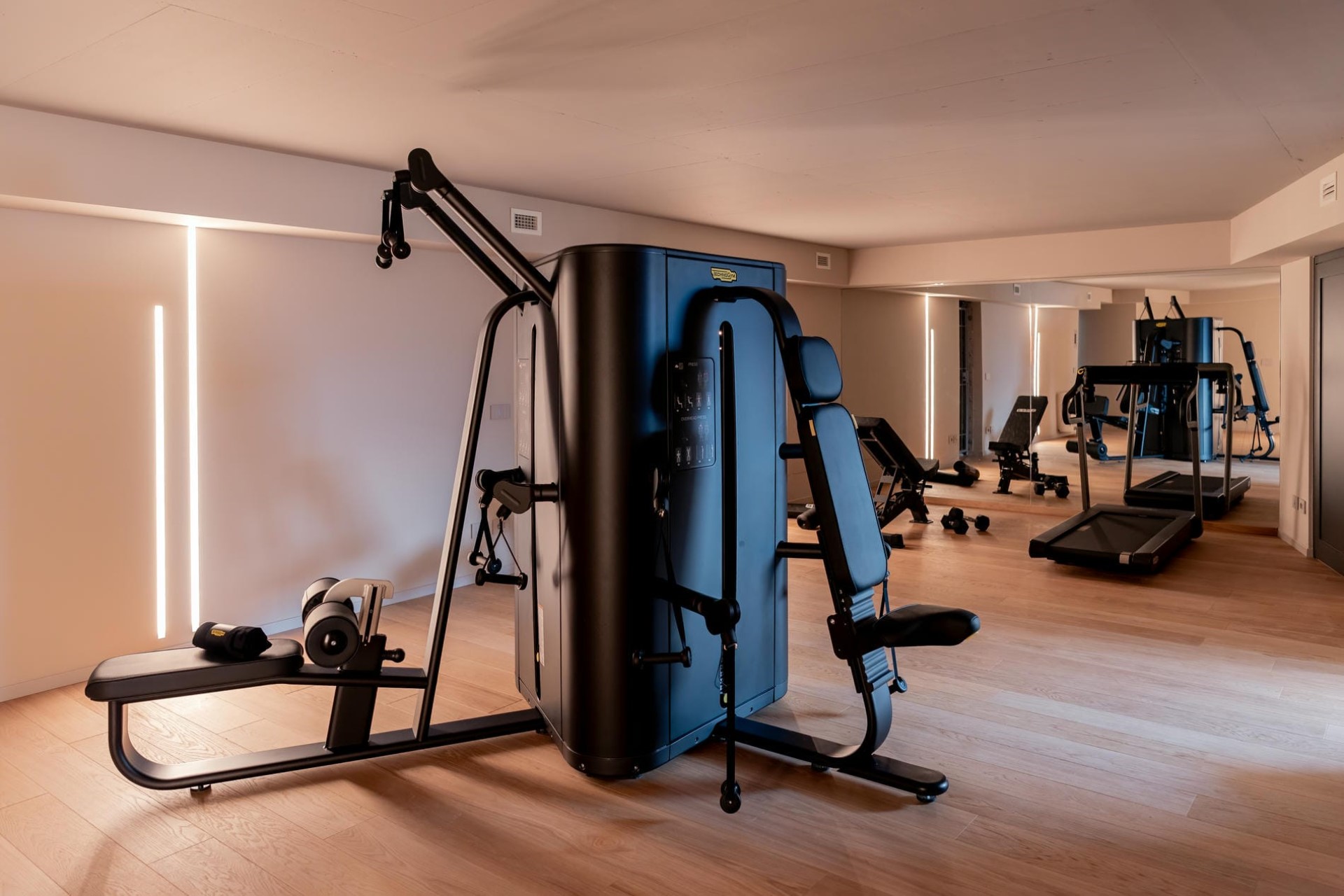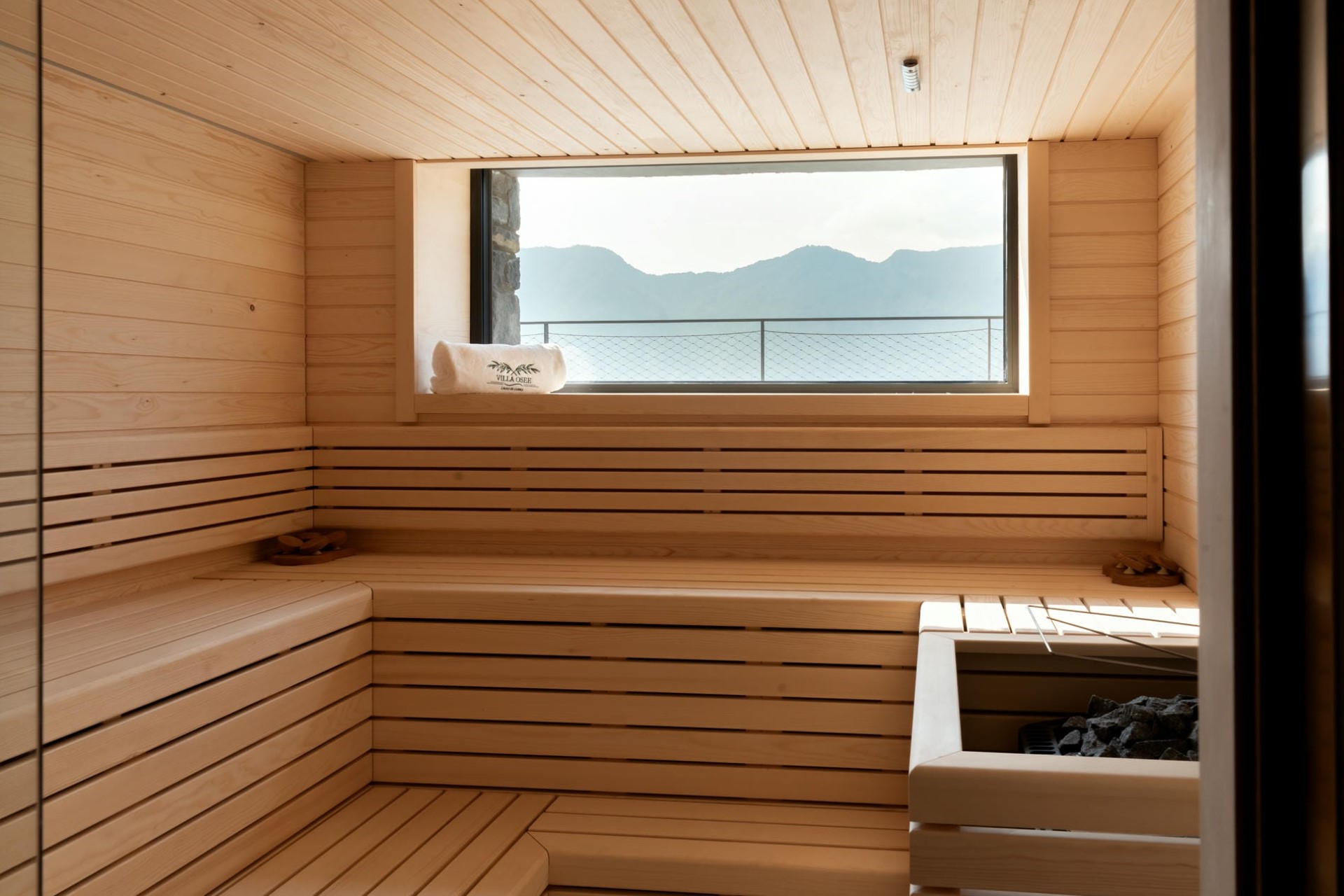 The lower level of the villa is home to its wellness facilities. Guests can work out in the fully equipped gym before winding down in the sauna with a window to the lake beyond.