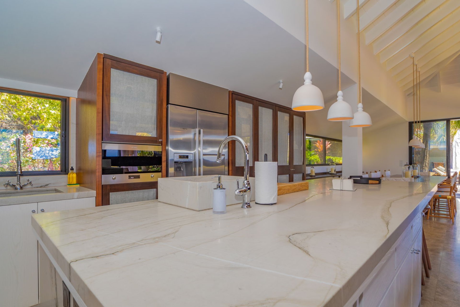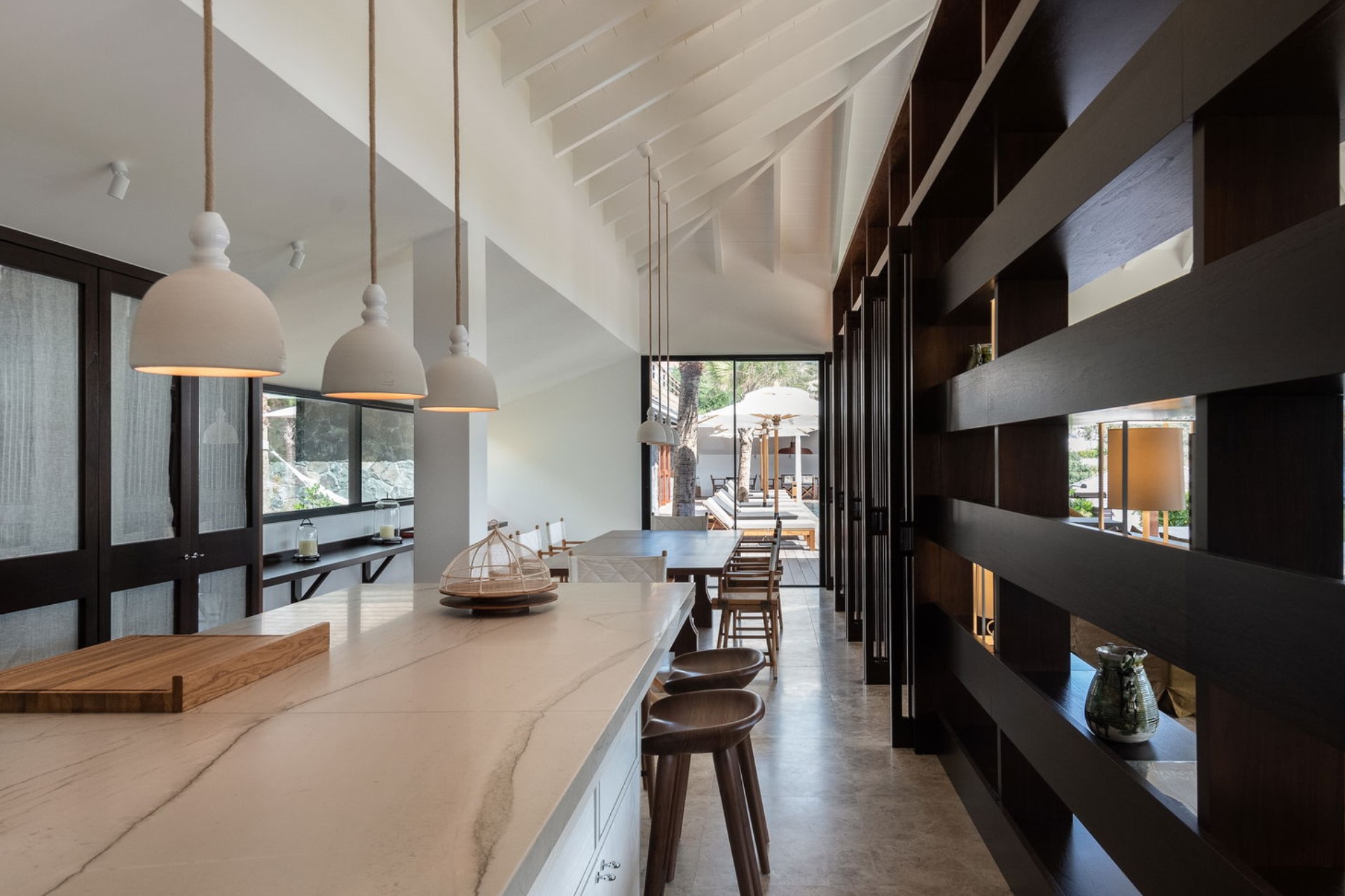 The outdoor terrace is an oasis of relaxation, centred around the heated infinity pool that appears to merge with the horizon. Sun loungers and umbrellas provide the perfect setting for sunbathing, while the surrounding tropical garden enhances the villa’s tranquil atmosphere. A covered alfresco dining area and outdoor lounge offer idyllic spots for enjoying meals and cocktails against the backdrop of the ocean.
