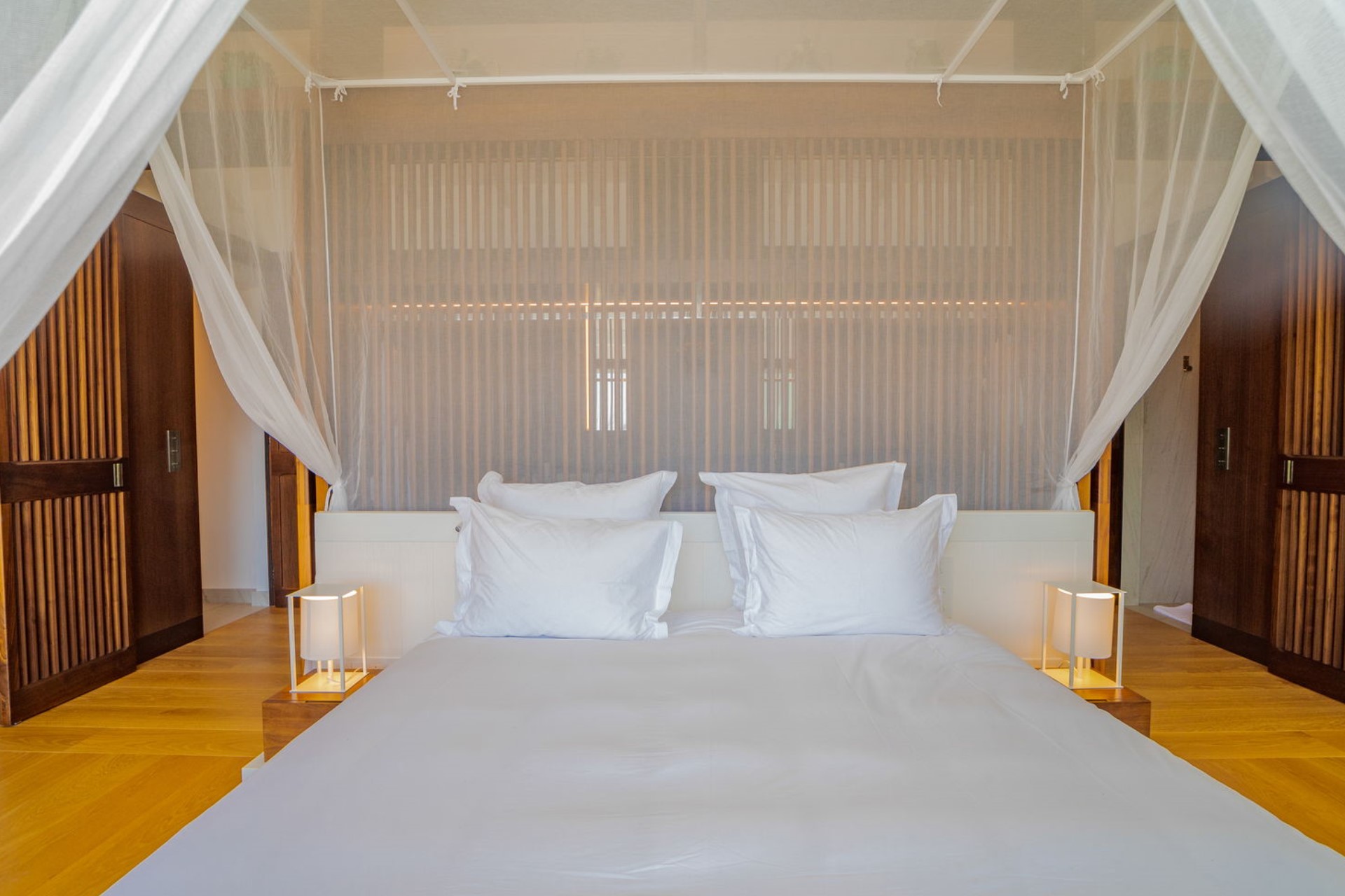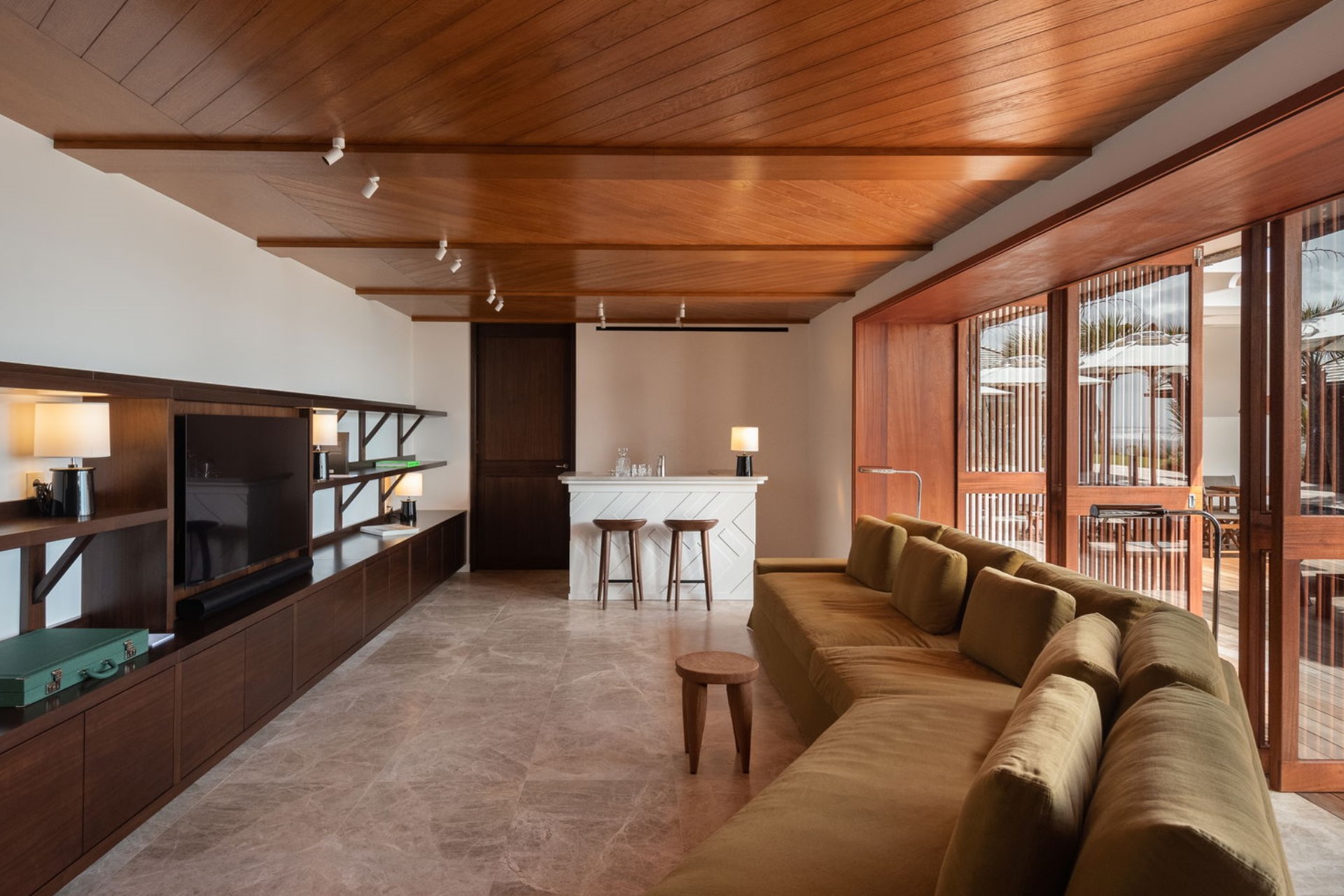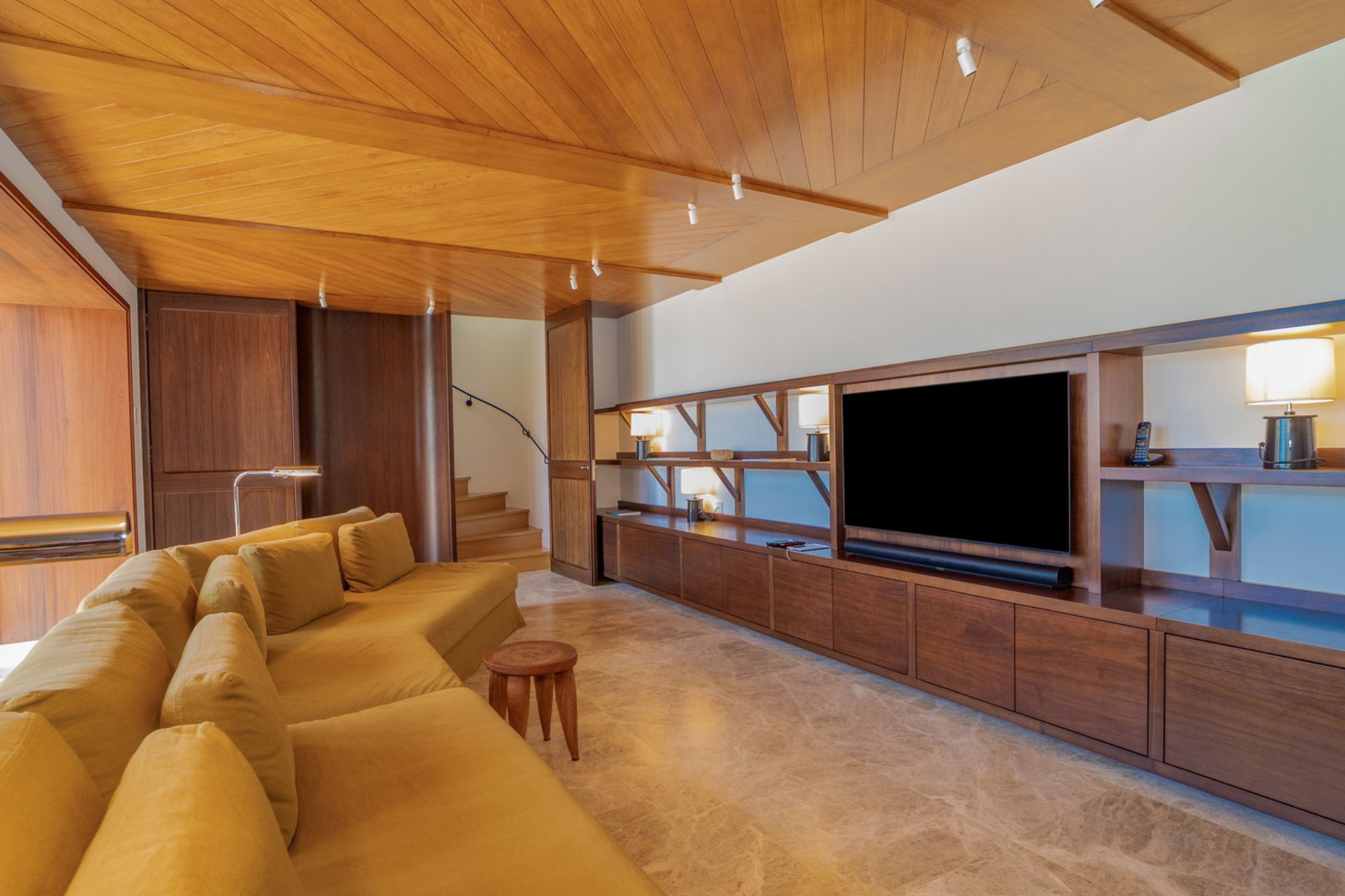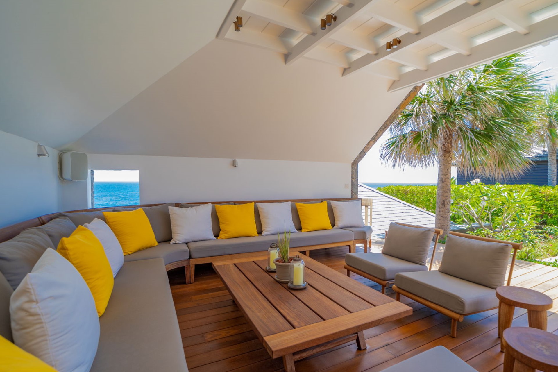 Each of the four air-conditioned bedrooms is thoughtfully appointed with king-size beds, en-suite bathrooms, and ocean views. One bedroom is situated on the upper level, boasting a private balcony, while the remaining three are located on the main level across separate buildings, each with direct access to the terrace or garden. The villa also includes a dedicated television room, providing a cosy space for entertainment.